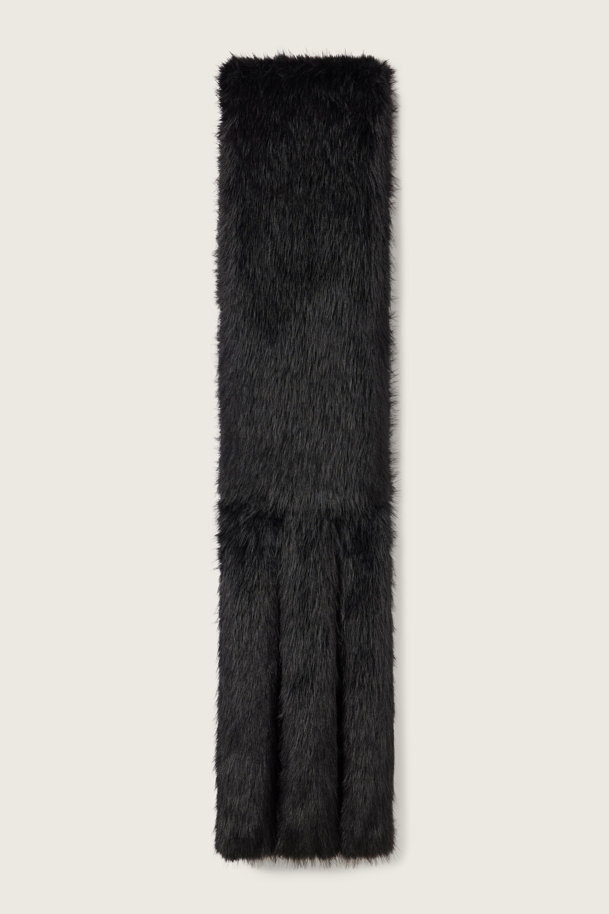 This faux fur scarf is made from a plush faux fur that features tassel like slits at the end - the perfect accessory to drape over a dress or coat as a shawl.