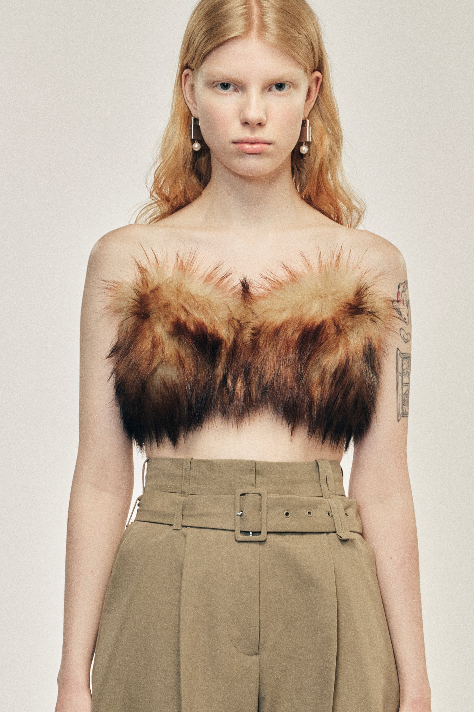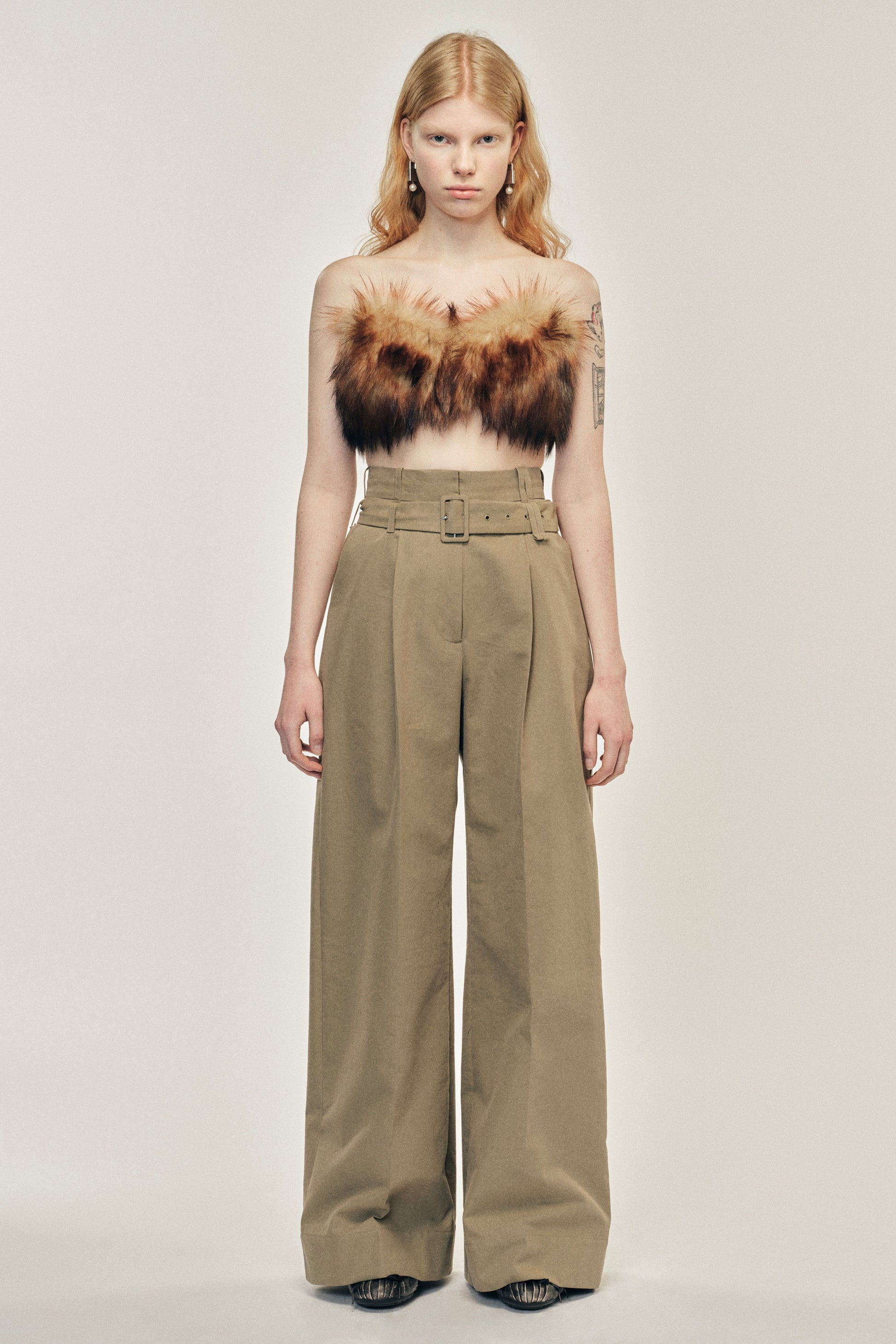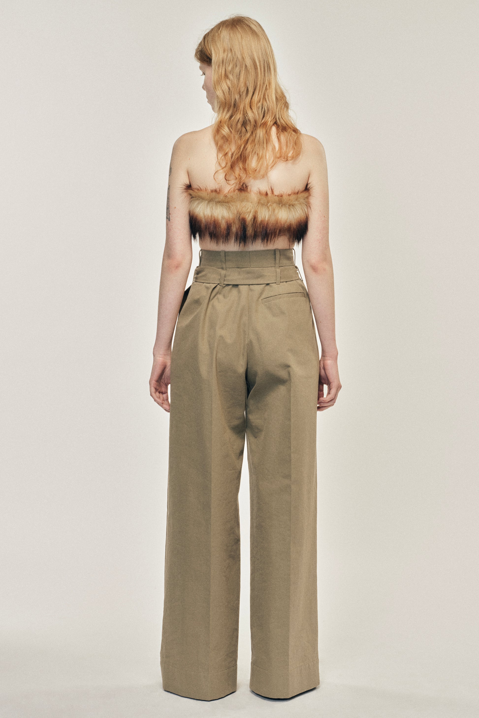 Trench canvas trousers featuring the seasonal double belt loop detail, it features a self belt at the second belt loop for an exaggerated high waisted fit. The model is wearing this style with the Faux Fur Bandeau.