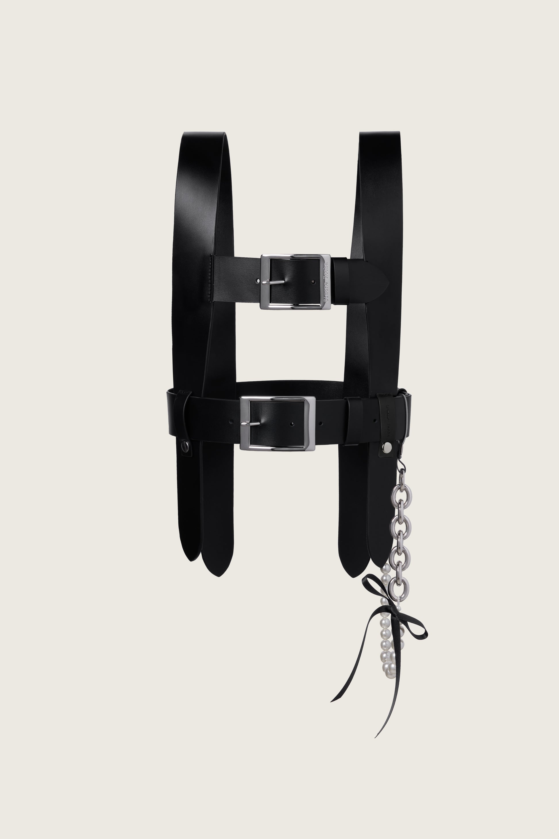 A leather harness featuring branded silver tone buckles and a removable pearl and chain detail on the side, the perfect accessory to layer over a sheer dress.