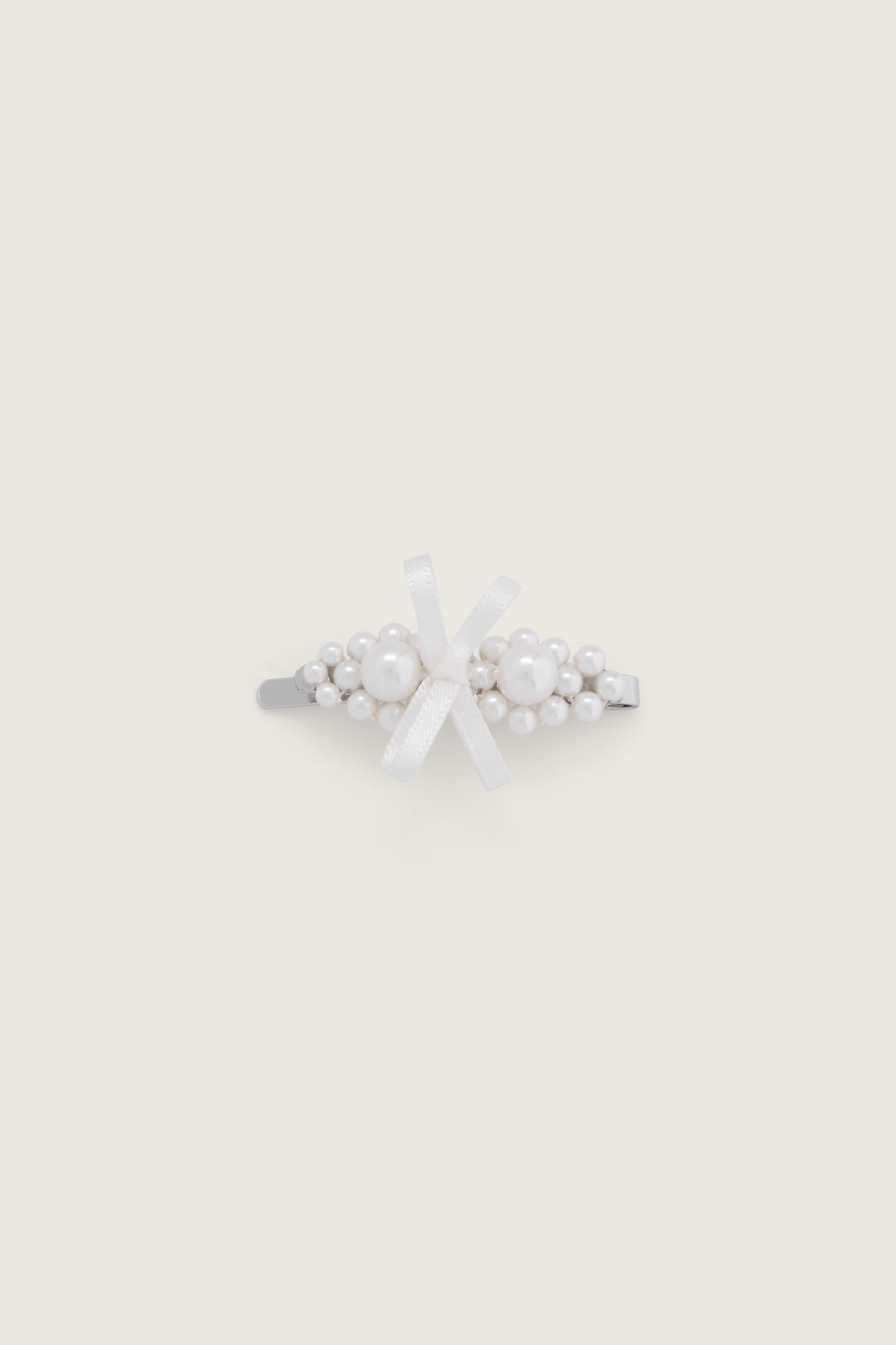 Simone Rocha’s classic mini pearl hair clip is playfully updated with a petite bow.