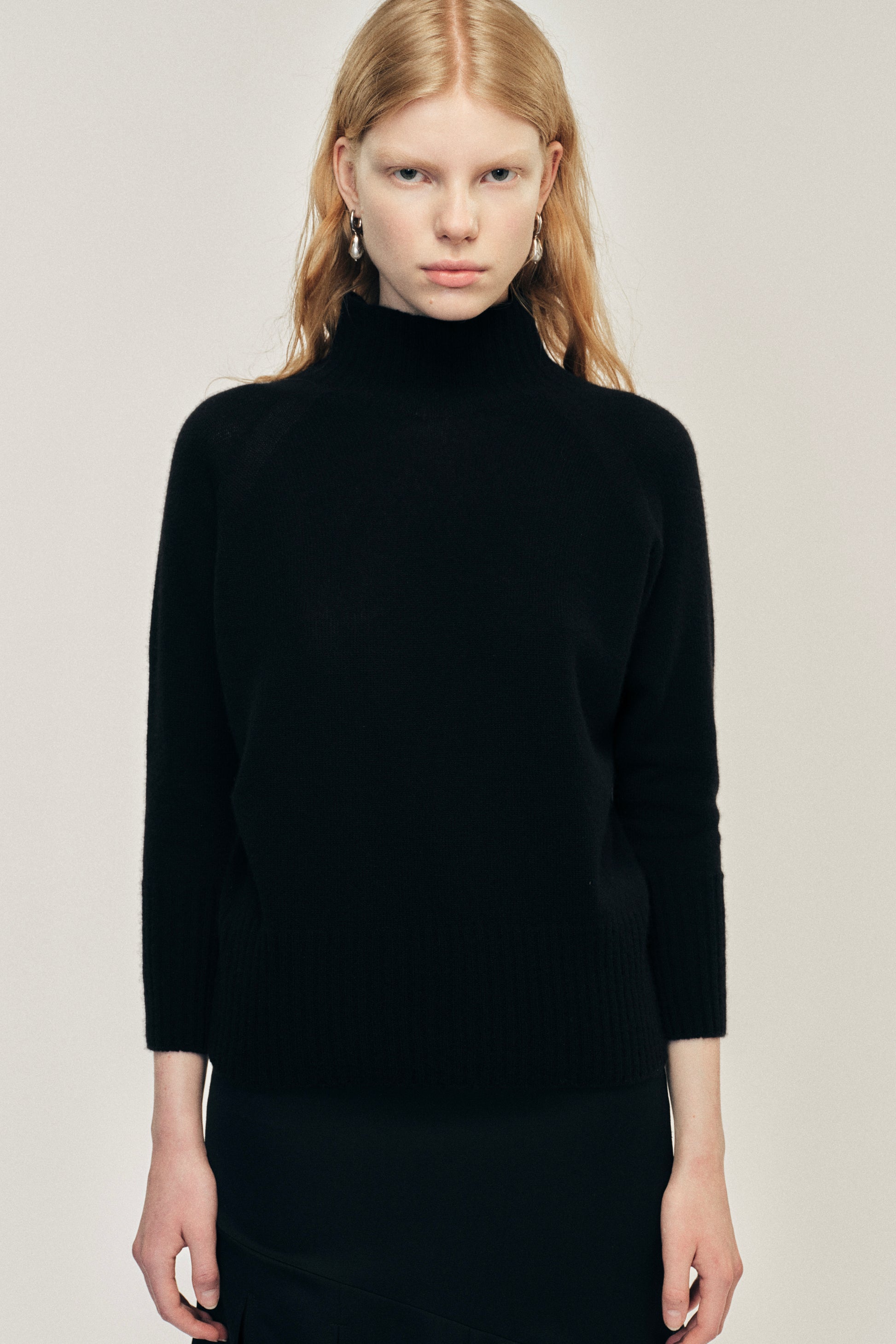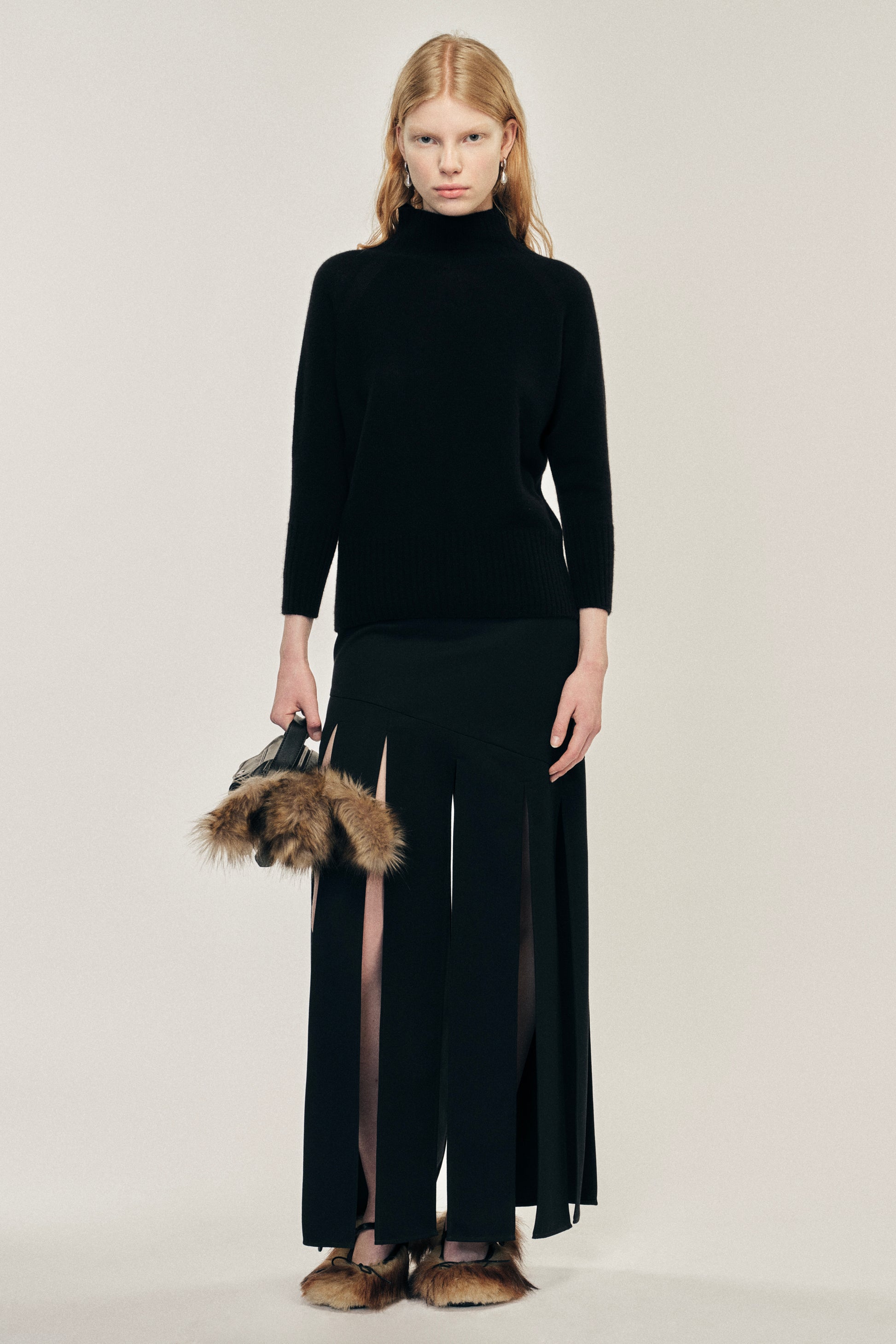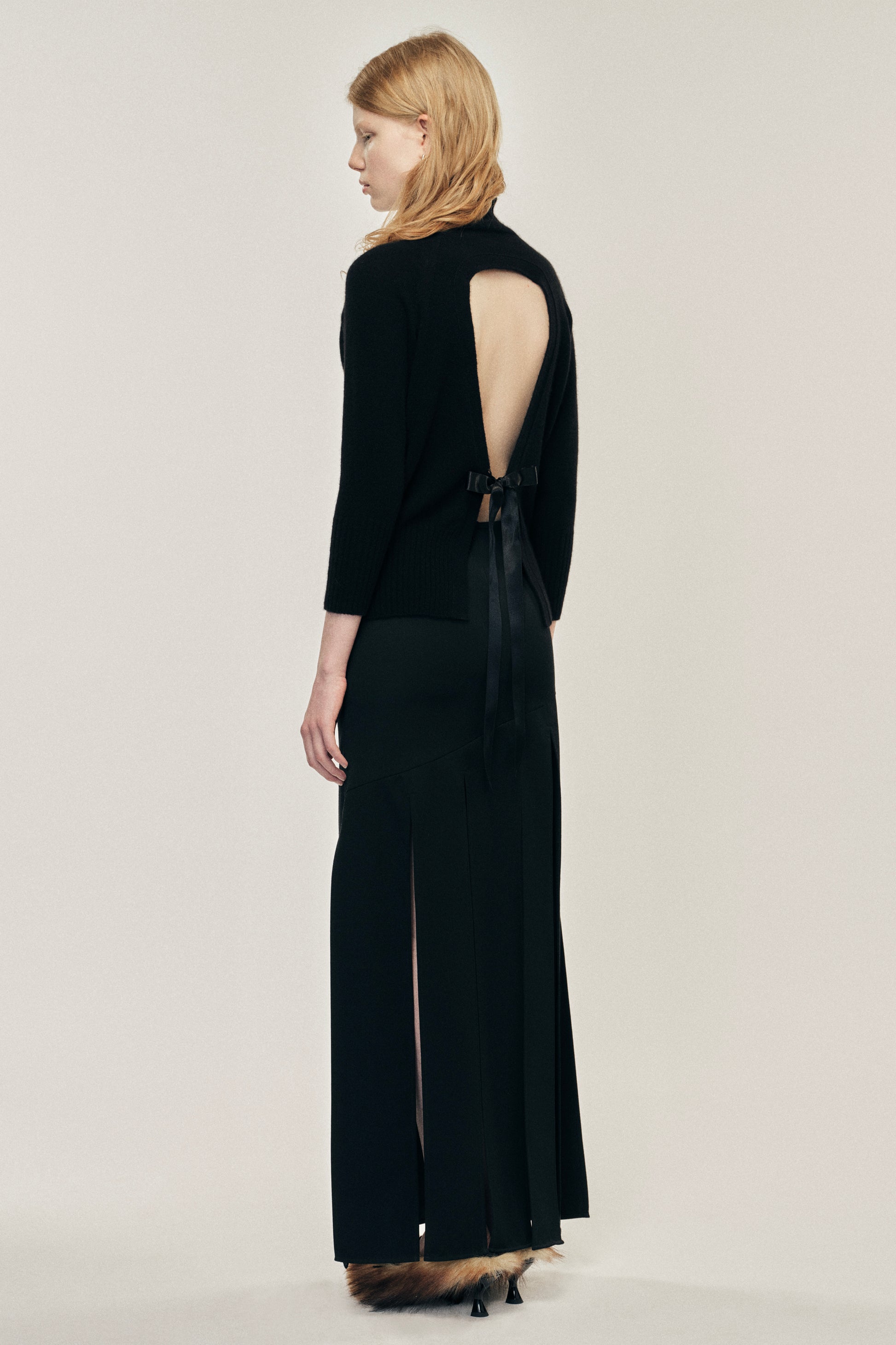 A high neck jumper in a new cashmere yarn, it features a cut out in the back that with a ribbon bow detail. The model is wearing this style with the Bias Cut Multi Slit Skirt.