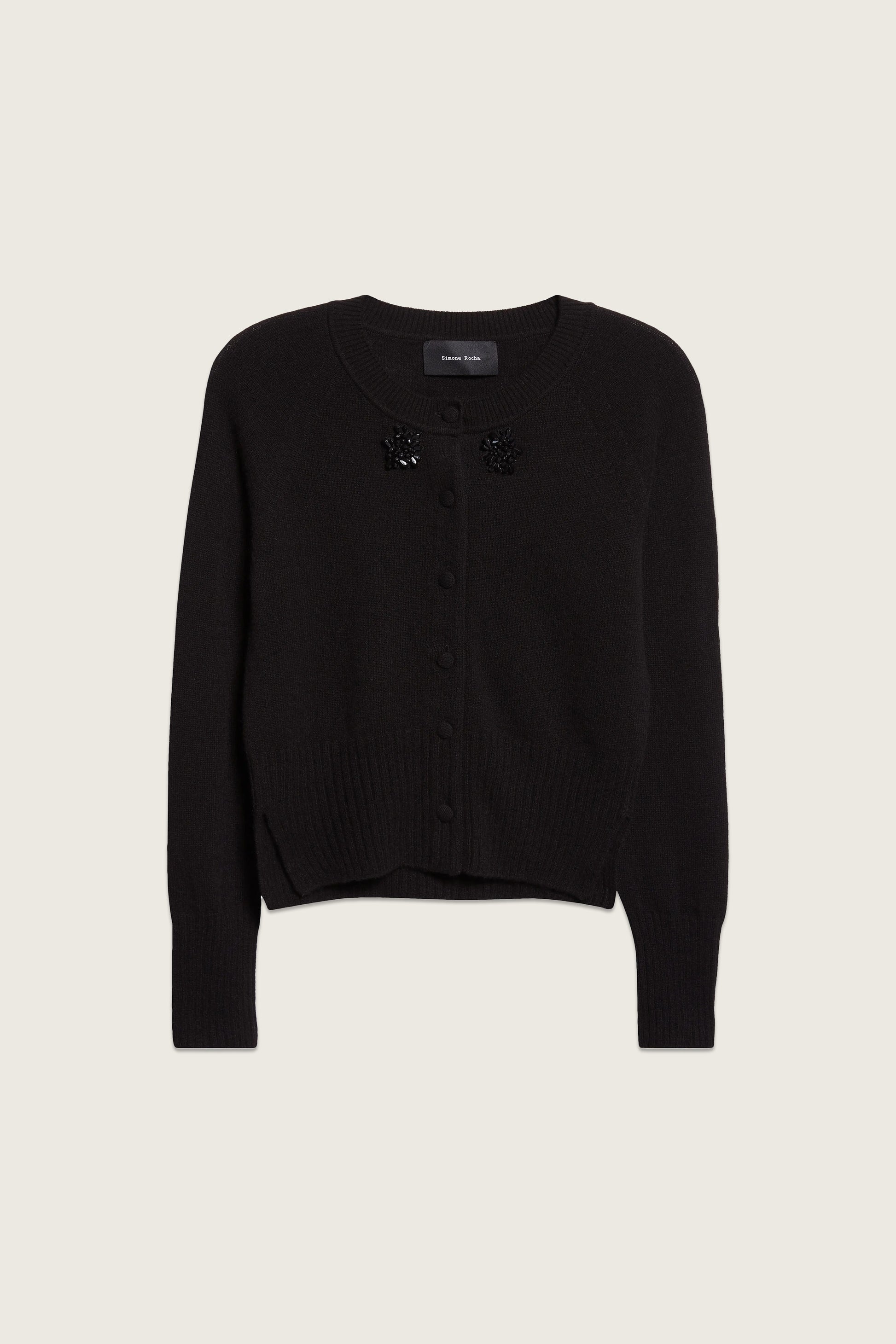 A subtly cropped cardigan knit from a new cashmere yarn, seasonal black crystal cluster embellishments are featured at the front. The model is wearing this style with the Multi Slit Skirt.