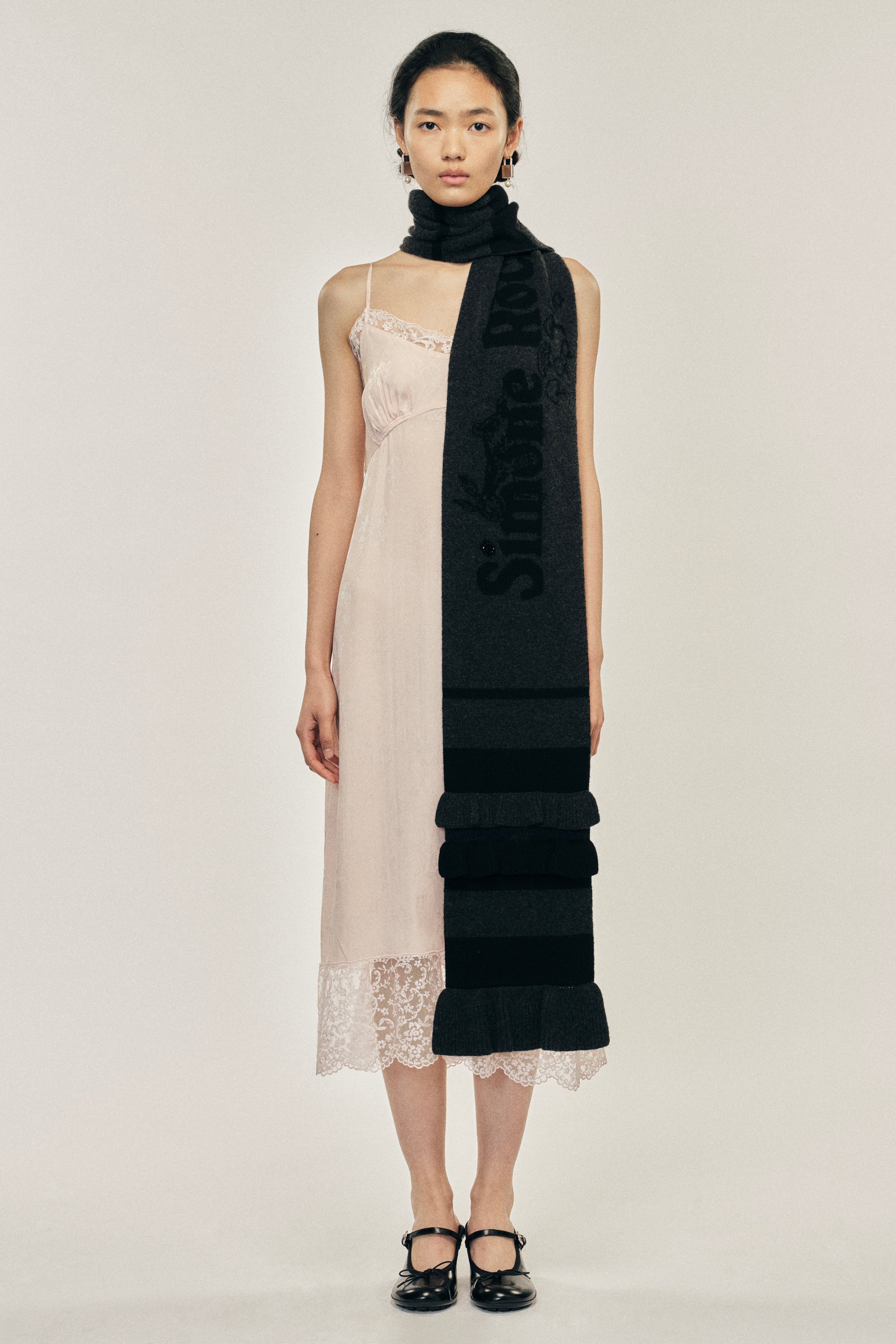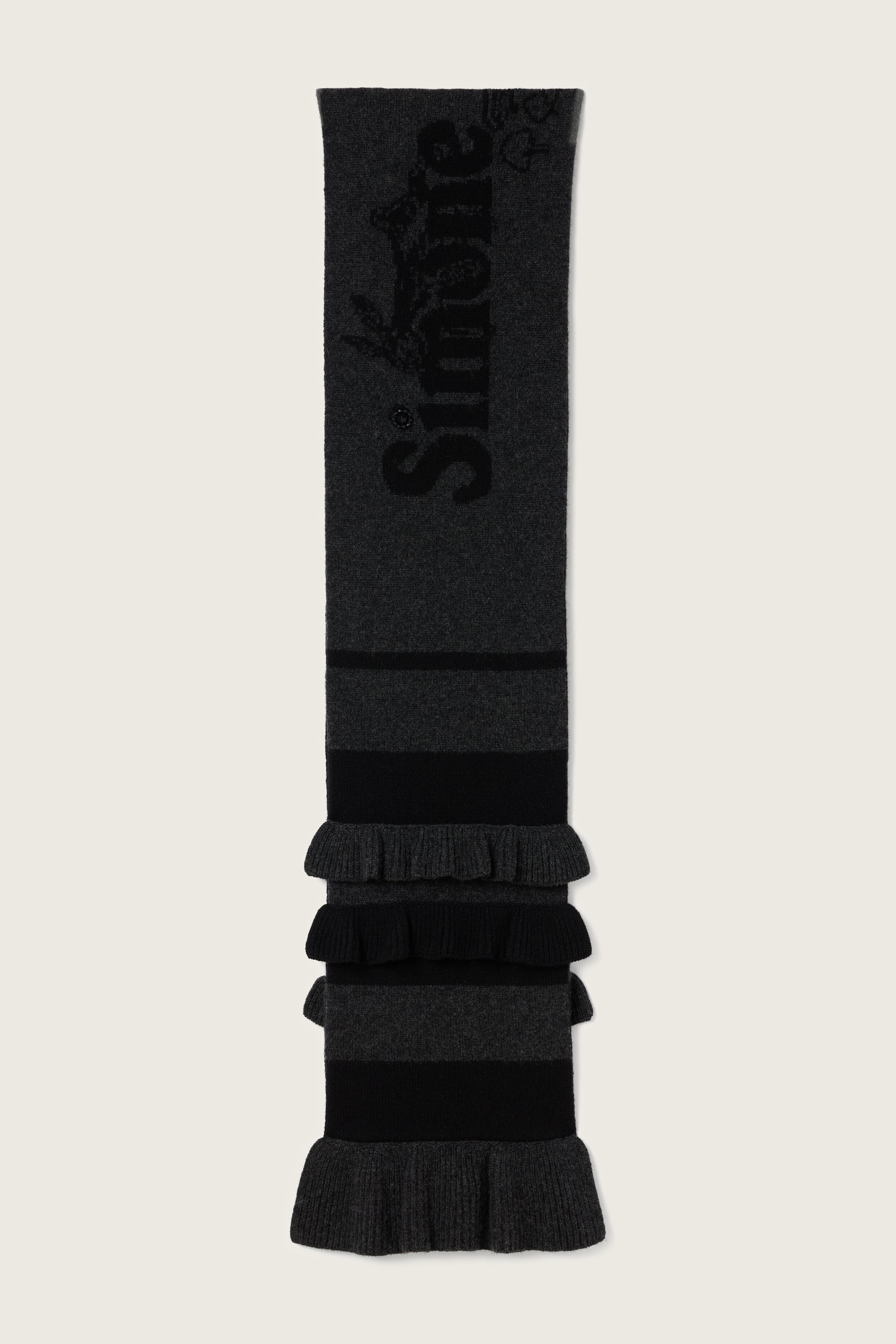 A merino wool and cashmere blend scarf featuring the Simone Rocha logo reinterpreted by artist Oscar Torrans. This multi-toned style also has the brand's signature ruffle detail throughout and a daisy embellishment.