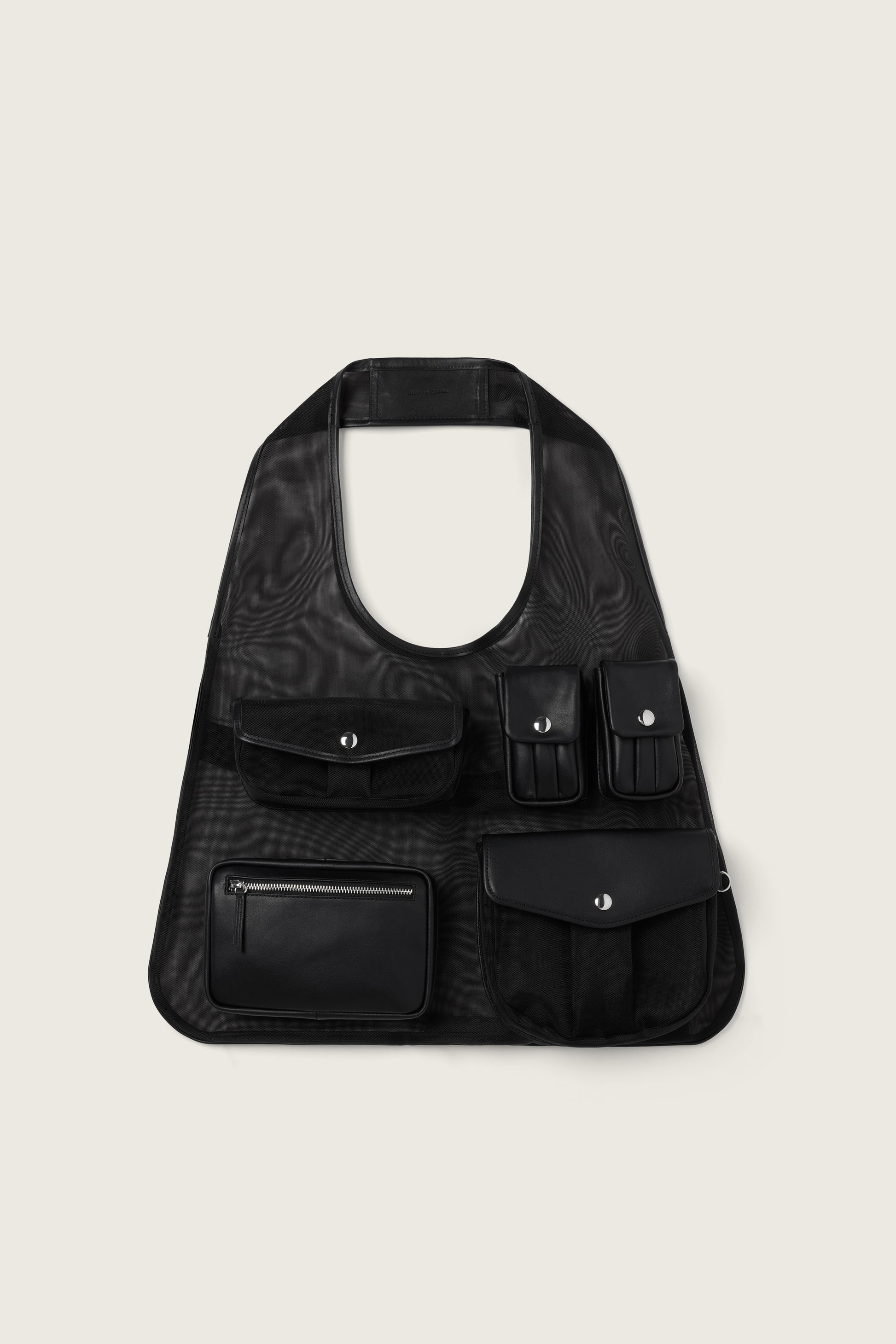 This black mesh tote bag has a distinctive tactical-inspired design, it features a U-shaped handle at the top which can be worn as a vest and secured with a buckle fastener.