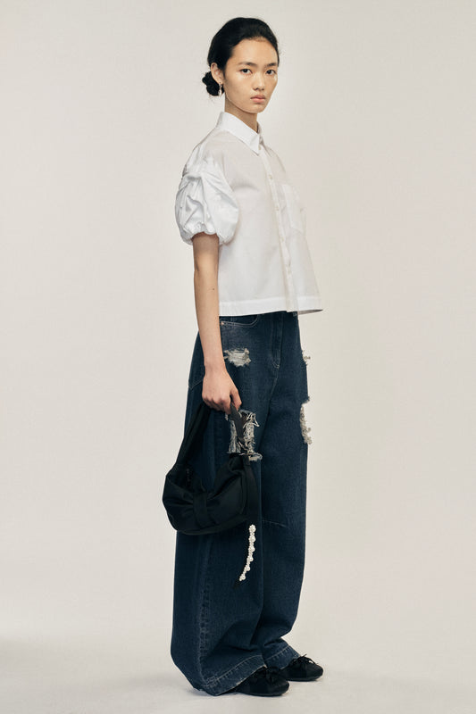 Cropped Bow Puff Sleeve Shirt