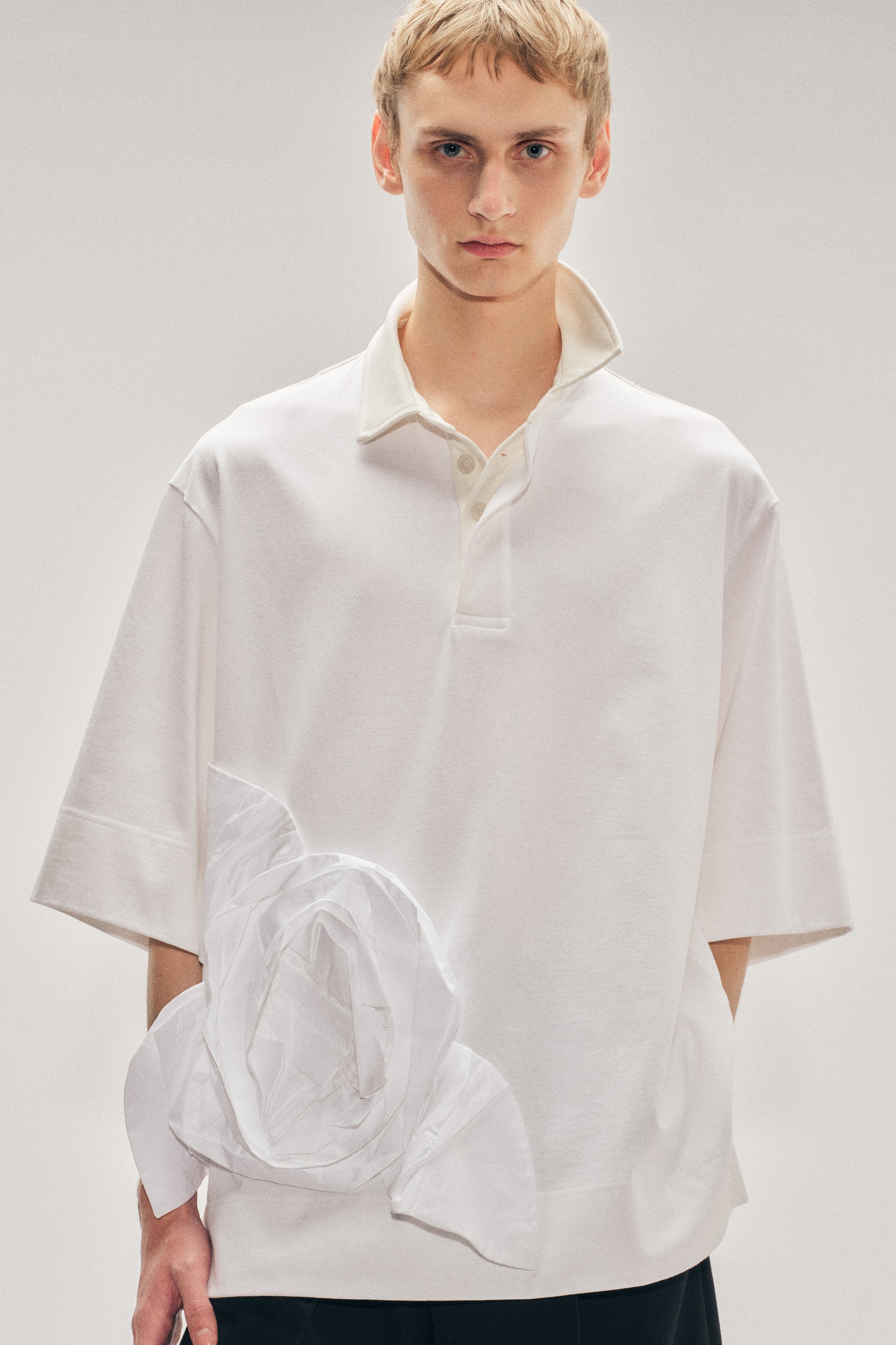 Oversized rugby top in structured jersey with a classic polo neckline, finished with a sculpted pressed rosette making a standout statement at the waist.
