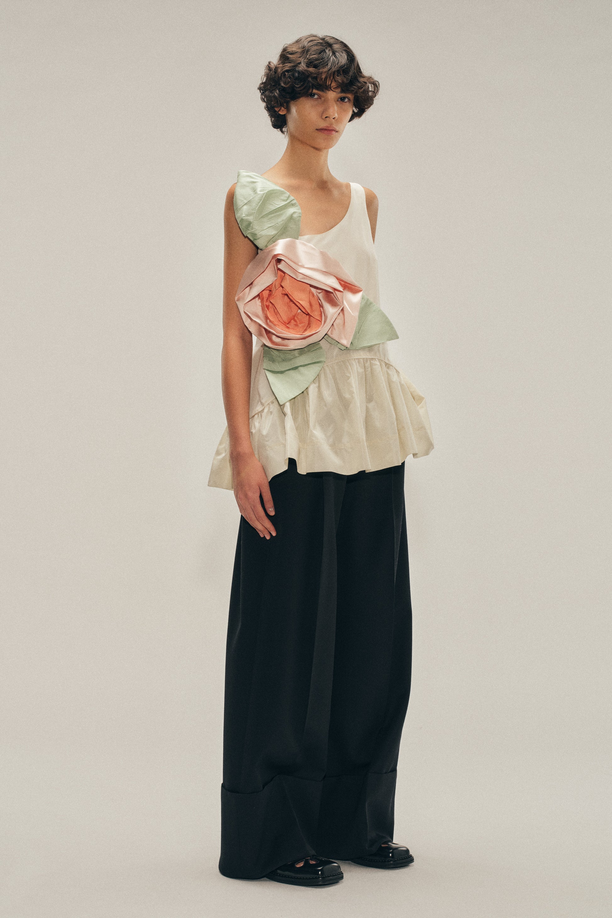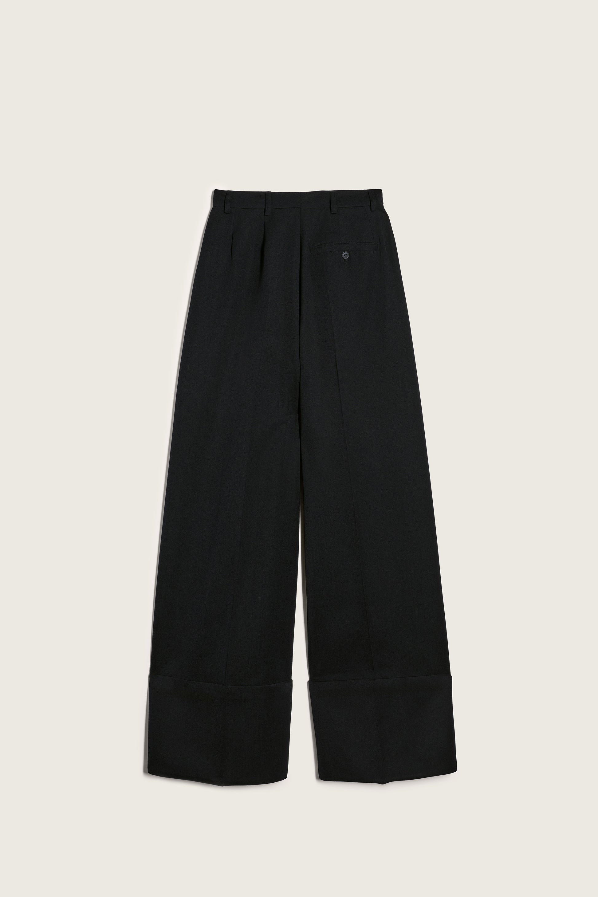 Wide-leg tailored trousers in Venetian wool blend, finished with large turn-up hems and a belt loop with buttoned daisy pearl tab.