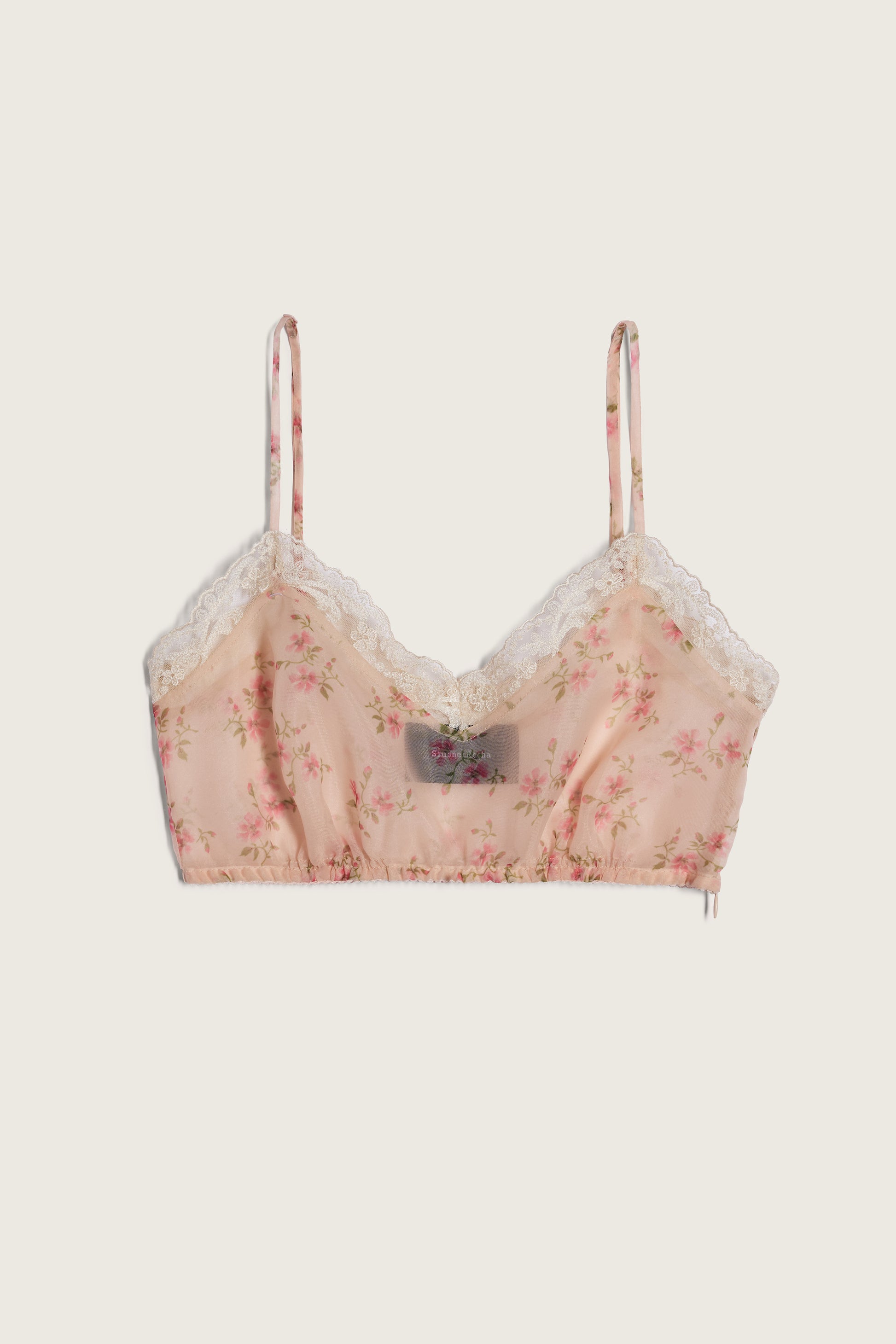 This bralette is made from a seasonal floral printed organza, it features an adjustable strap and a side zipper. The cropped hem is elasticated for a more comfortable fit.