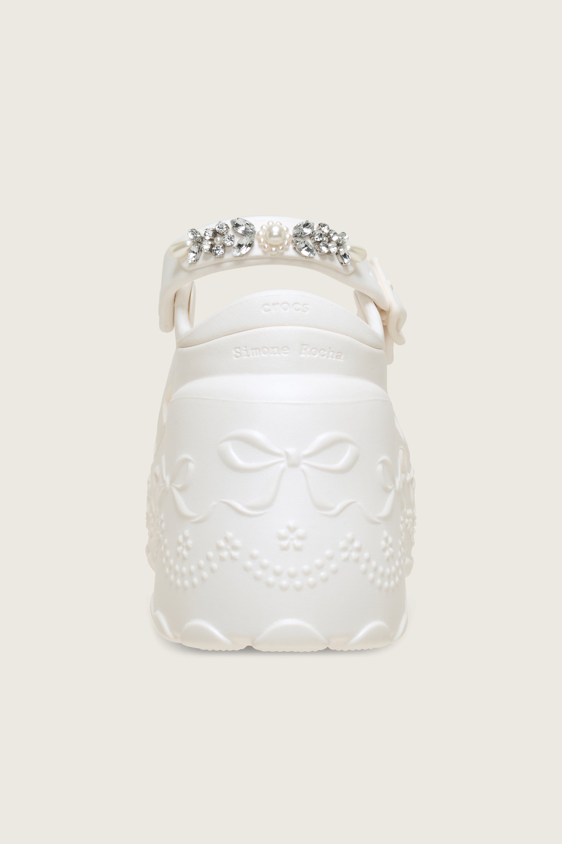Simone Rocha x Crocs explores the creative juxtaposition of femininity and utilitarianism to bring to life new designs that marry Crocs’ iconic brand DNA with the Simone Rocha aesthetic. The Ballerina Platform is a brand-new silhouette is exclusive to this collection with beautiful, ribboned details you won’t find anywhere else. The embossed bows wrap the heel and stamp the sole, creating a unique tread mark. This timeless silhouette is elevated by a platform heel and features an adjustable ankle strap for support and style.