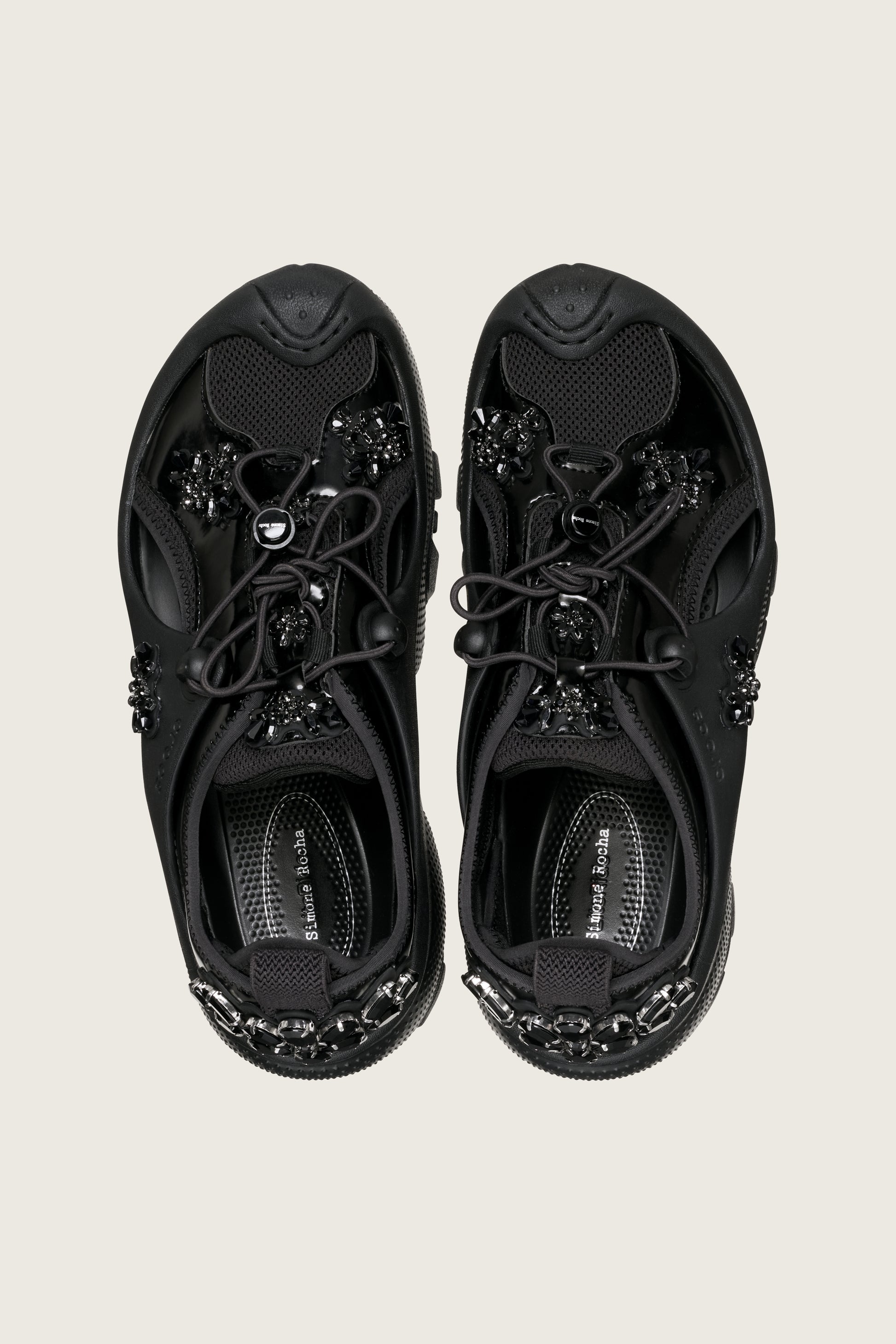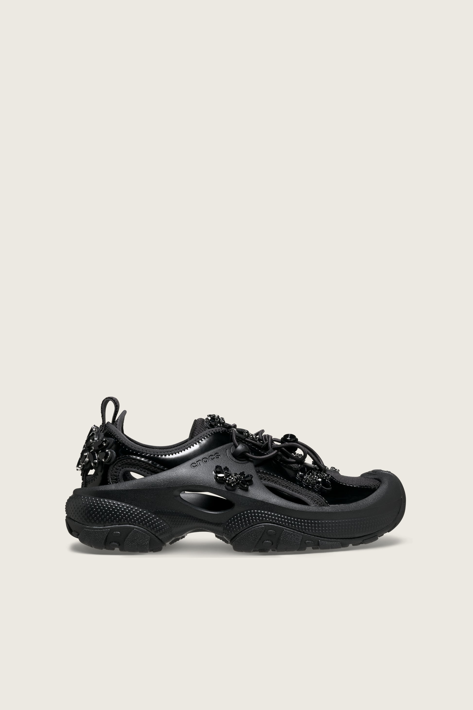 Simone Rocha x Crocs explores the creative juxtaposition of femininity and utilitarianism to bring to life new designs that marry Crocs’ iconic brand DNA with the Simone Rocha aesthetic. The eye-catching architecture of the Trailbreak finds new adornment with Simone Rocha’s signature embellishments. This Simone Rocha x Crocs exclusive silhouette melds the rugged functionality of the Trailbreak with a touch of opulence, crafting a look that is undeniably high fashion. Two classic colourways, Black and Oyster, give this style versatility for everyday or elevated wear.