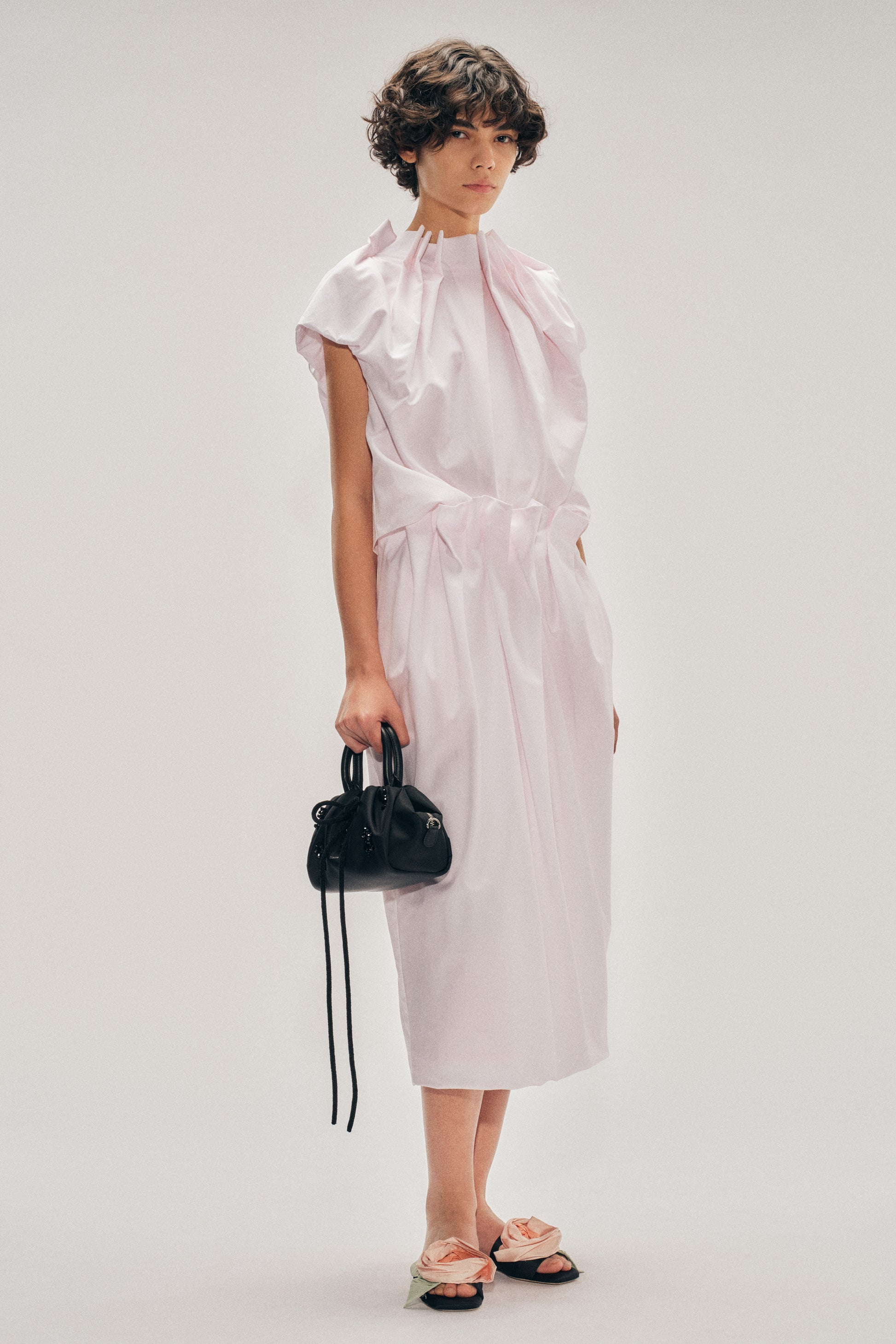 A classic pencil skirt reinterpreted with a structured silhouette. Pleating at the waist resemble flower petals, adding a touch of femininity. It features a vent on the back seam.