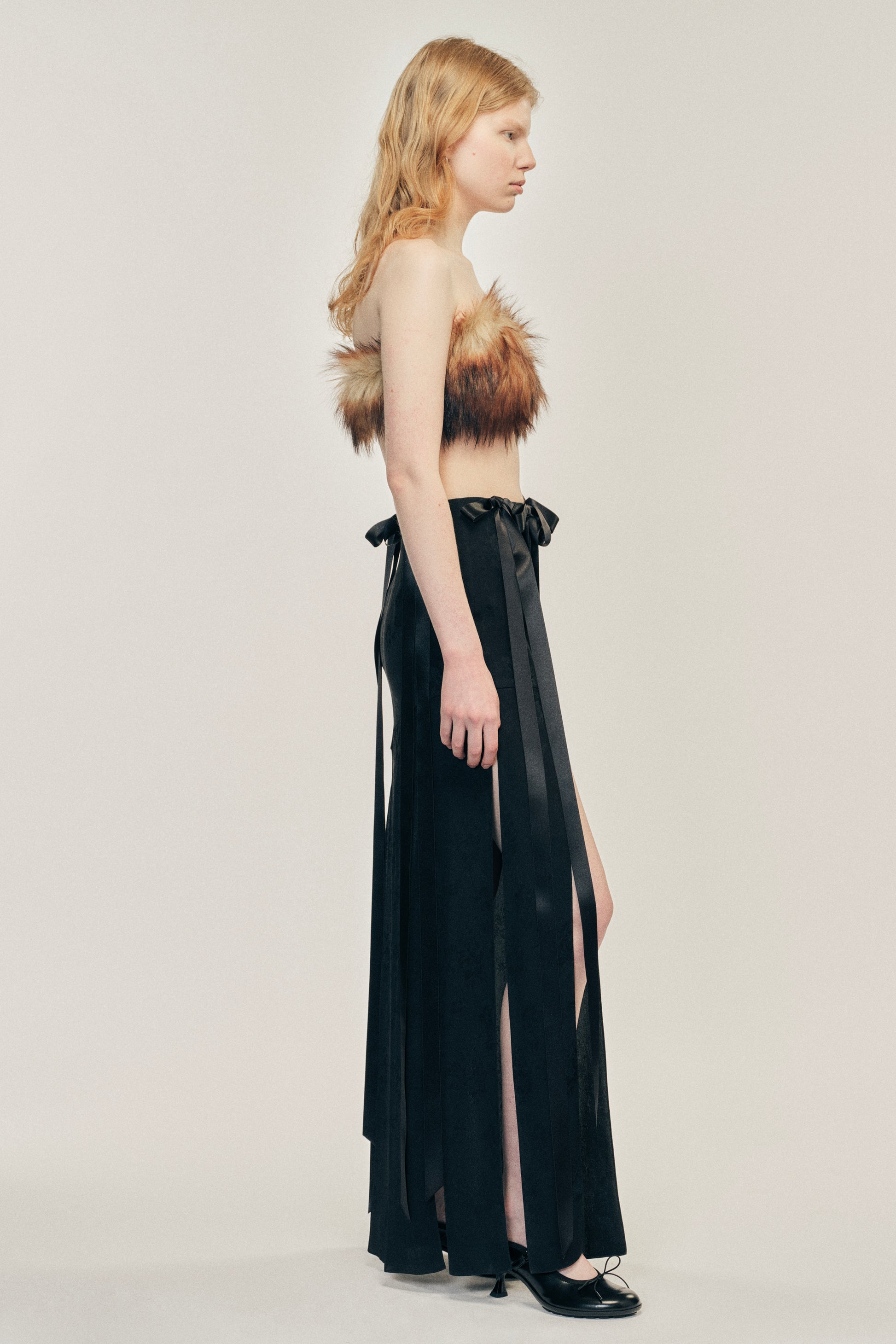 The tonal floral jacquard skirt features long bows along the waist as ornaments, multiple panels make up the skirt resembling loose ribbons cascading down.The model is wearing this style with the Faux Fur Bandeau.