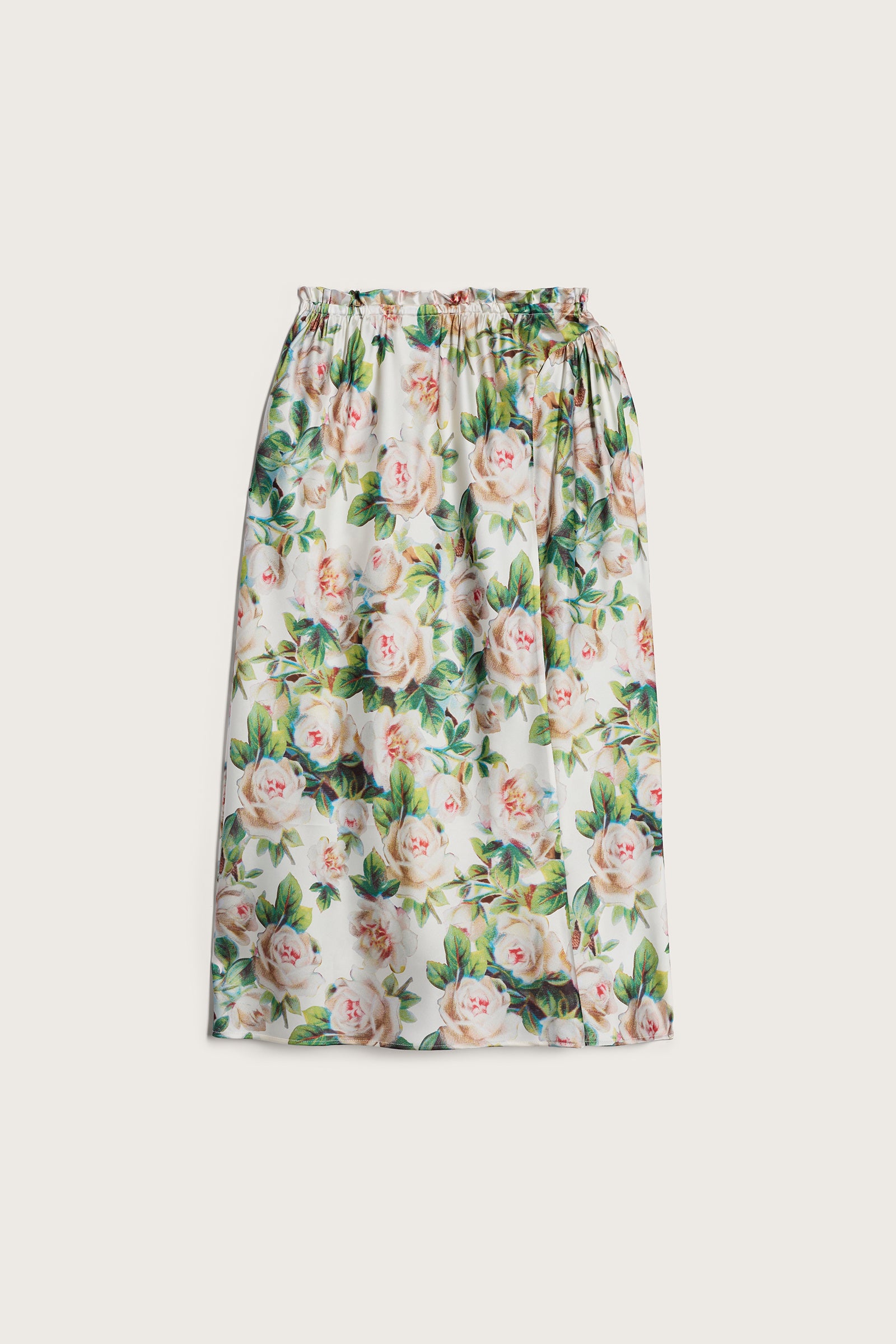 An easy silky elasticated waist skirt with a asymmetrical hip detail at one side, a nod to a subtle historical reference to hip pads.