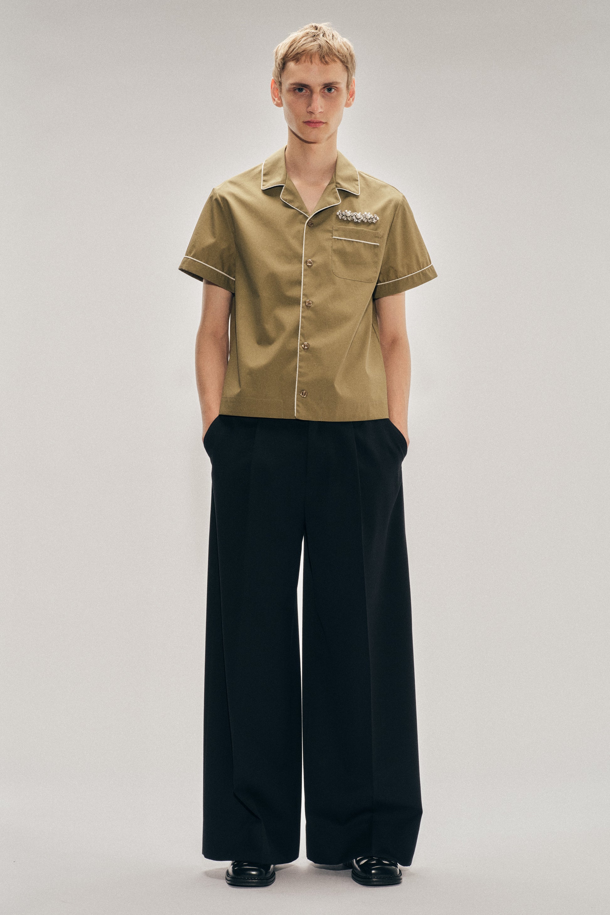 Classic tailored trousers in a Venetian wool blend, cut with a wide pleated leg. The belt loop features a buttoned tab with daisy pearl embellishment.