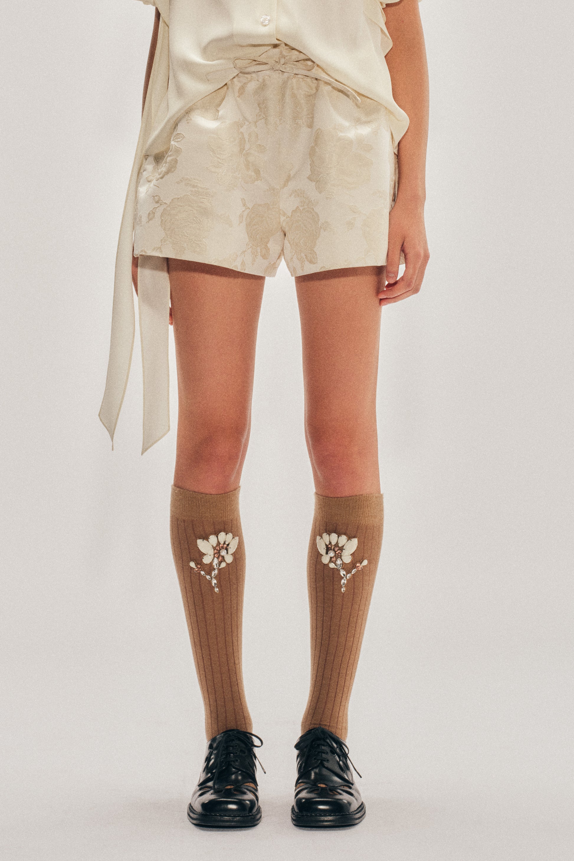 Elasticated shorts in a rose satin brocade fabrication, its silhouette is made for an easy fit with an adjustable drawstring.
