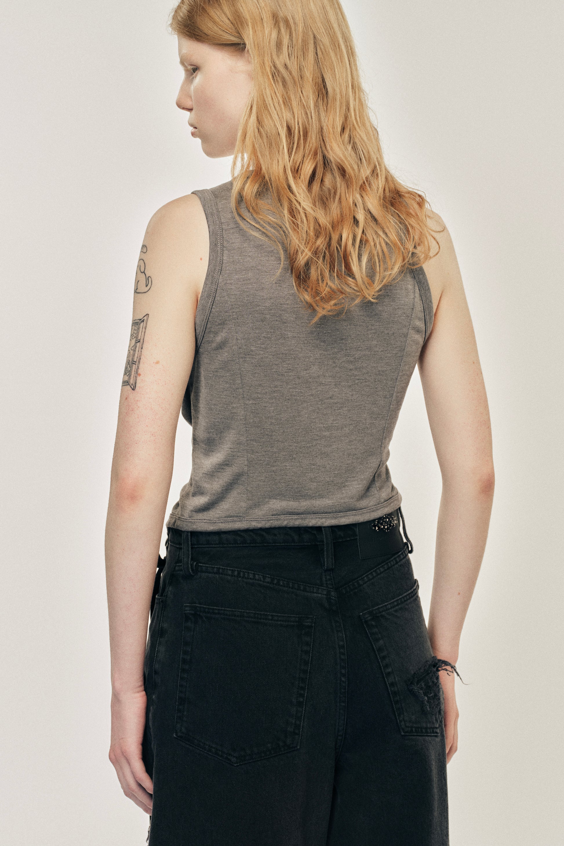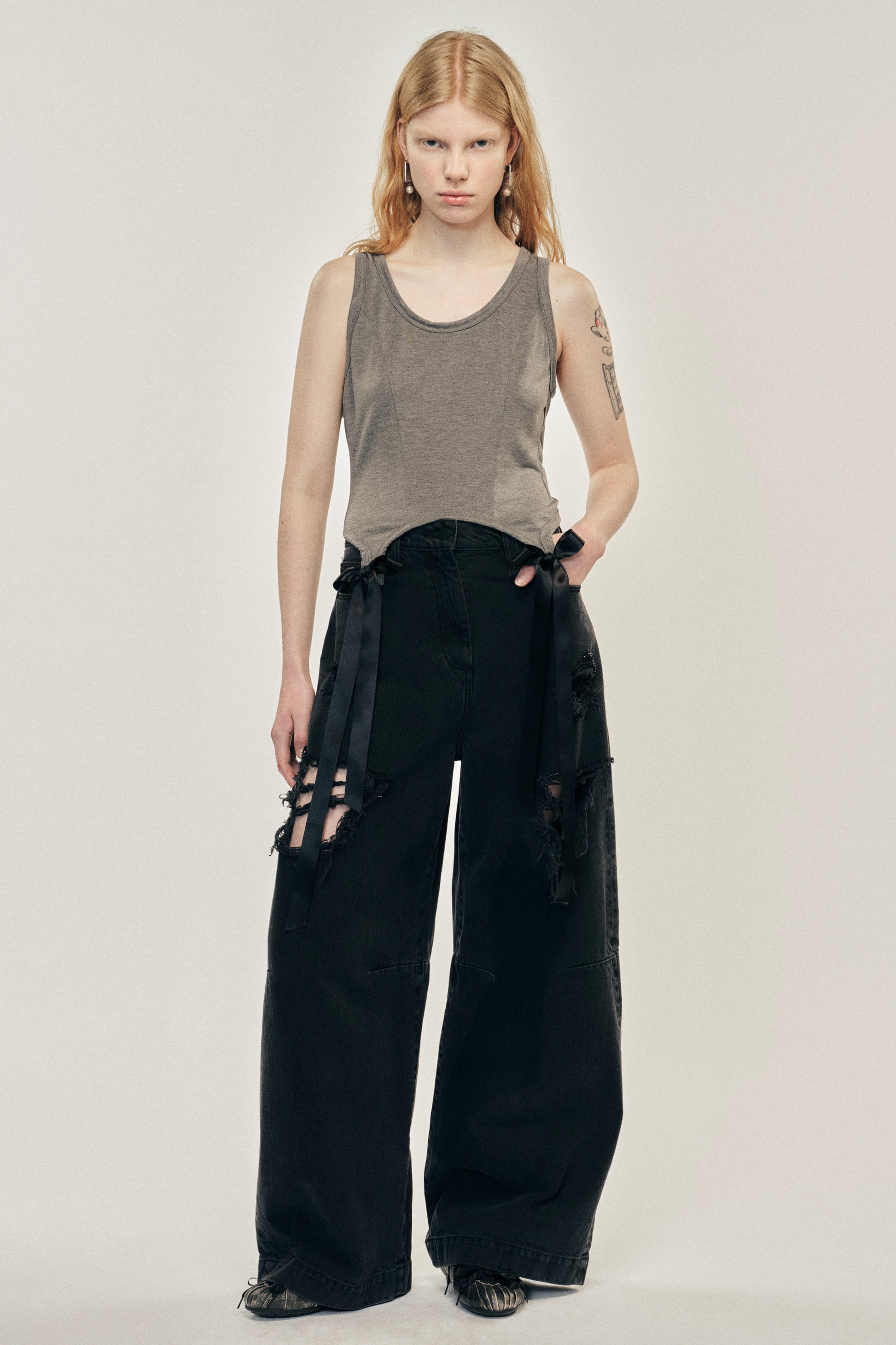 Simone Rocha cropped tank top in a soft fine jersey fabrication. Designed for a more fitted silhouette, featuring long satin bow tails at the front. The model is wearing this style with the Embellished Wide Leg Puddle Jeans.