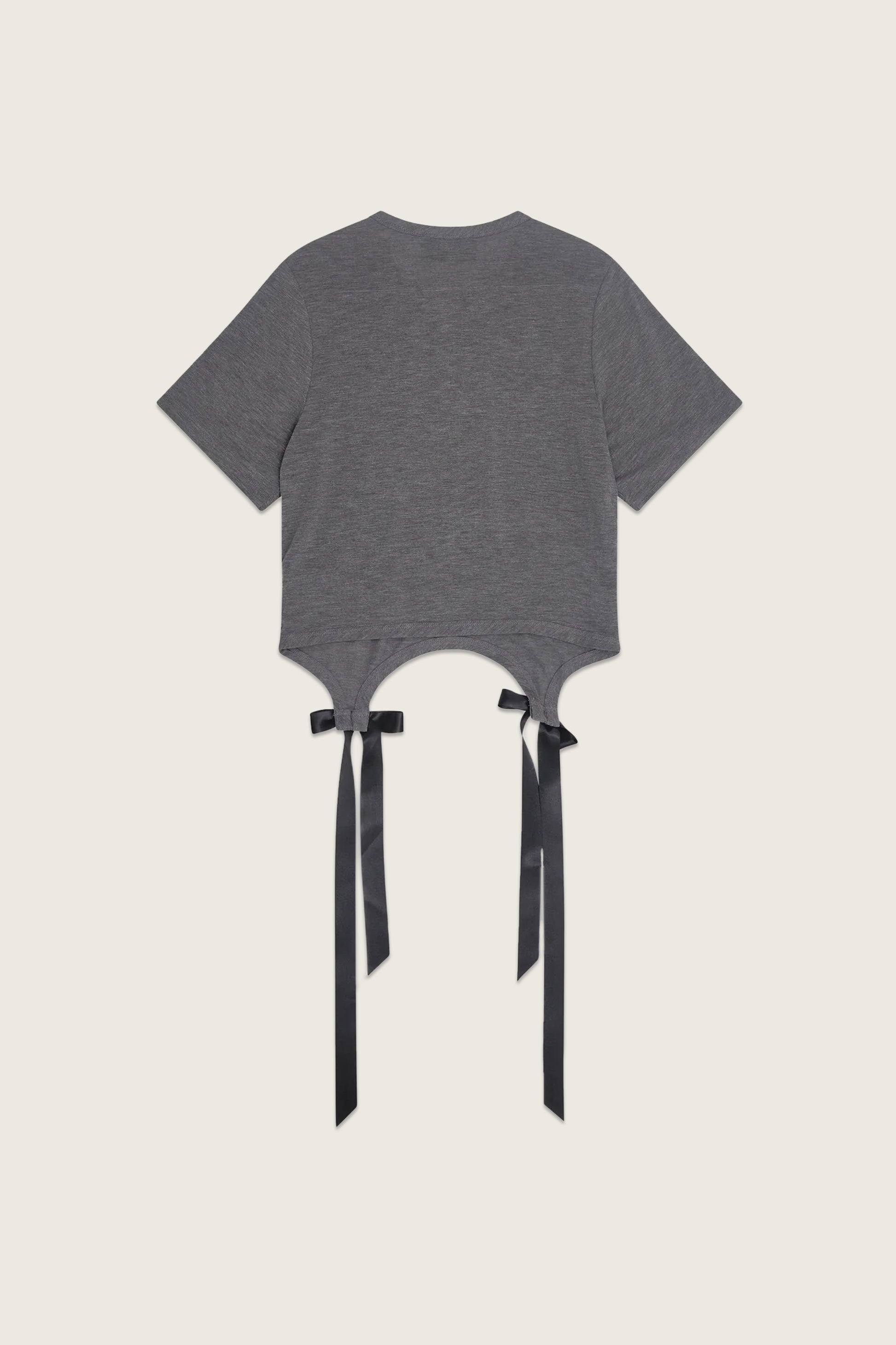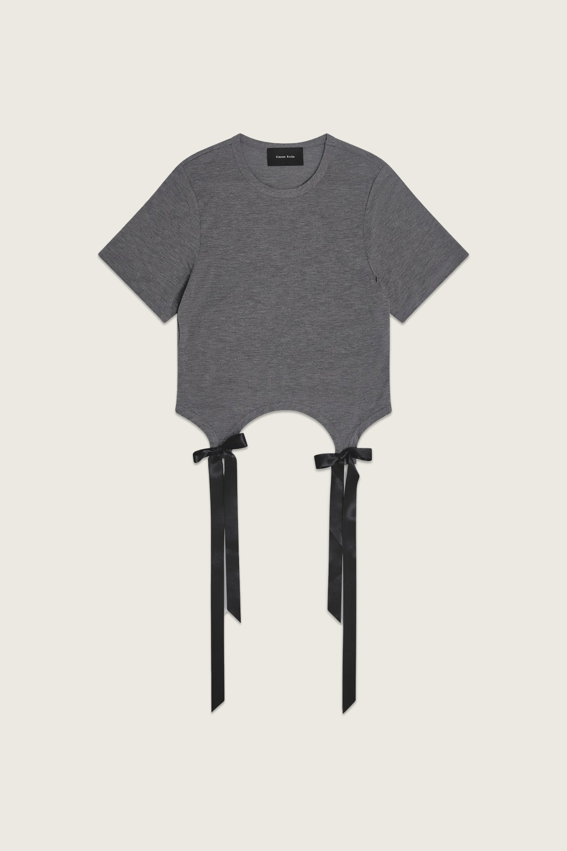 A cropped t-shirt in a soft fine jersey fabrication. Designed for a more fitted silhouette, featuring long satin bow tails at the front.