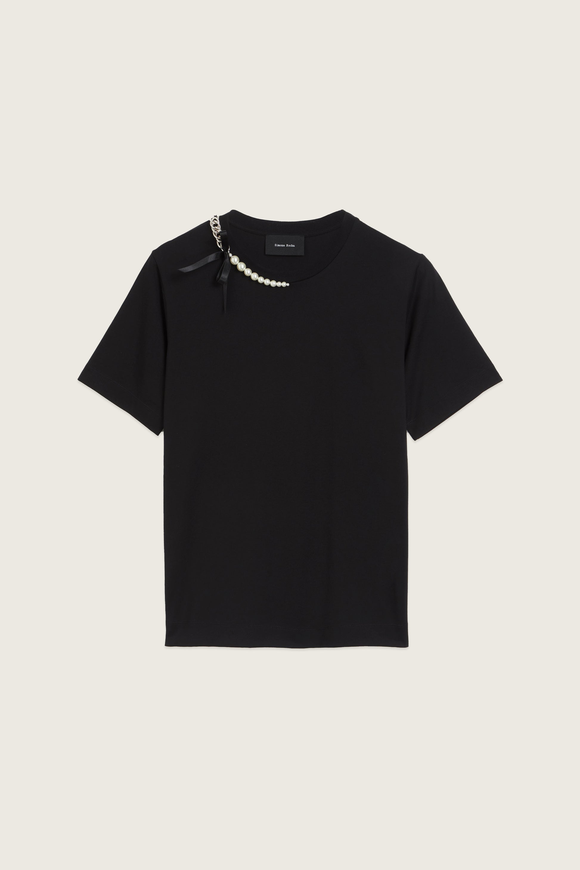 A relaxed fit t-shirt featuring a seasonal pearl and chain embellishment along the neckline with a signature bow.