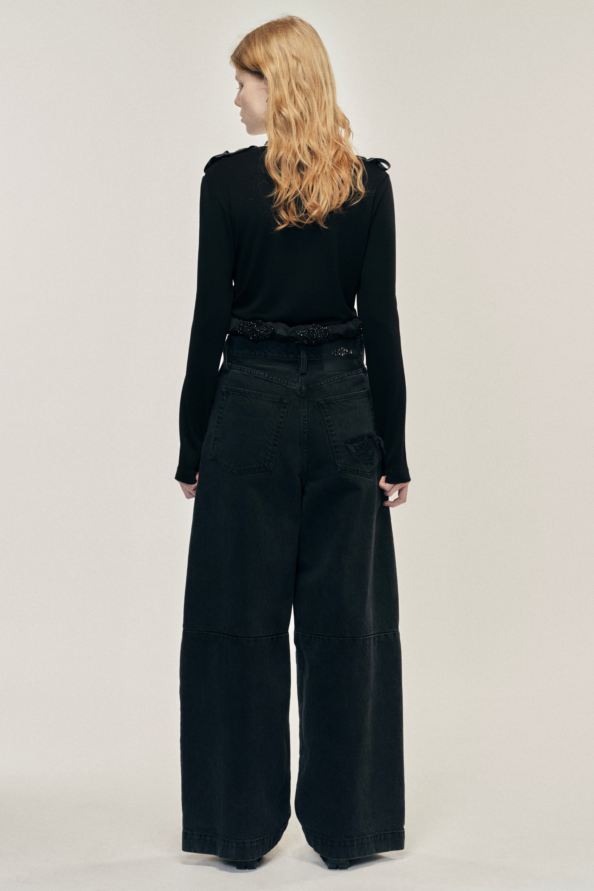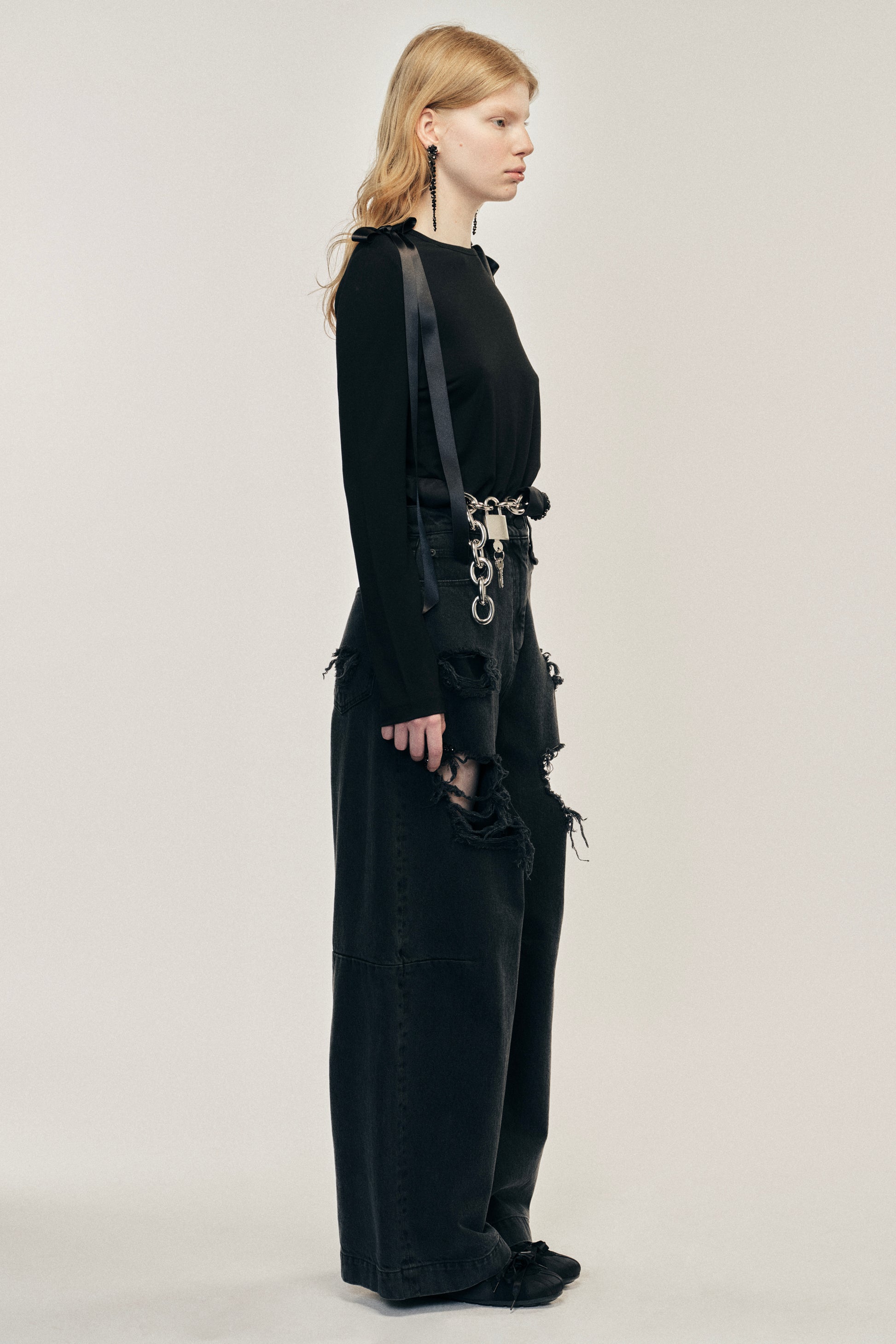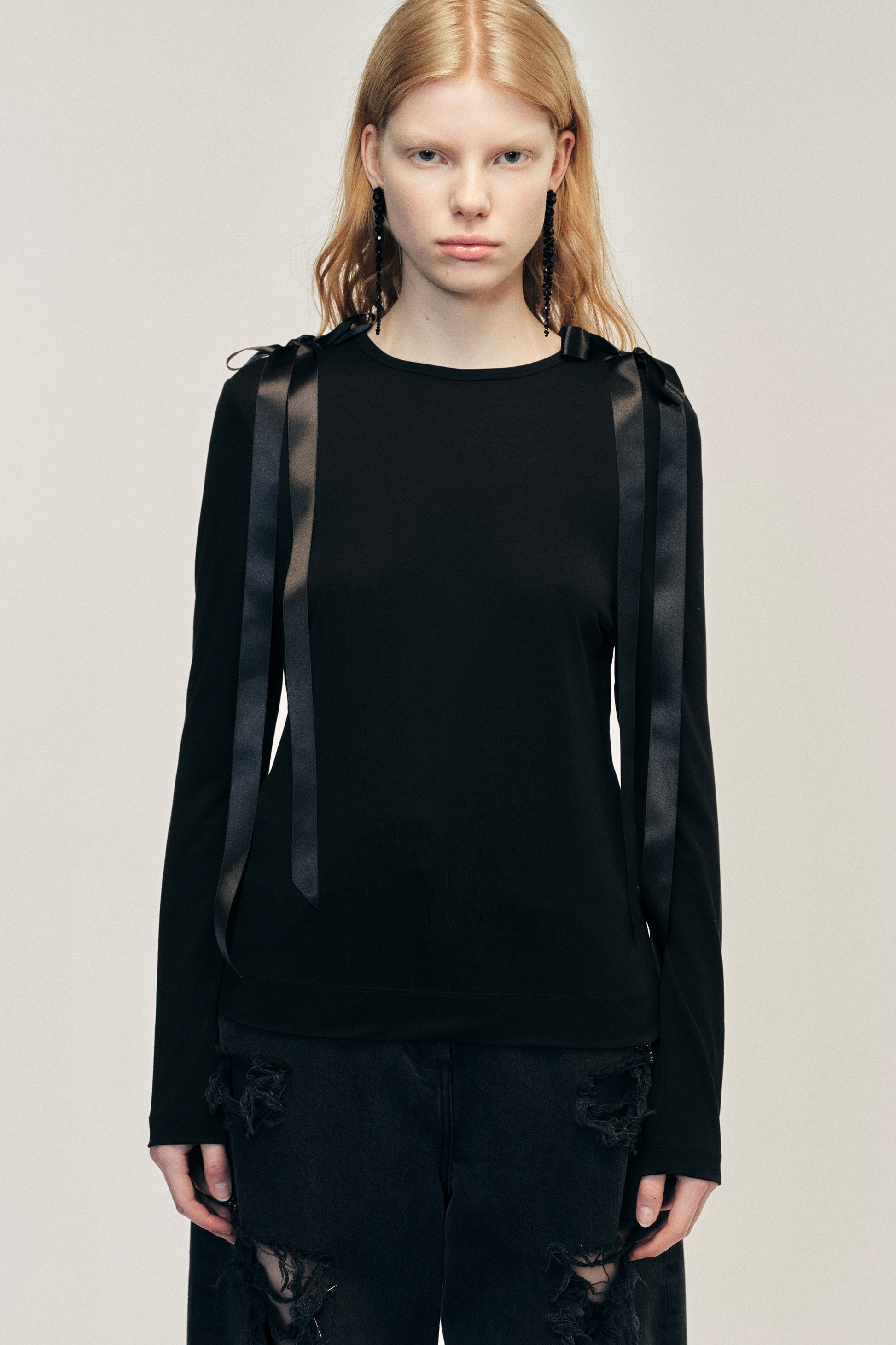 A long sleeve t-shirt composed of a lightweight jersey, decorative satin bow ribbons sit at the shoulder and drape down to emulate the runway looks. The model is wearing this style with the Embellished Wide Leg Puddle Jeans.