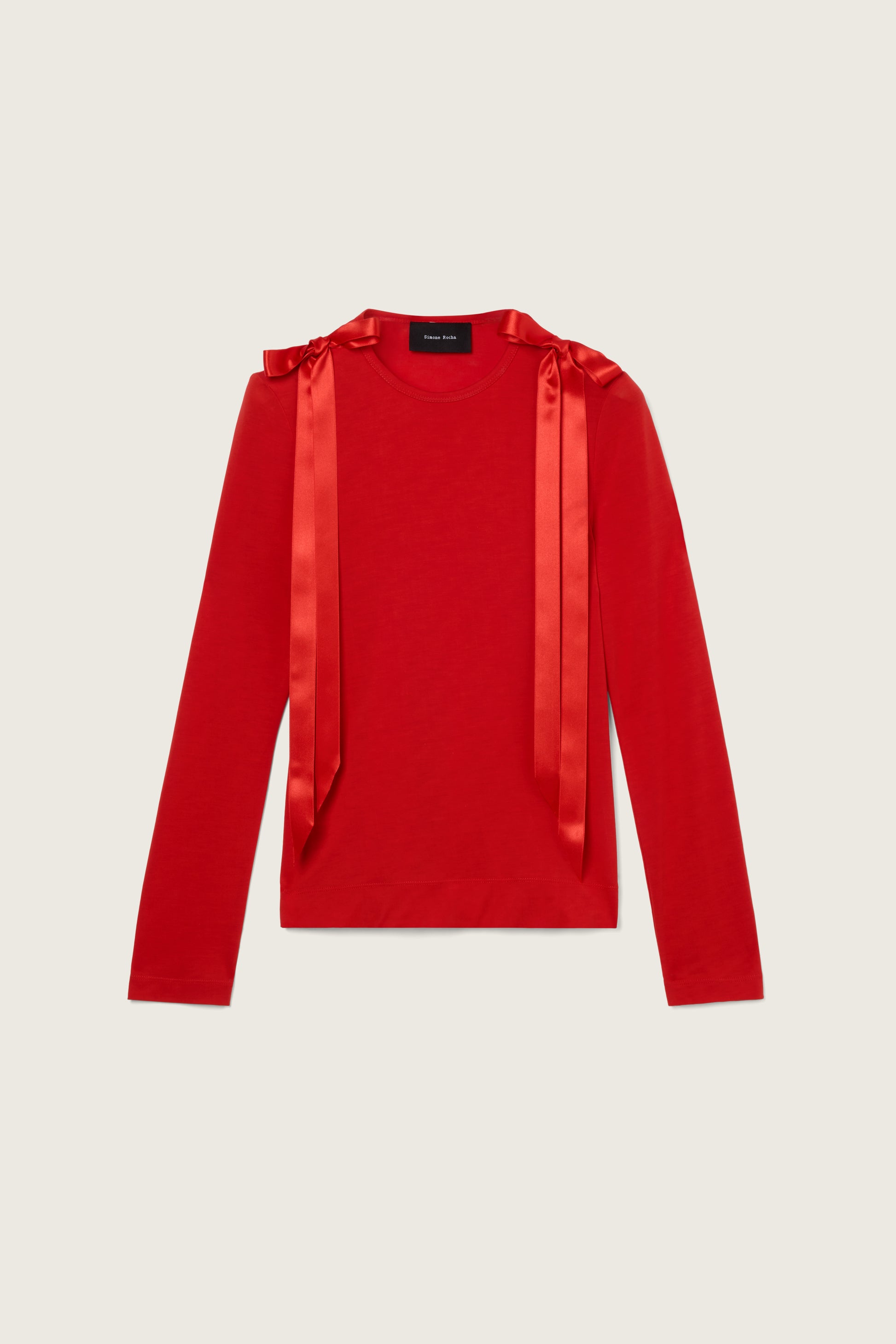 A long sleeve t-shirt composed of a lightweight jersey, decorative satin bow ribbons sit at the shoulder and drape down to emulate the runway looks.