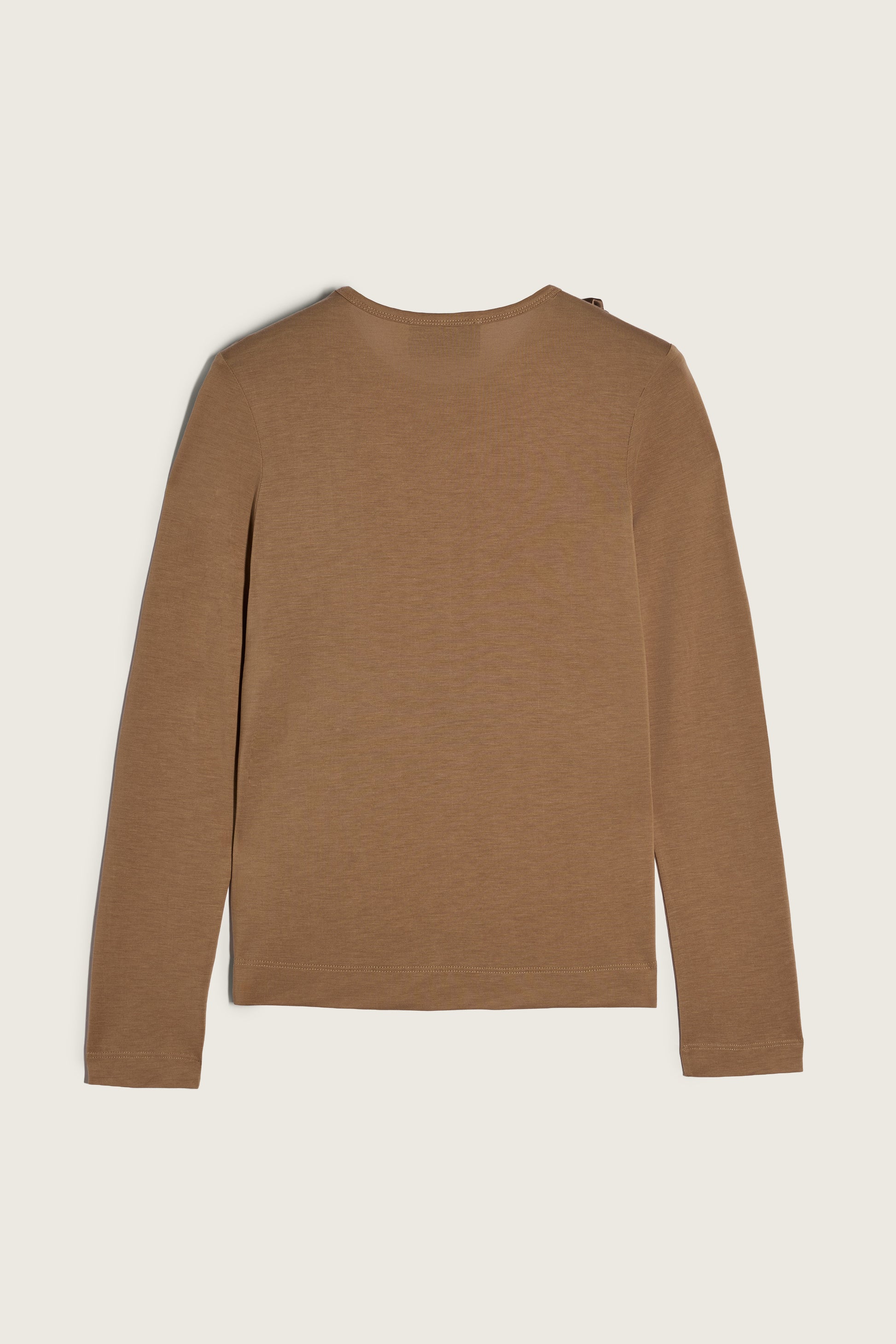A long sleeve t-shirt composed of a lightweight jersey, decorative satin bow ribbons sit at the shoulder and drape down for a signature look.