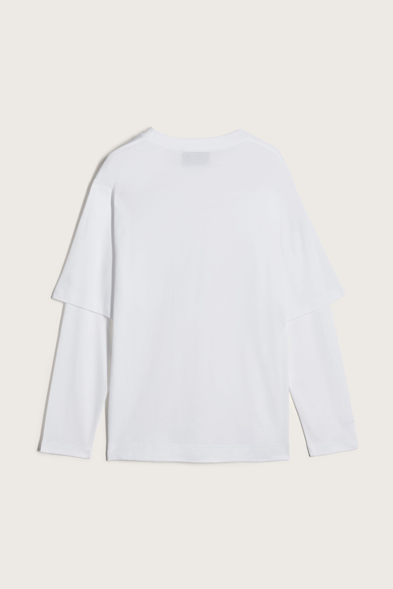 A long sleeve t-shirt with a layered construction, it features an oversized pocket at the chest with ruffle frills.