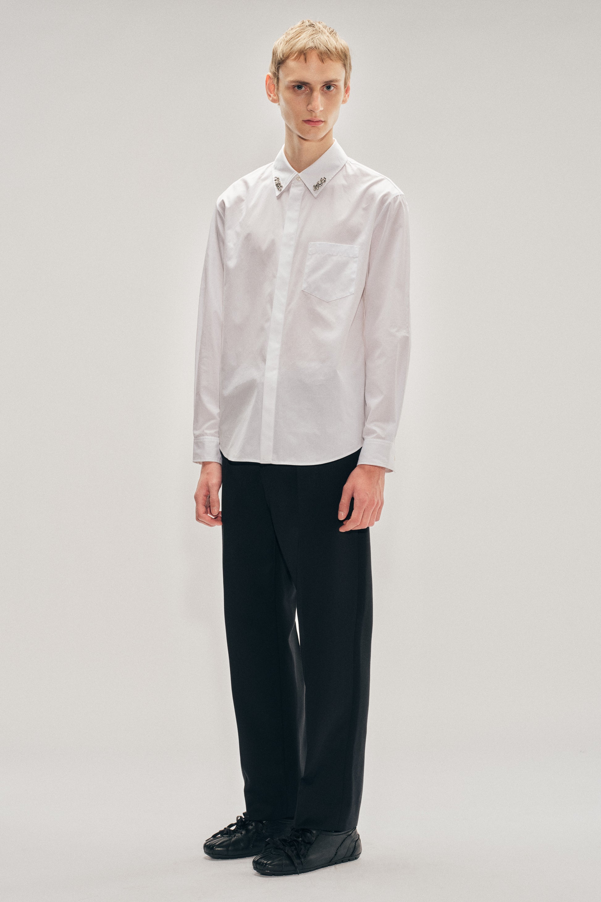 A classic fit shirt with an updated concealed button placket at the front. The collar features a seasonal pearl and crystal embellishment.