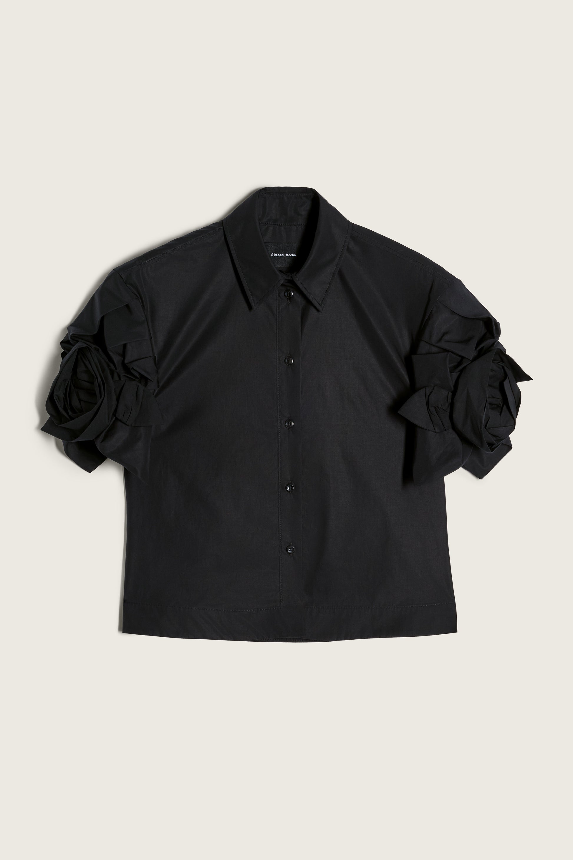 The signature Simone Rocha cropped shirt is updated with a rose detail at the sleeve. It can be worn with a pair of high waisted trousers or skirt.