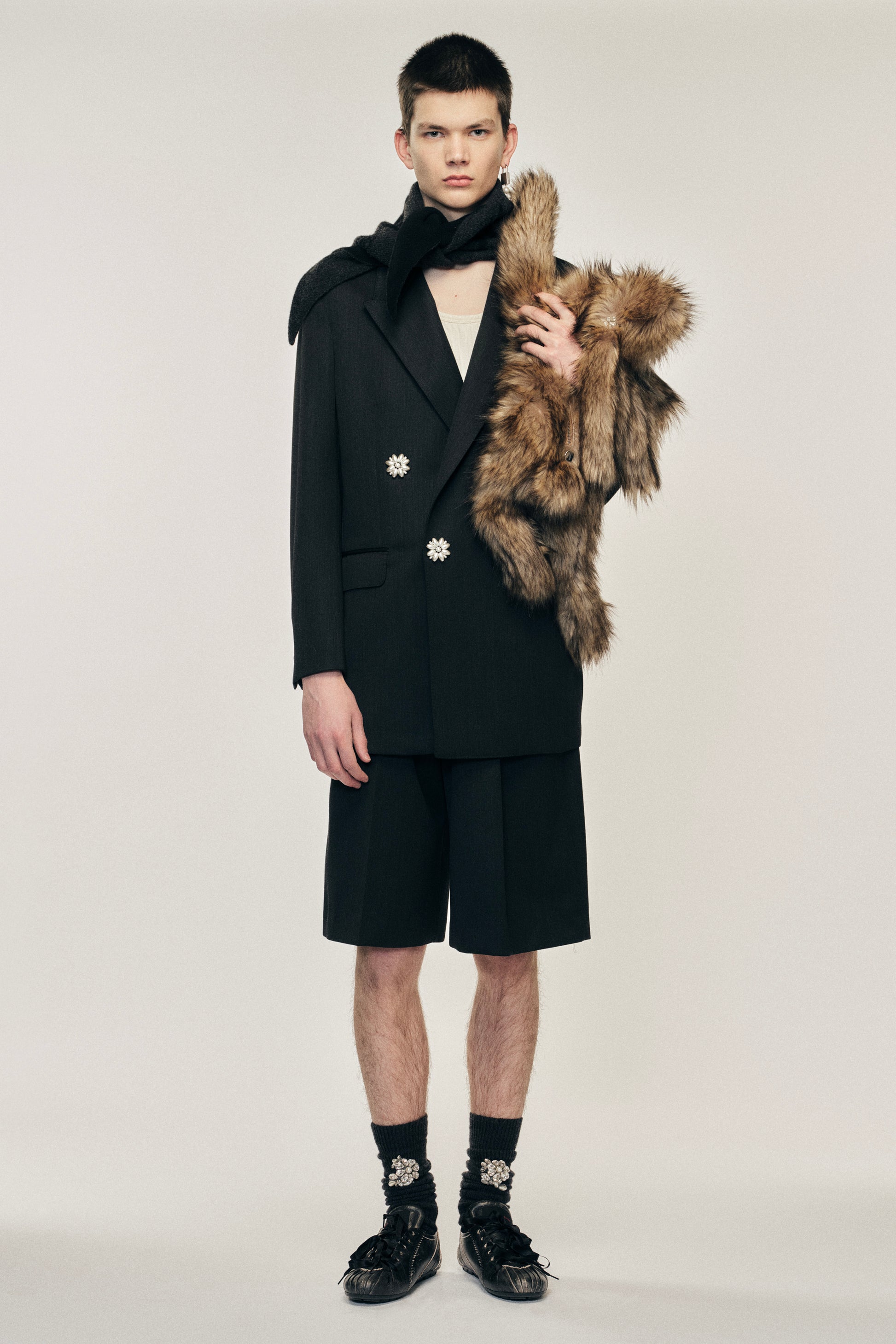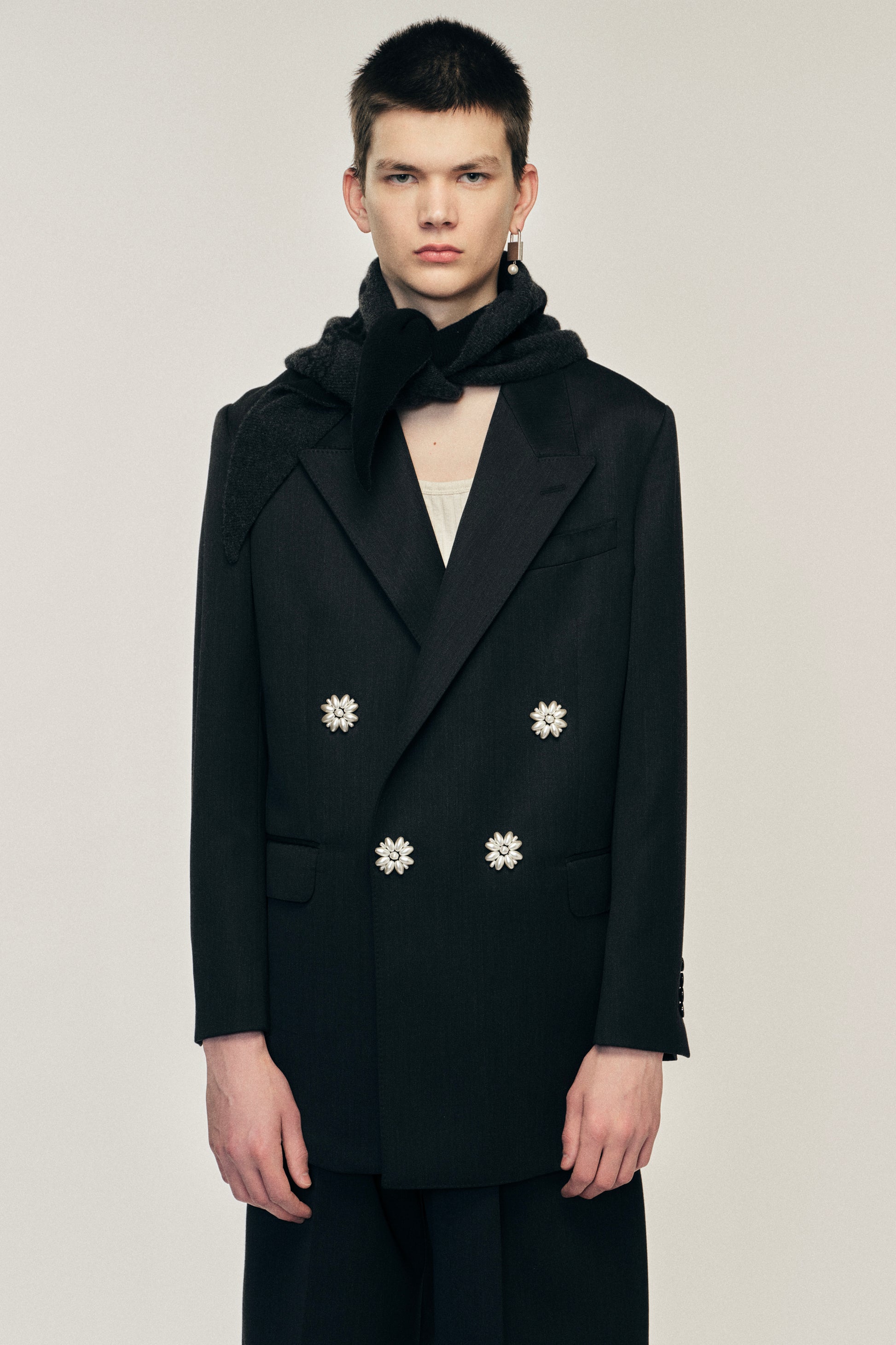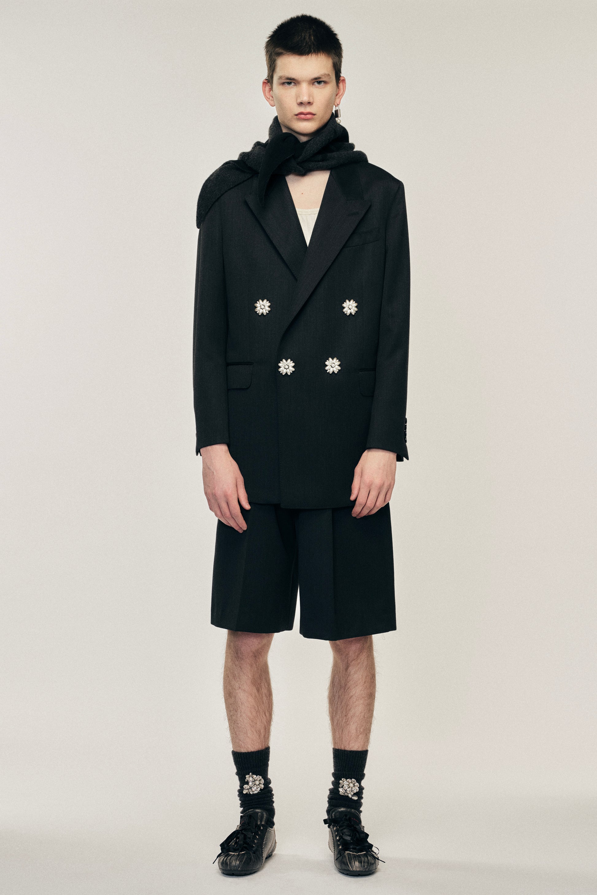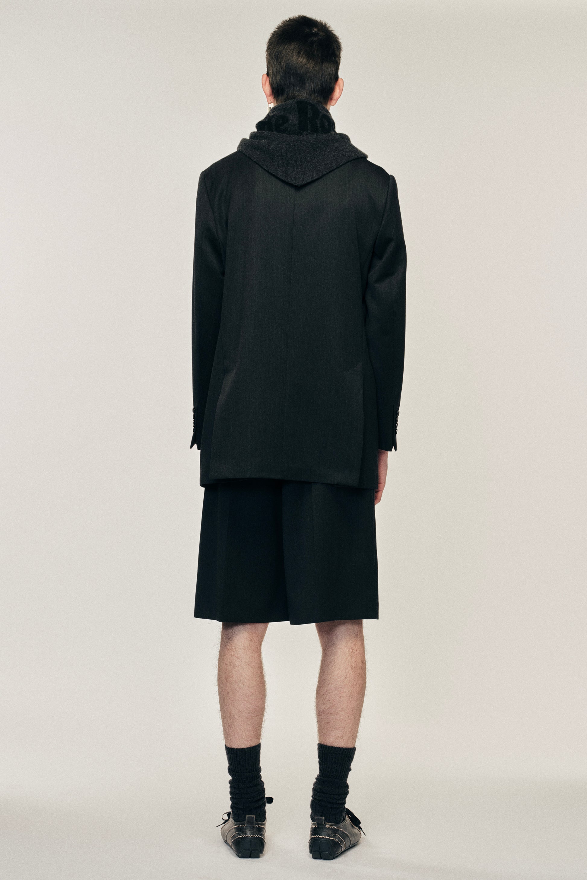 A boxy jacket tailored from a wool blend and has a traditional double-breasted front. The snap buttons are adorned with pearl flowers. The model is wearing this style with the Wide Leg Multi Belt Loop Shorts.