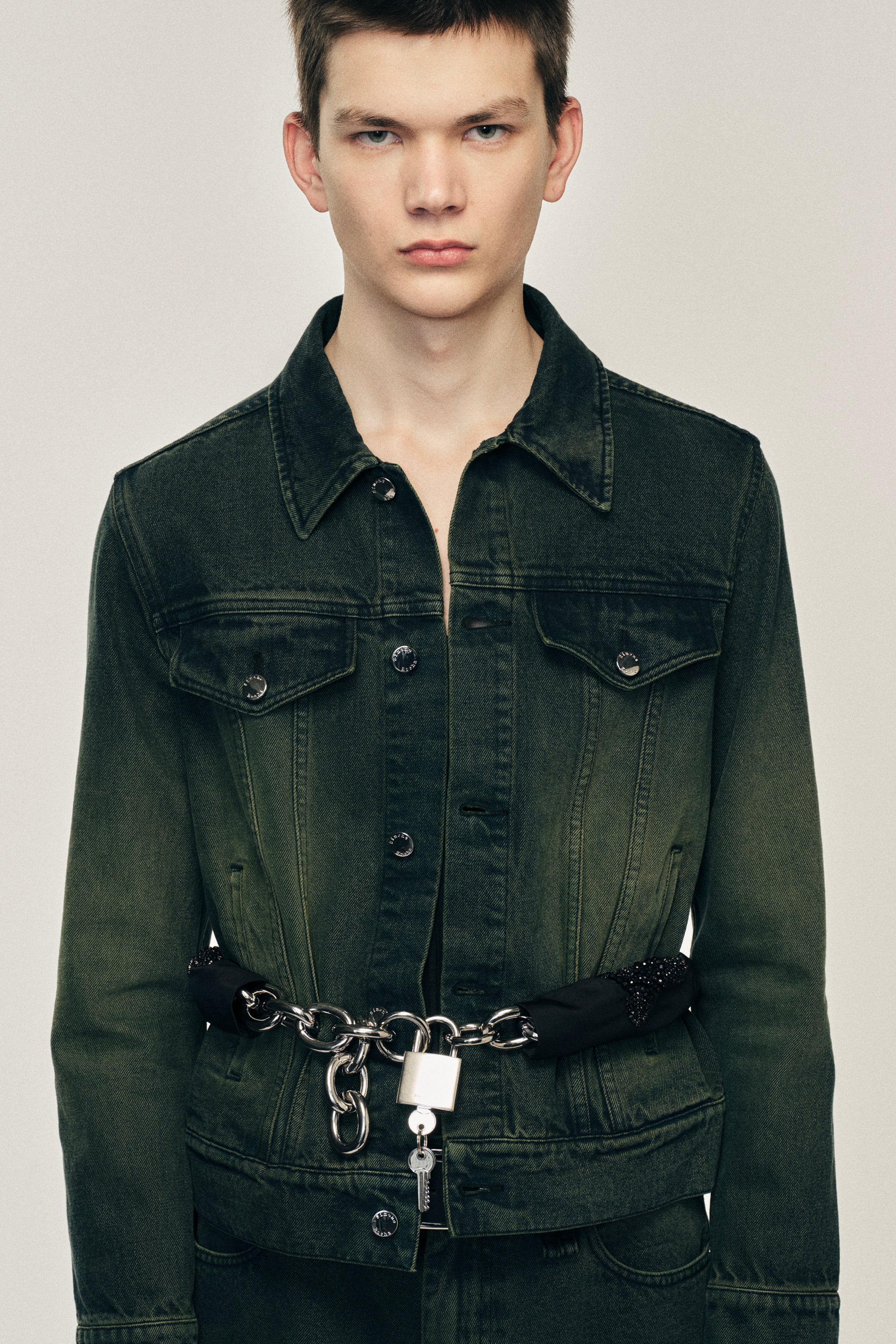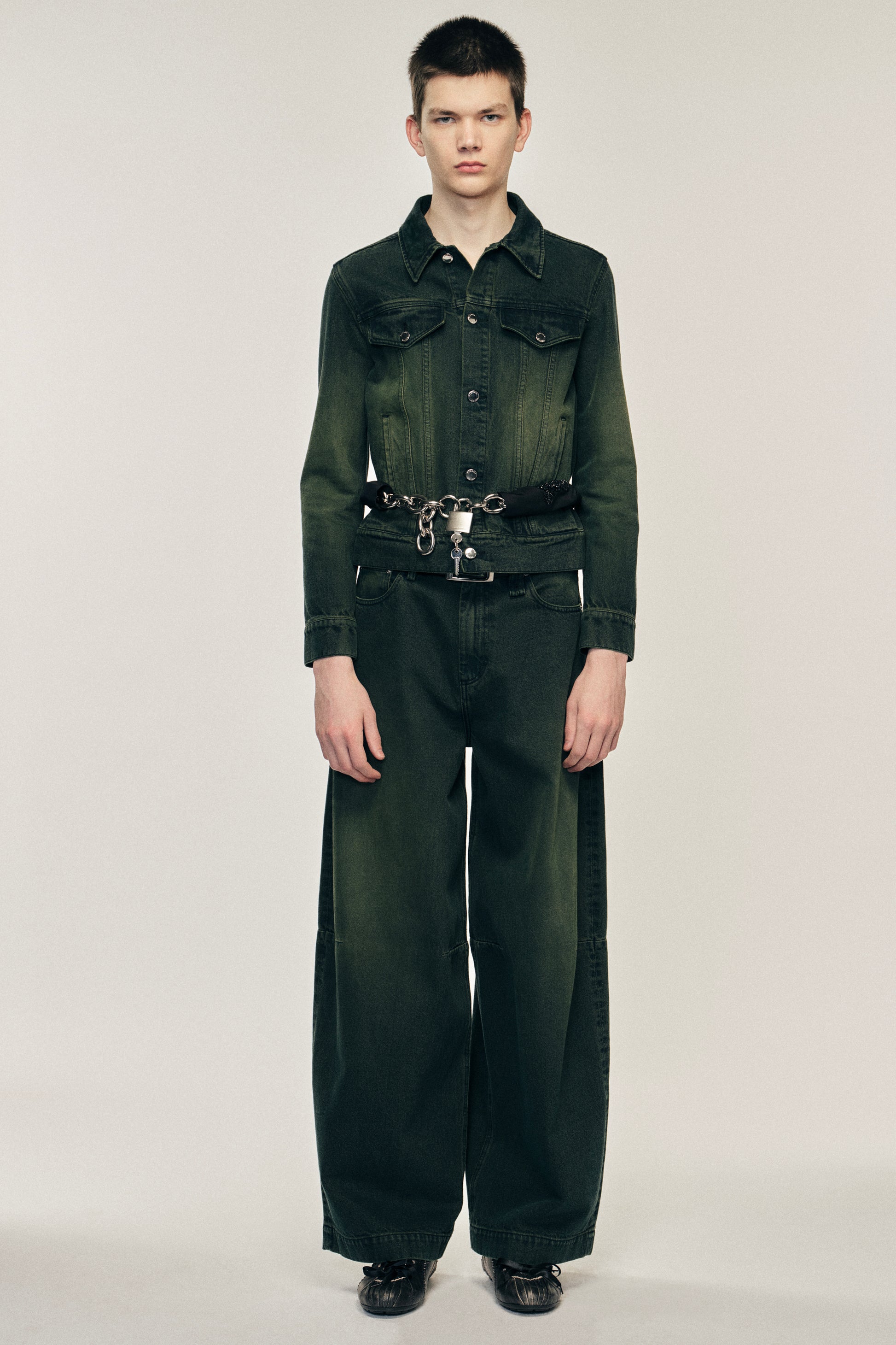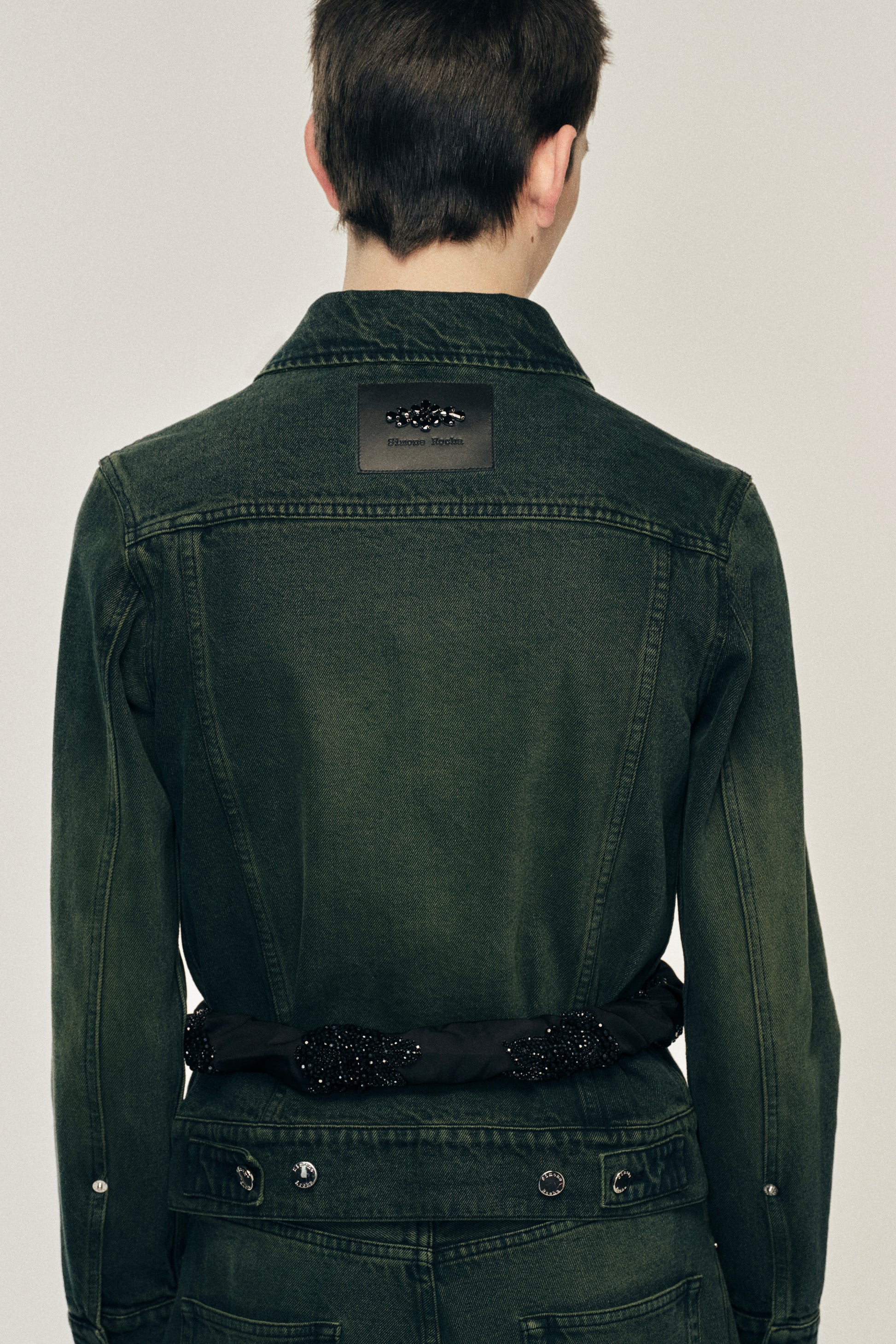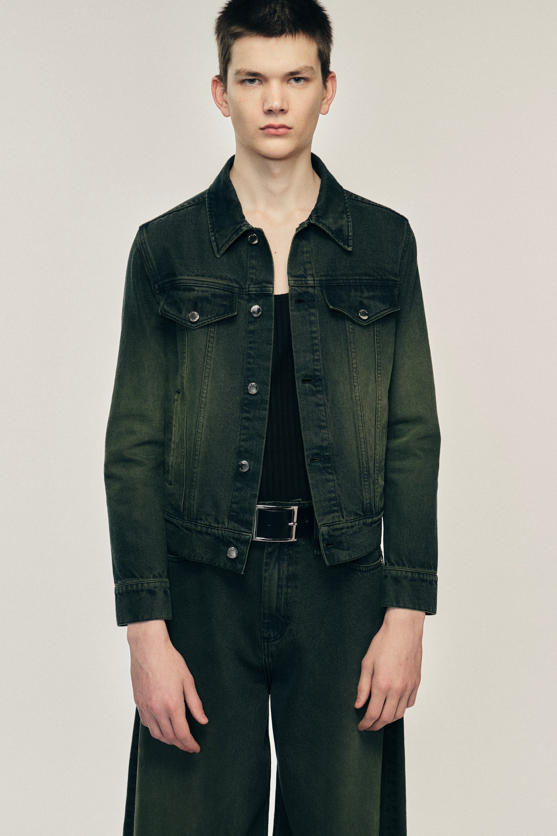 A fitted trucker-style jacket in an over-dyed green denim construction. The design includes two chest flap pockets lending to a utilitarian look. The model is wearing this style with the Wide Leg Puddle Jeans.