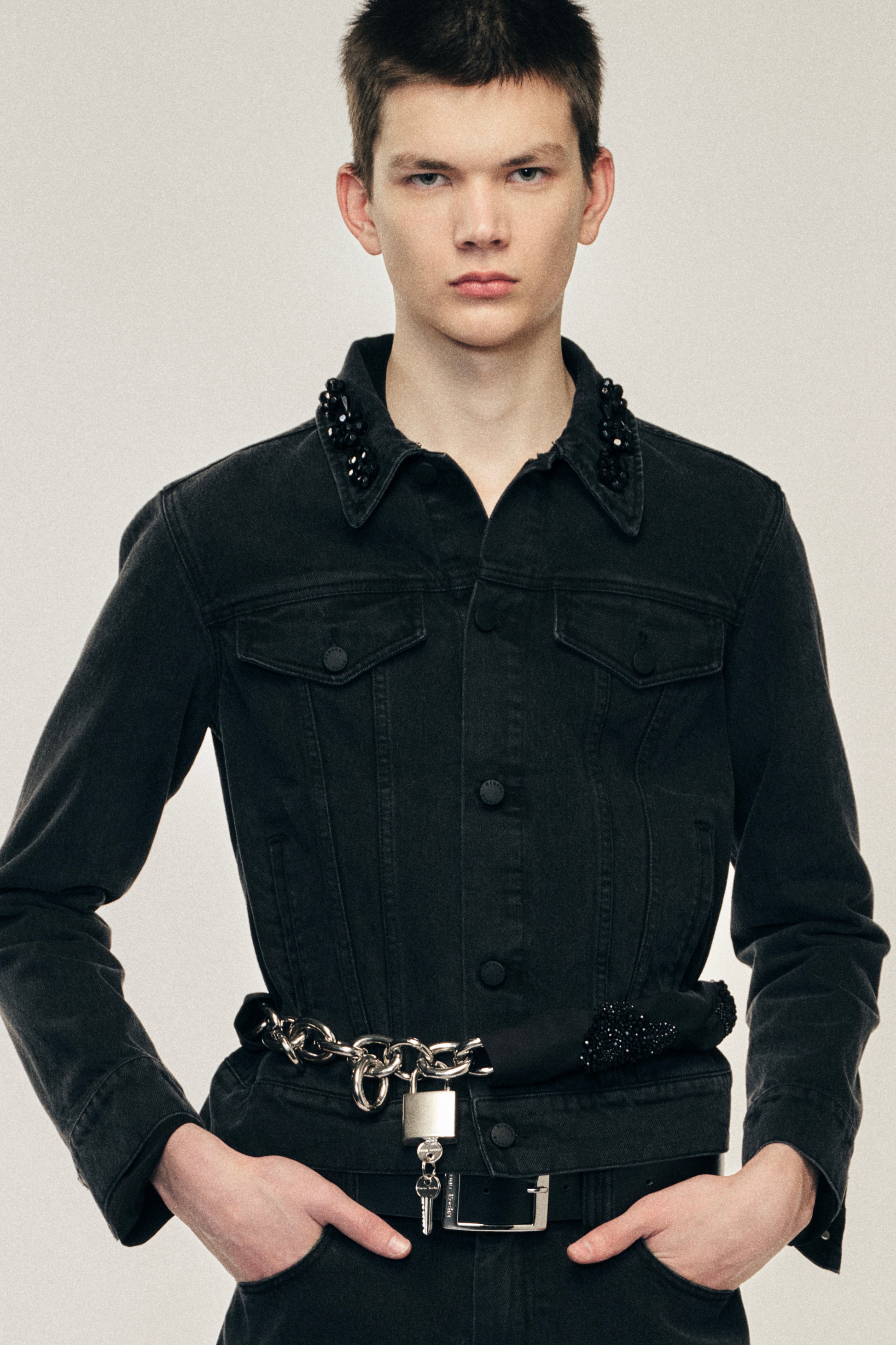 The denim jacket has a slightly cropped fit, the denim is washed for a more worn in fit. The collar is adorned with jet black beading signature to Simone Rocha. The model is wearing this style with the Embellished Wide Leg Puddle Jeans.
