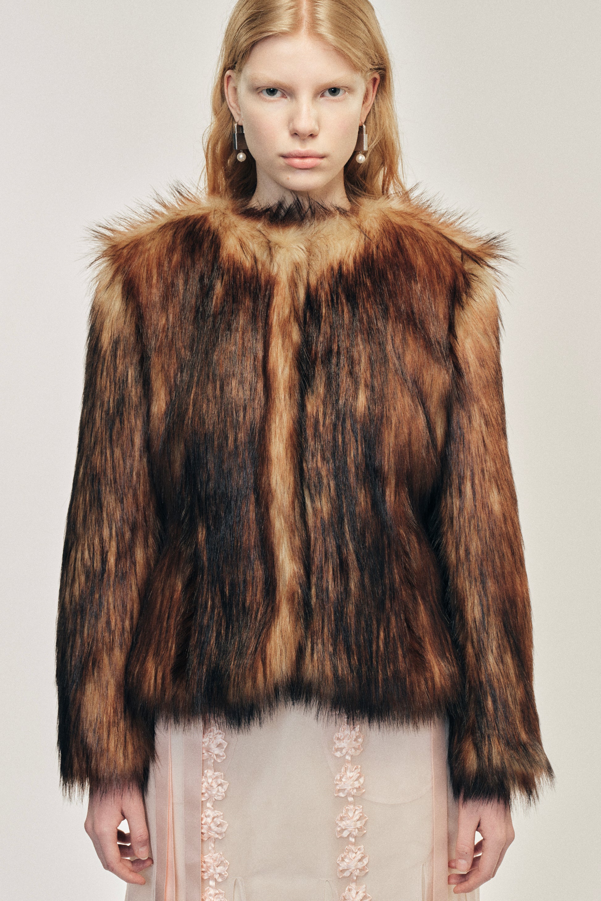 A cozy fitted jacket comprised of a plush faux fur with a hook-eye closure. It can be paired with a sheer tulle pieces for a contrast between fabrications. The model is wearing this style with the Ribbon Daisy Chain Multi Slit Dress.
