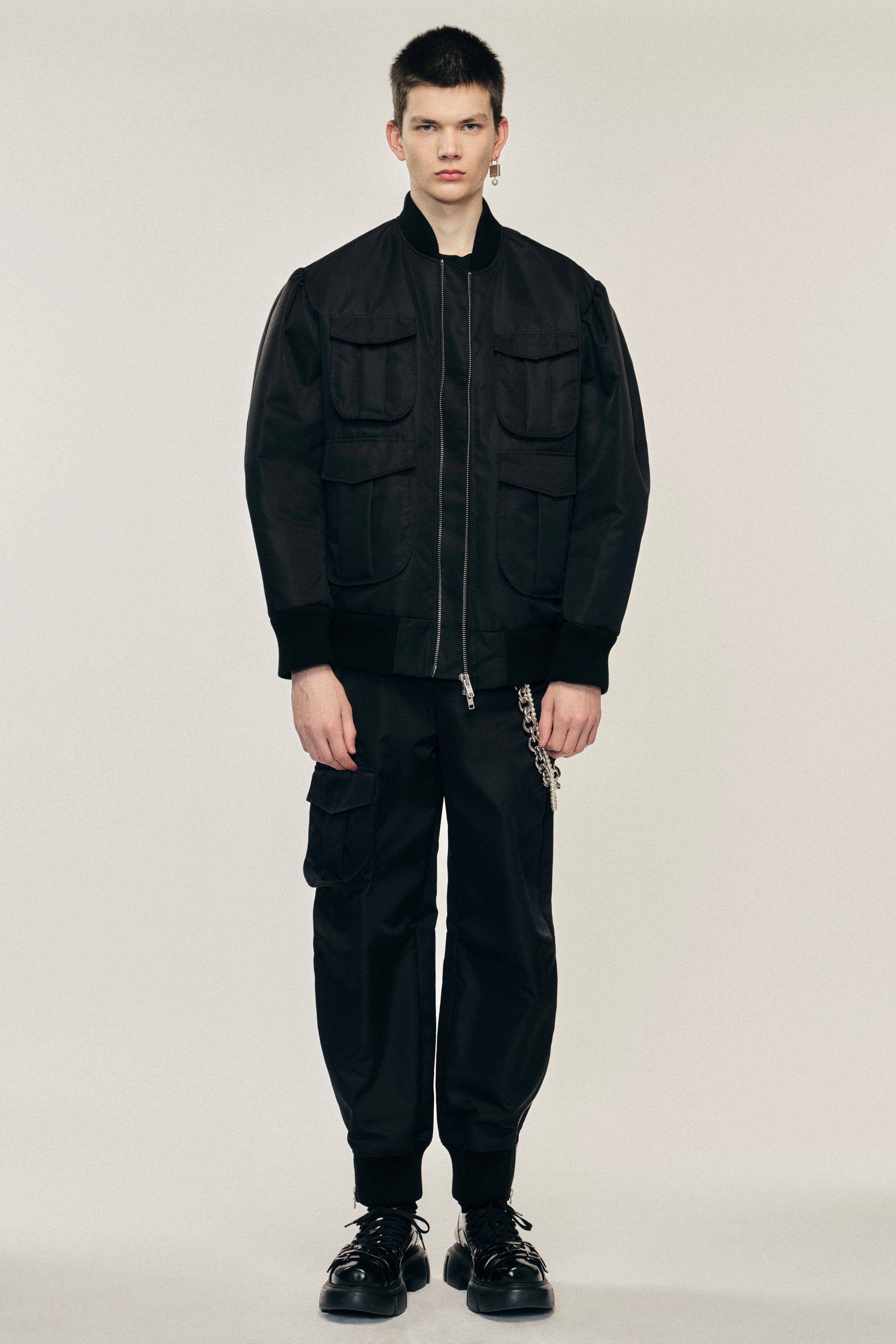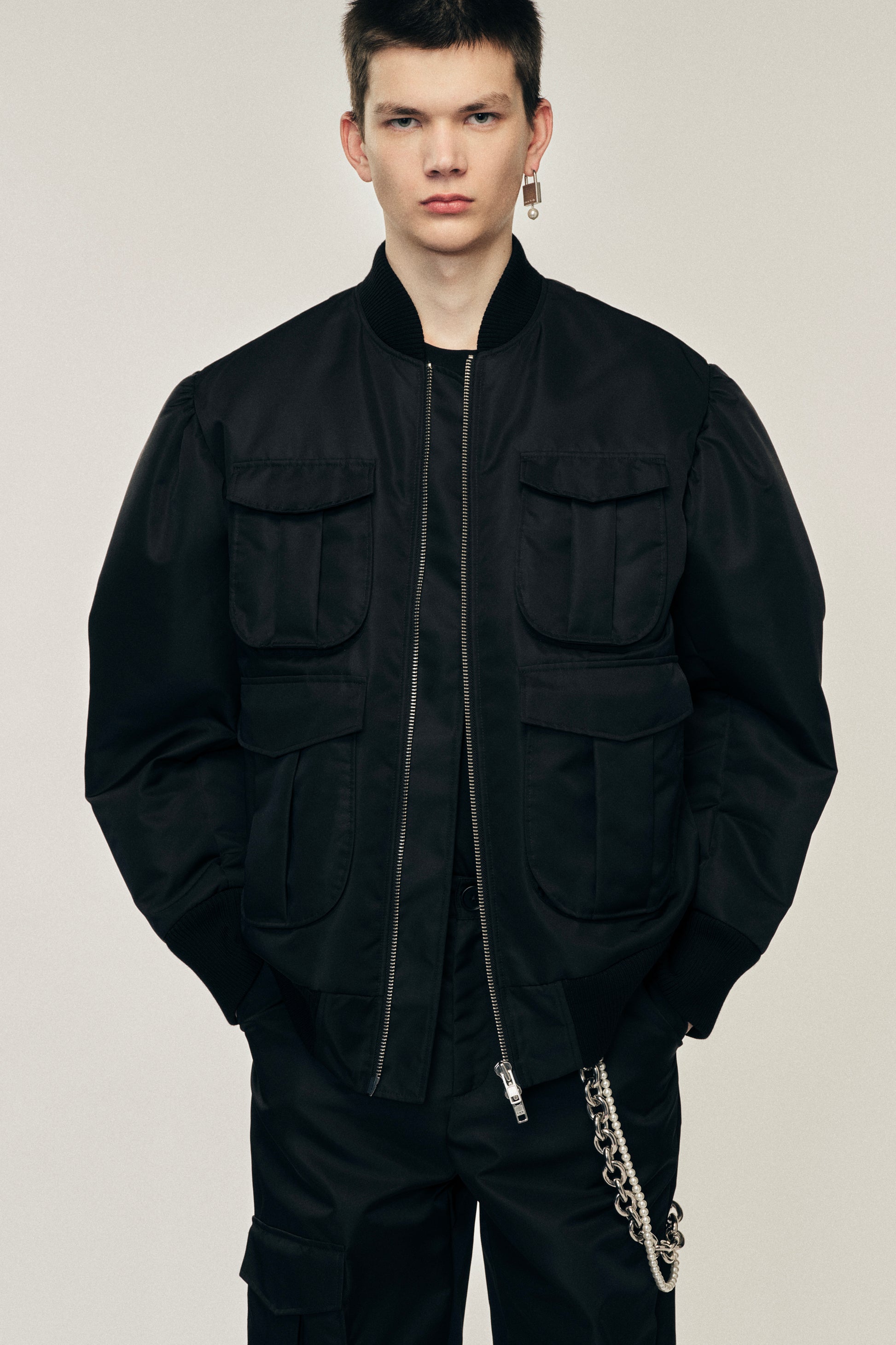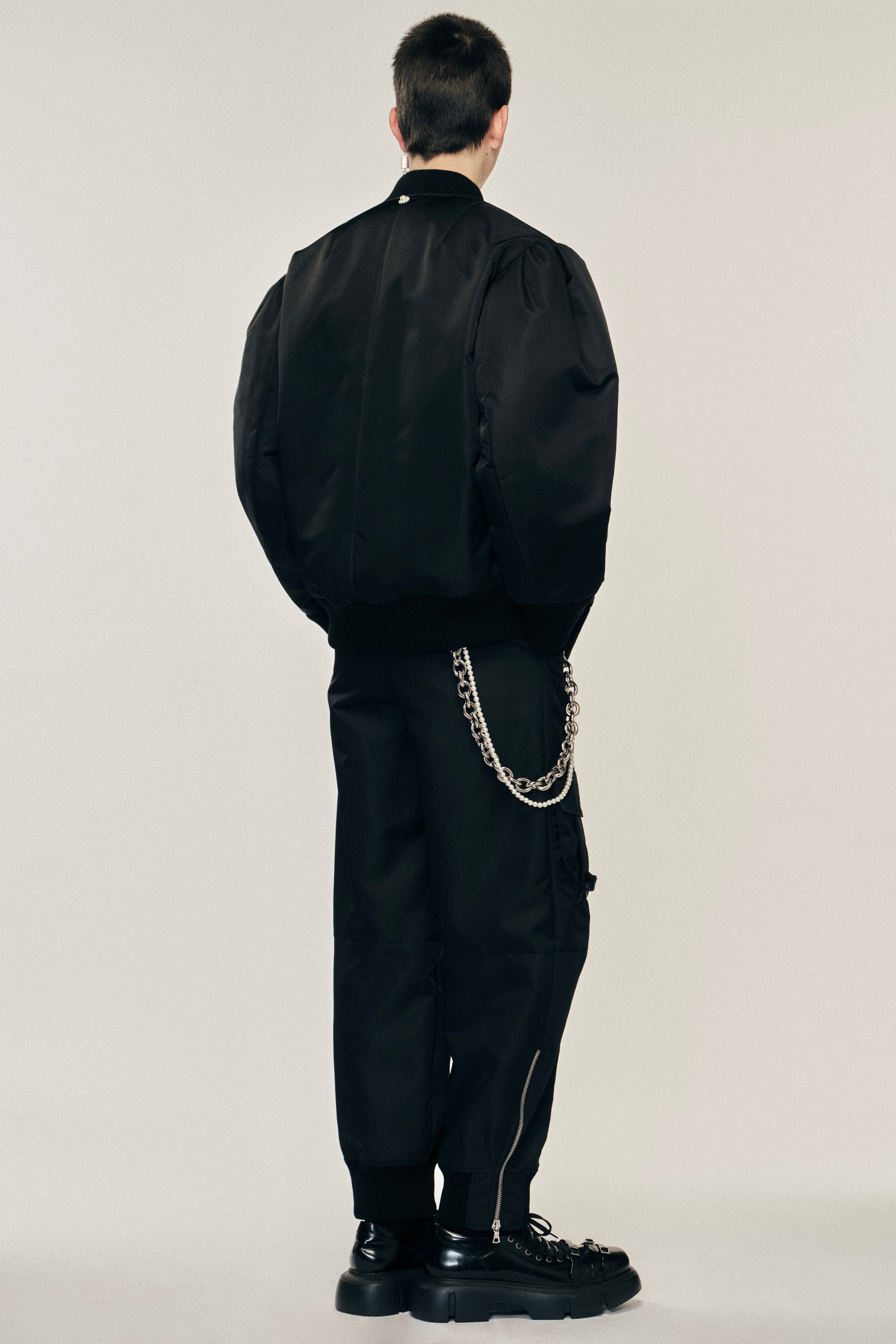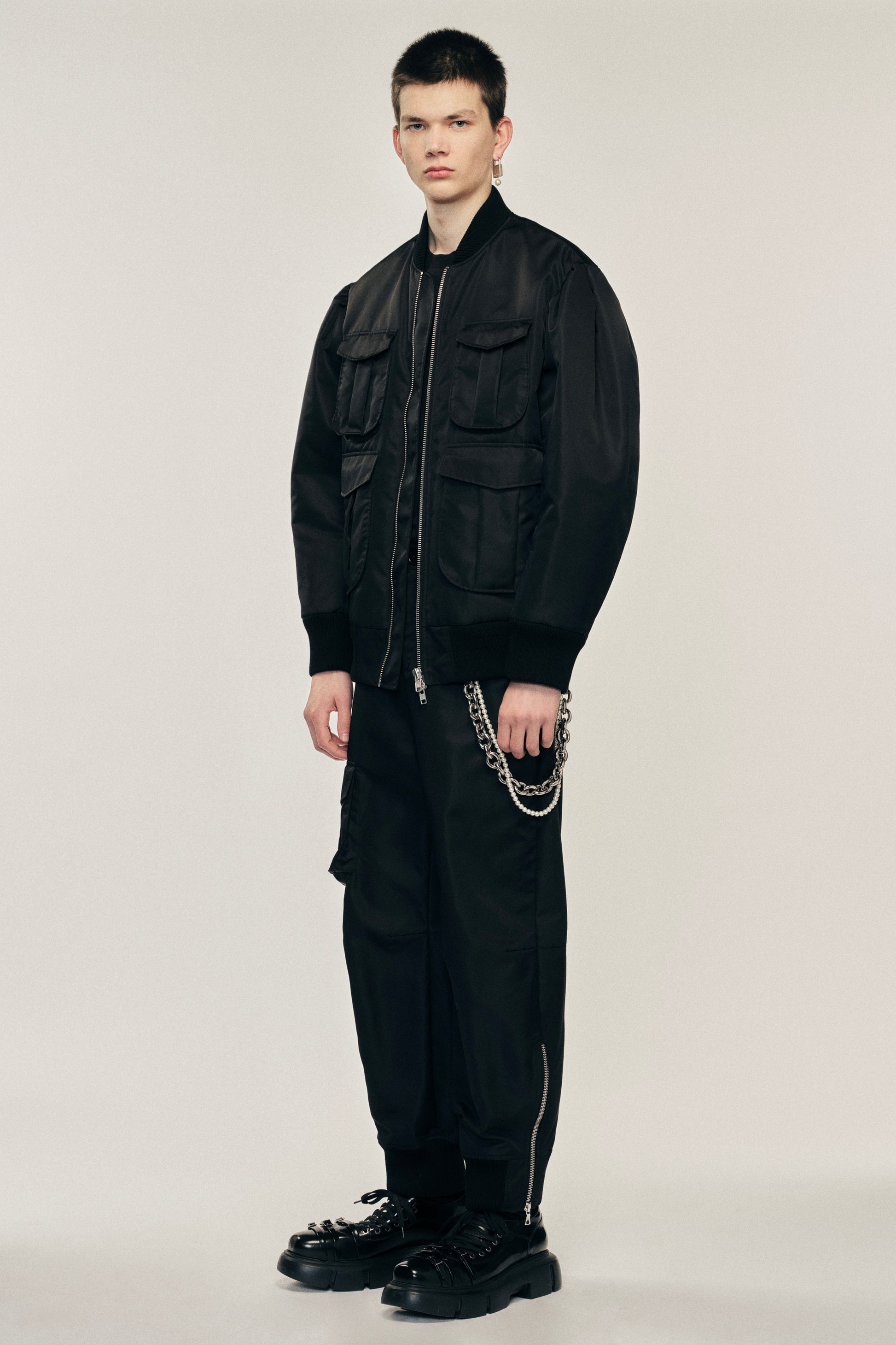 A relaxed fit bomber satin jacket, its voluminous silhouette is the perfect piece to pair in the colder weather. It features exaggerated pockets at the front for a utilitarian look. The model is wearing this style with the Ankle Zip Pocket Trousers.