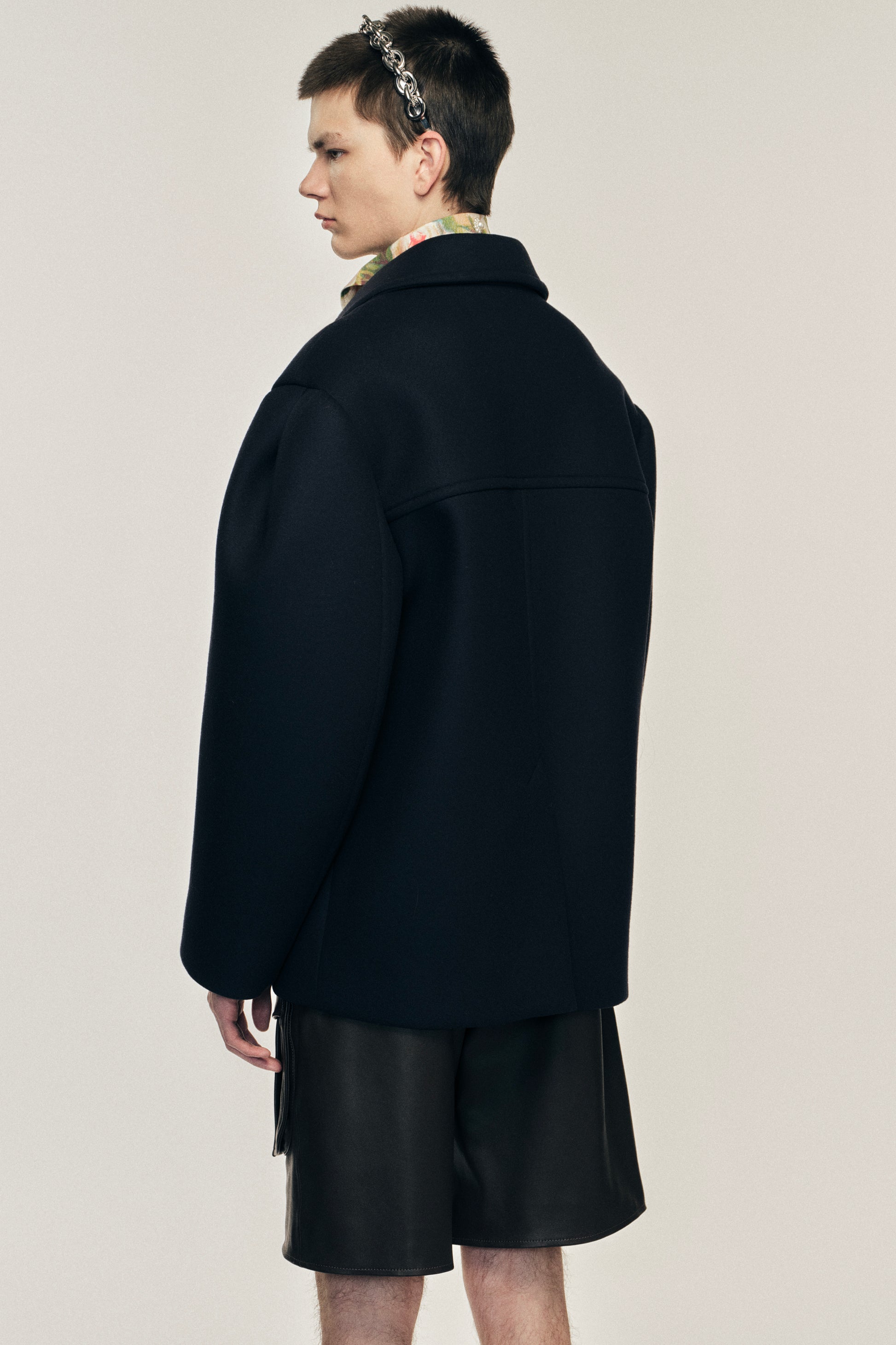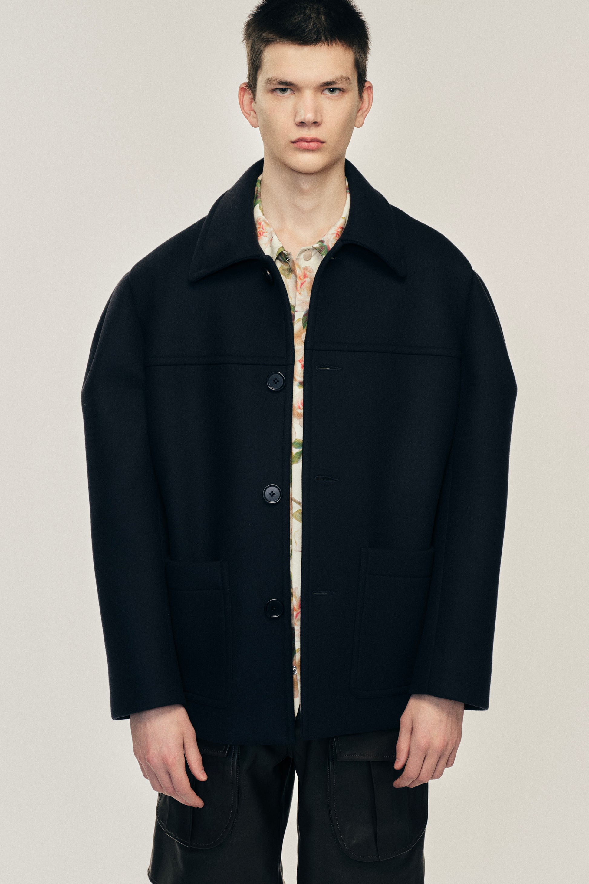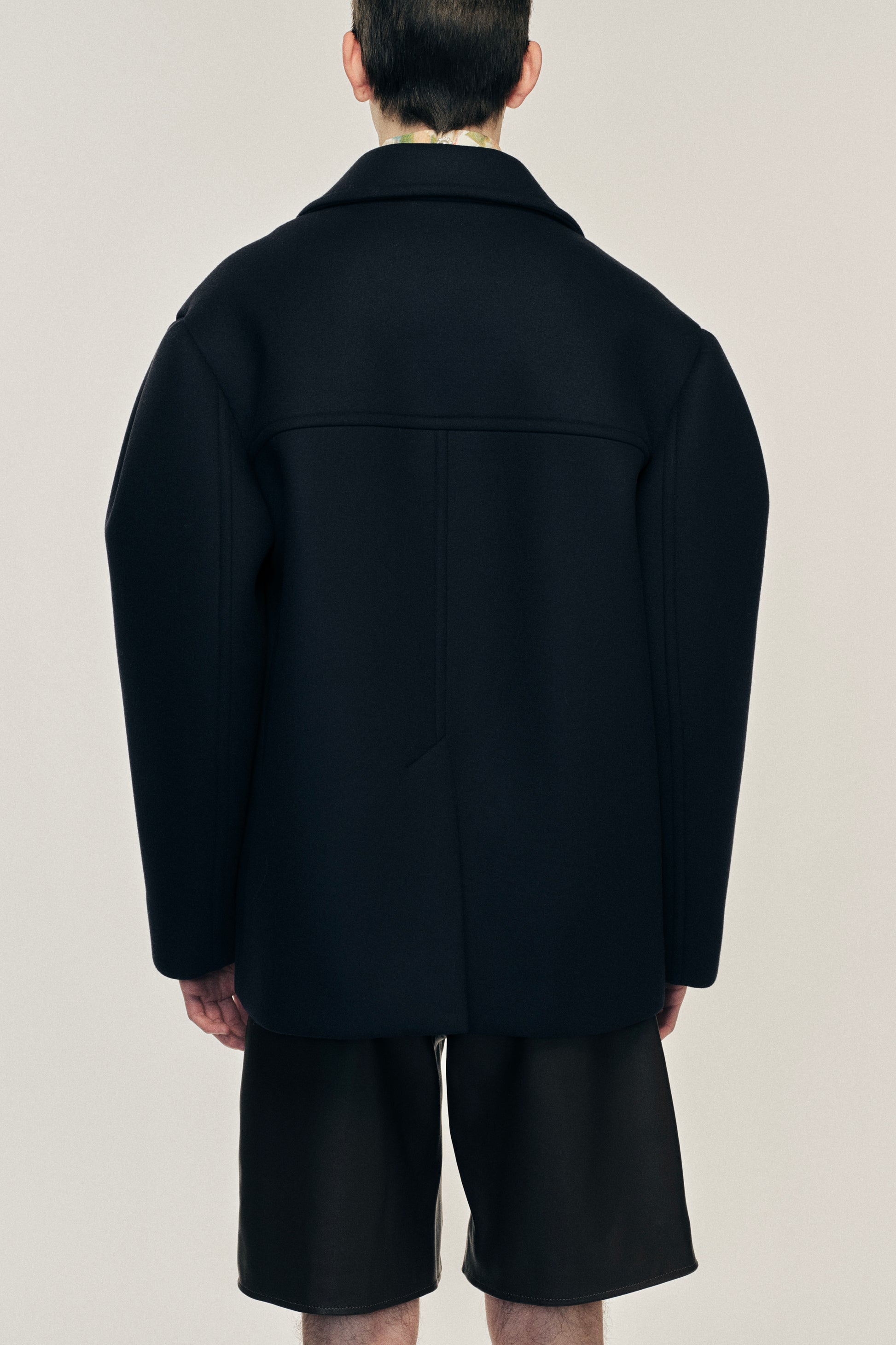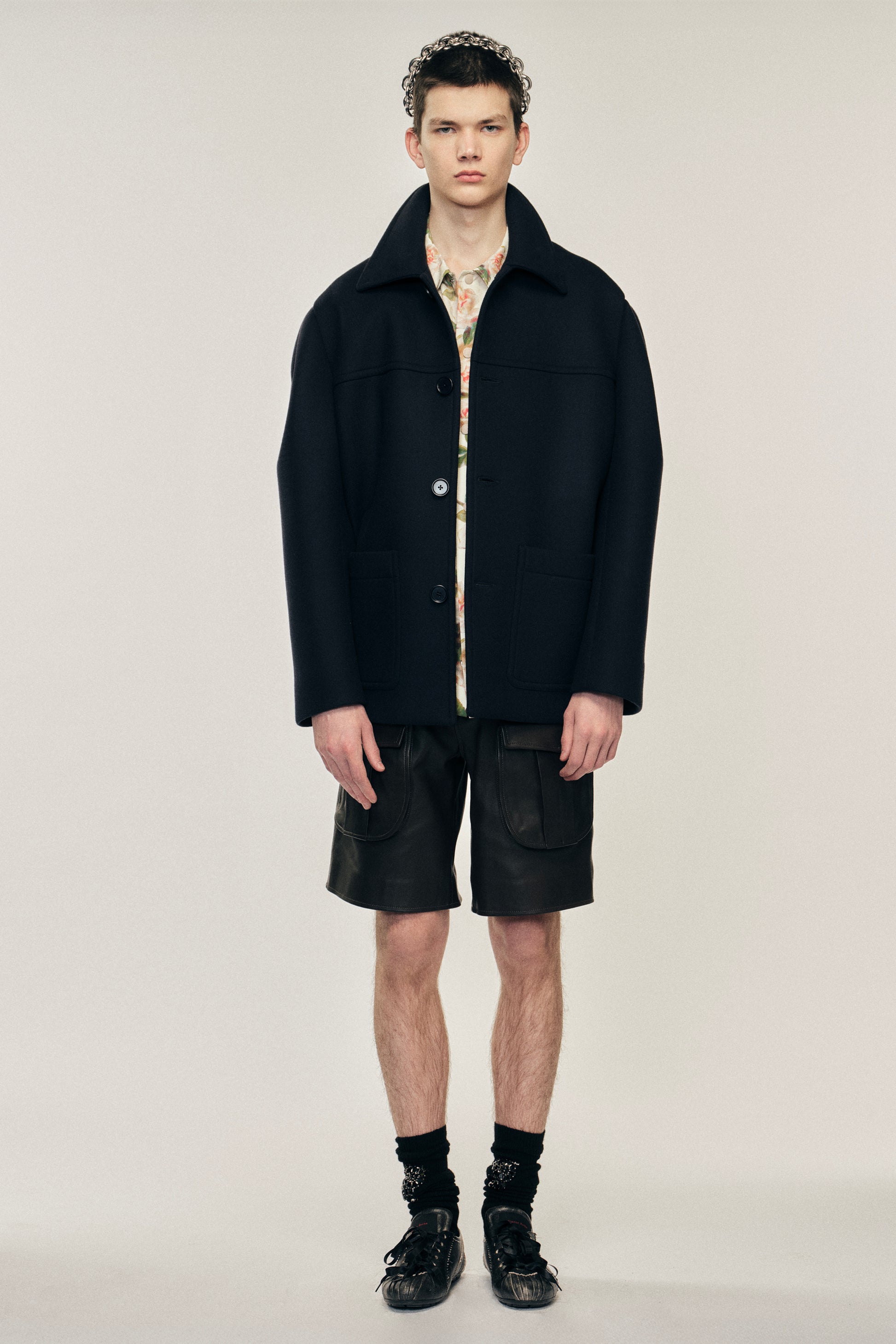 Inspired by a donkey jacket, this style is comprised of a structured bonded wool. It features a subtle puff sleeve for more volume, the perfect combination of a workwear silhouette with a signature Simone Rocha detail. The model is wearing this style with the Multi Pocket Cargo Shorts & Multi Pocket Snap Shirt.