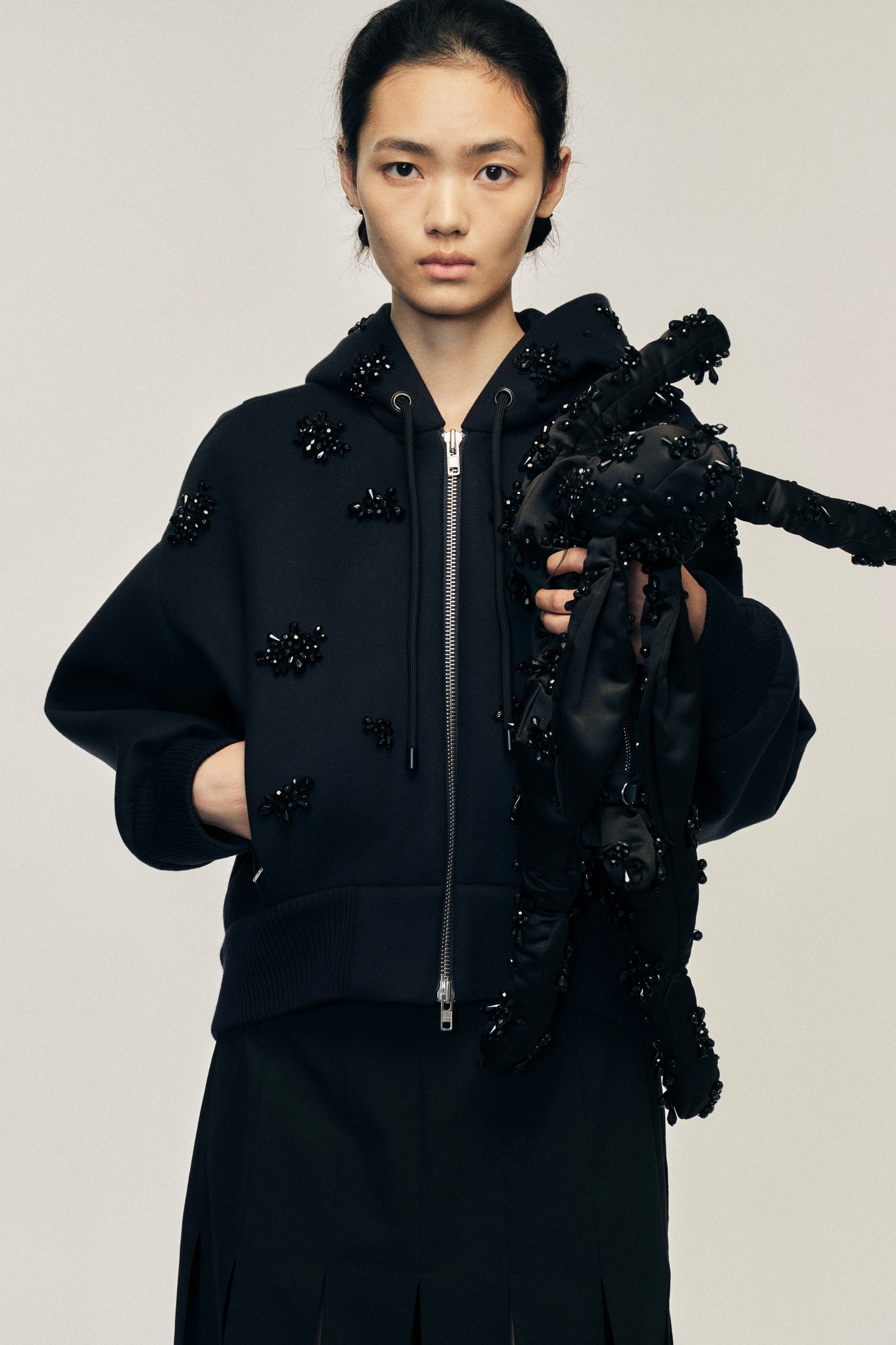 A navy hooded zip-up jacket featuring jet black embellishments scattered across the front and hood, creating a textured pattern. The jacket has a relaxed and slightly cropped fit, the hem and cuffs are ribbed for a bomber-like quality. The model is wearing this style with the Multi Slit Skirt.