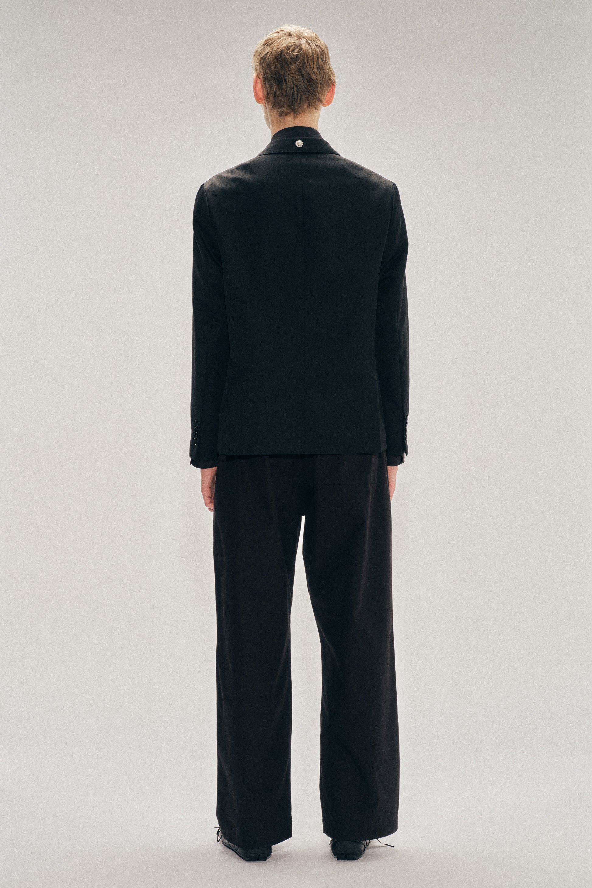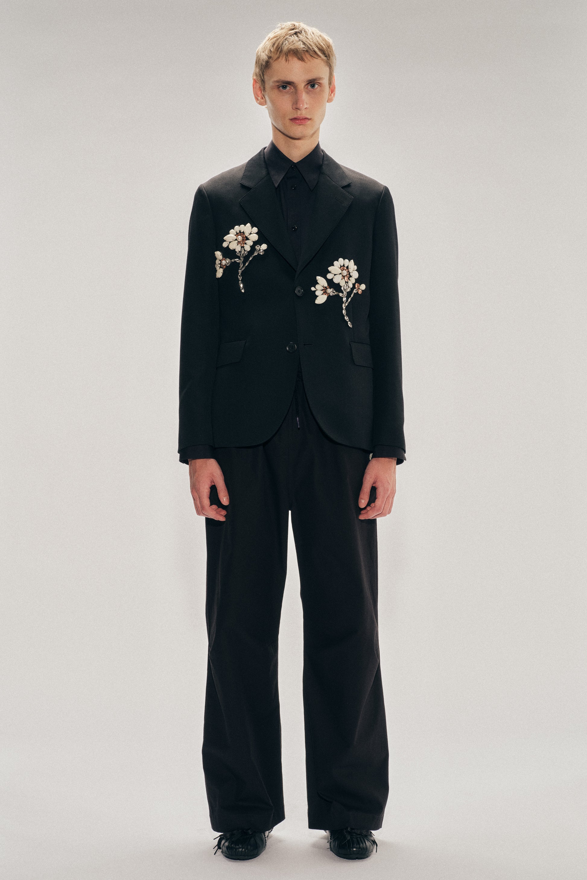 Venetian wool tailored jacket, a cornerstone of the Simone Rocha menswear wardrobe. Seasonal large crystal and opaque beaded florets placed thoughtfully on each side.