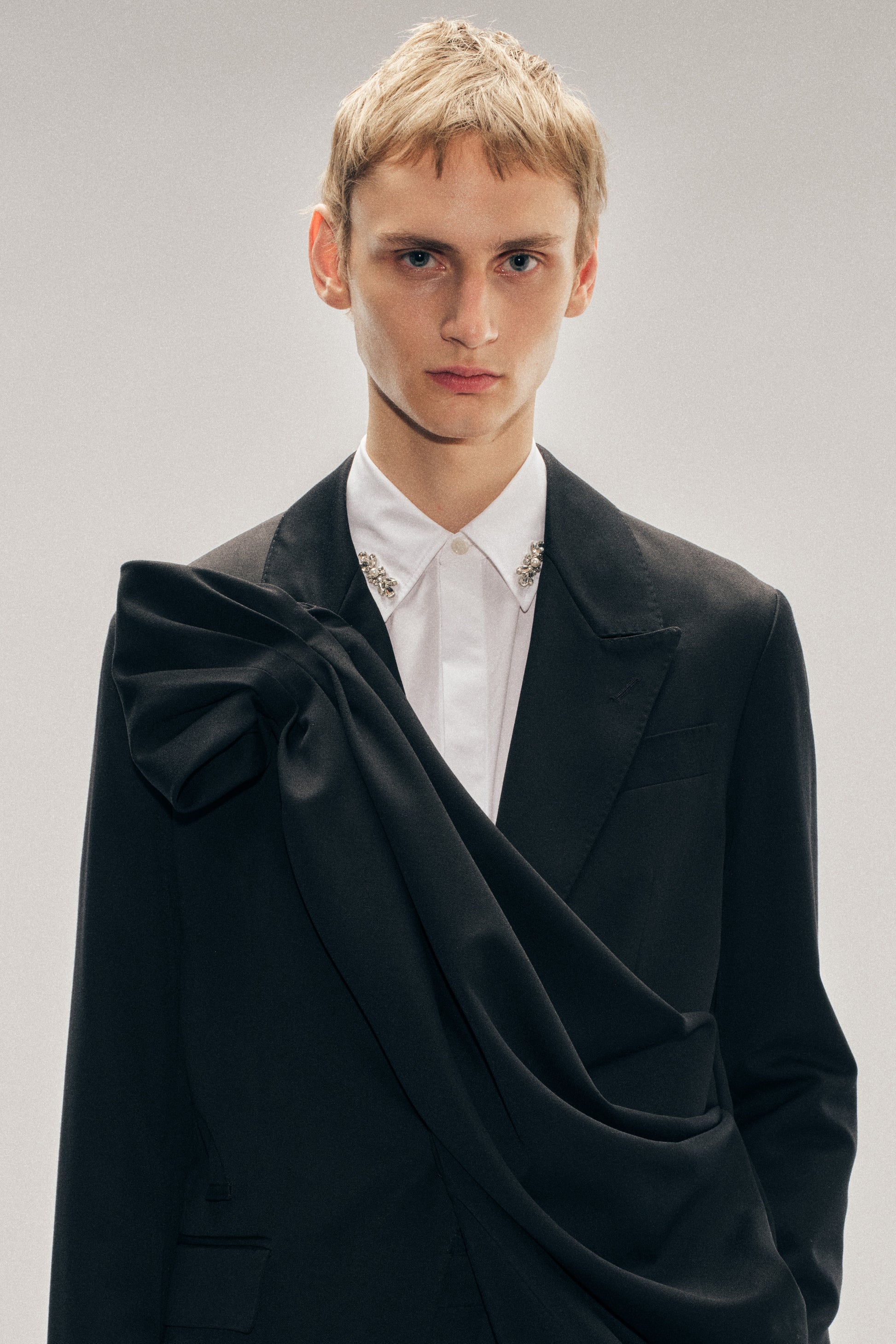 Venetian wool tailored jacket with draped flower sash. Secured to the lapel with a discreet hook and clasp, the sash was seen on the runway accommodating living blooms.