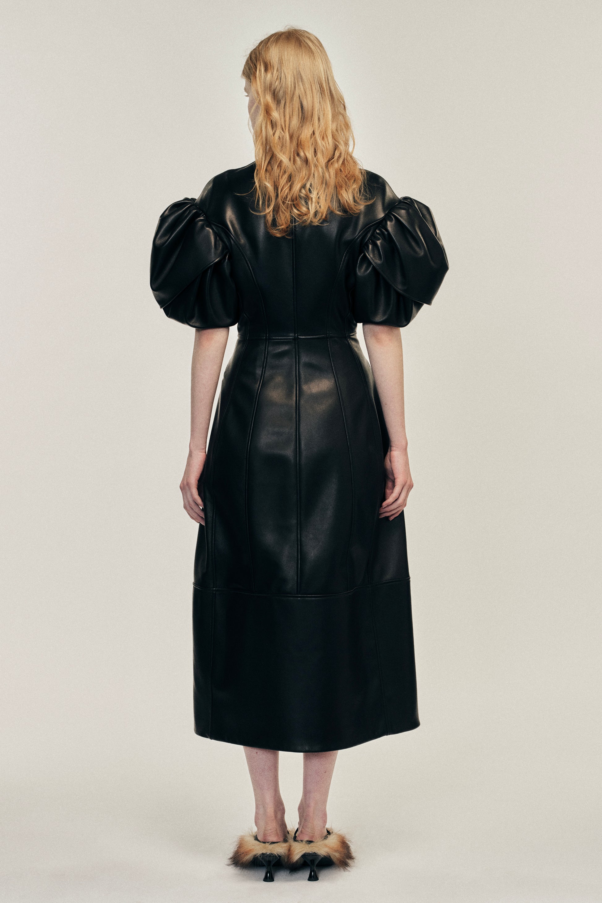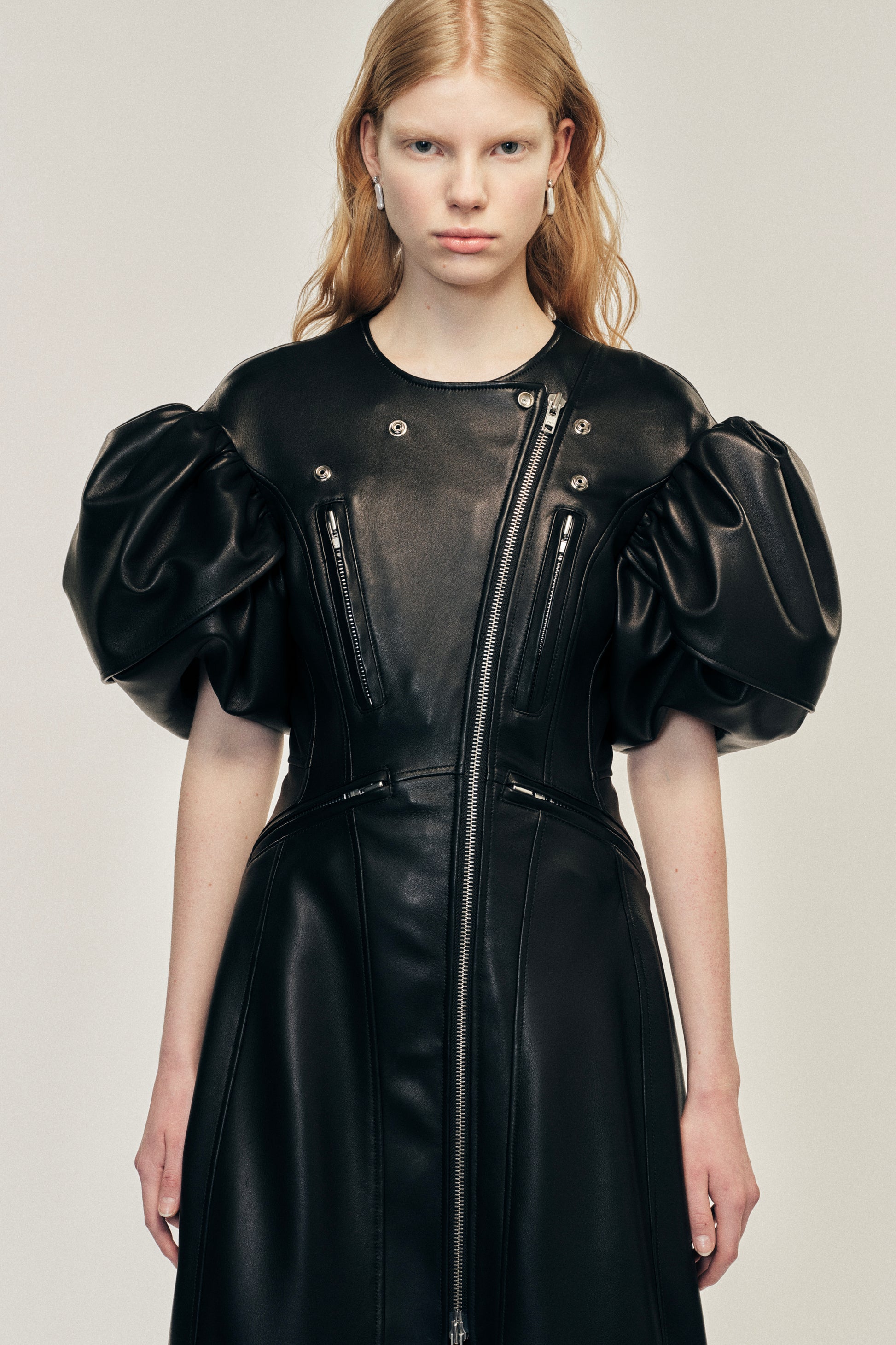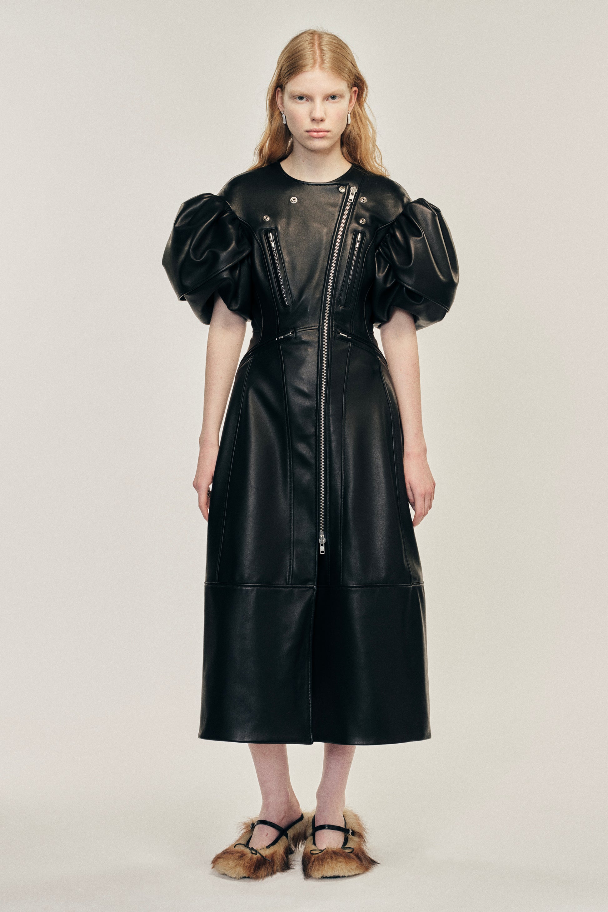 A black leather sculpted mid-length dress with a biker jacket inspired construction. It features silver zip hardware throughout for contrast. This style has the brand's signature double layered puff sleeve, inspired by flower petals.