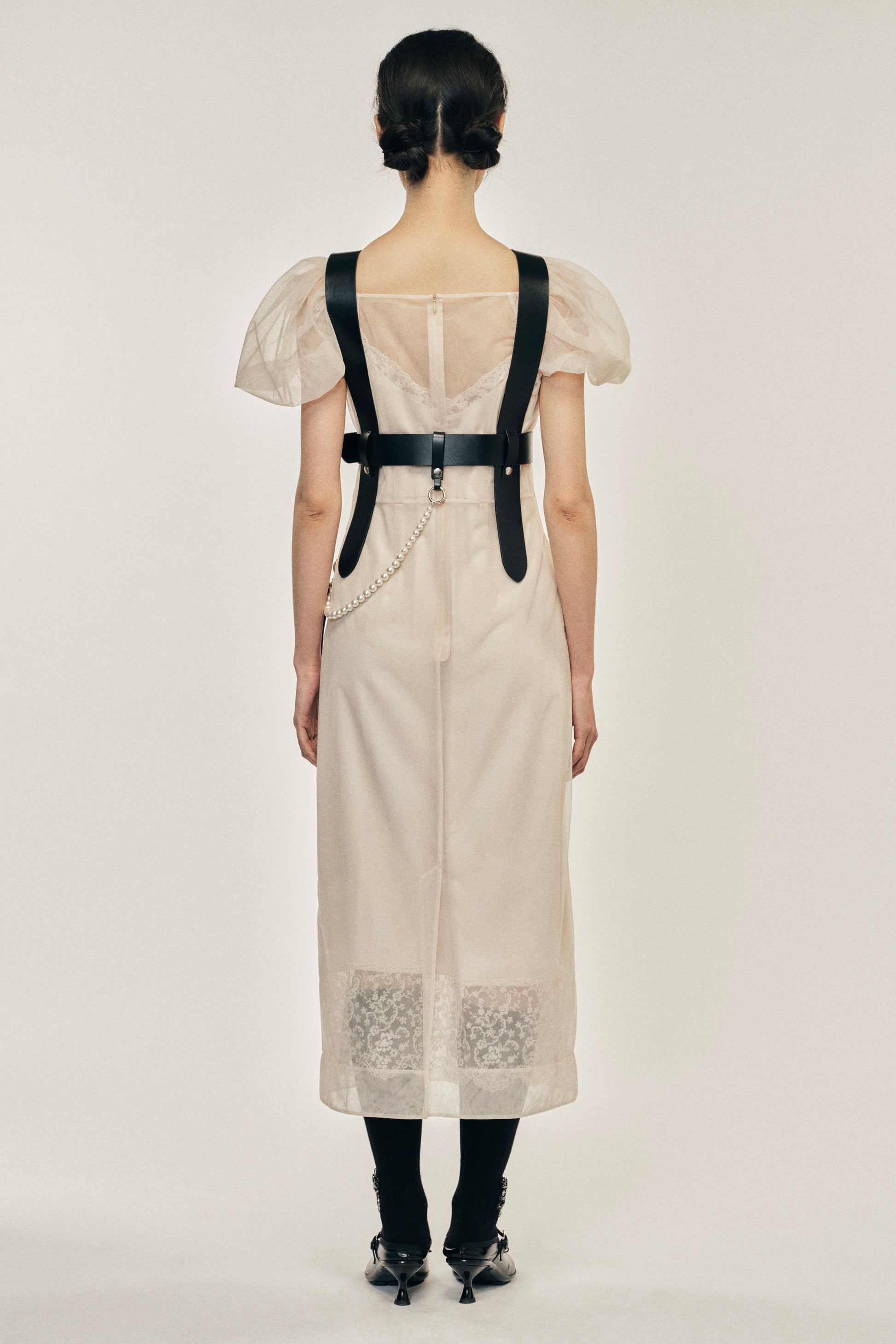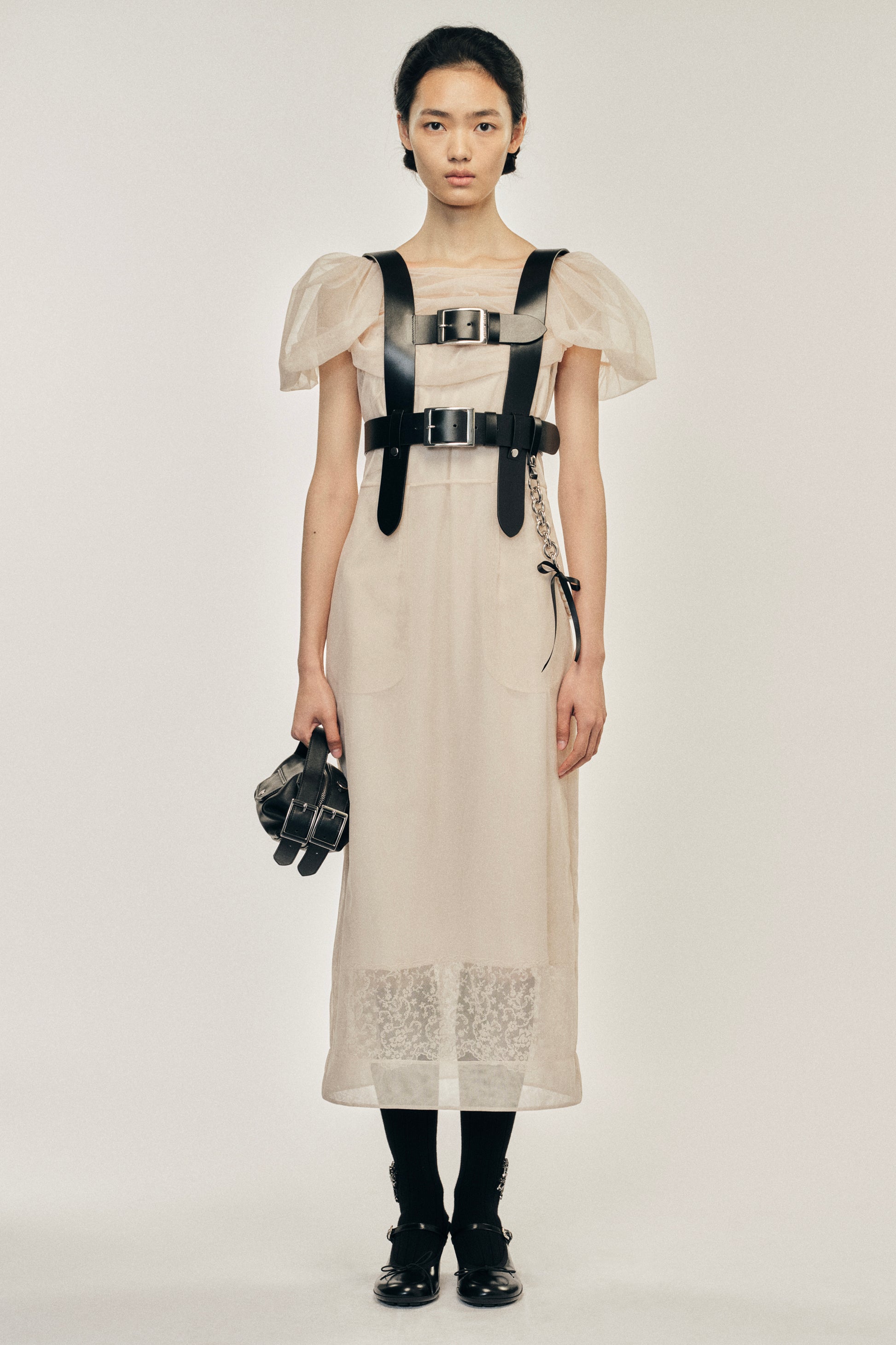 This sheer nude tulle dress has a layered construction where it is gathered at the bust and features a layered puff sleeve. On the runway, it is styled with the Pearl Chain Leather Harness.