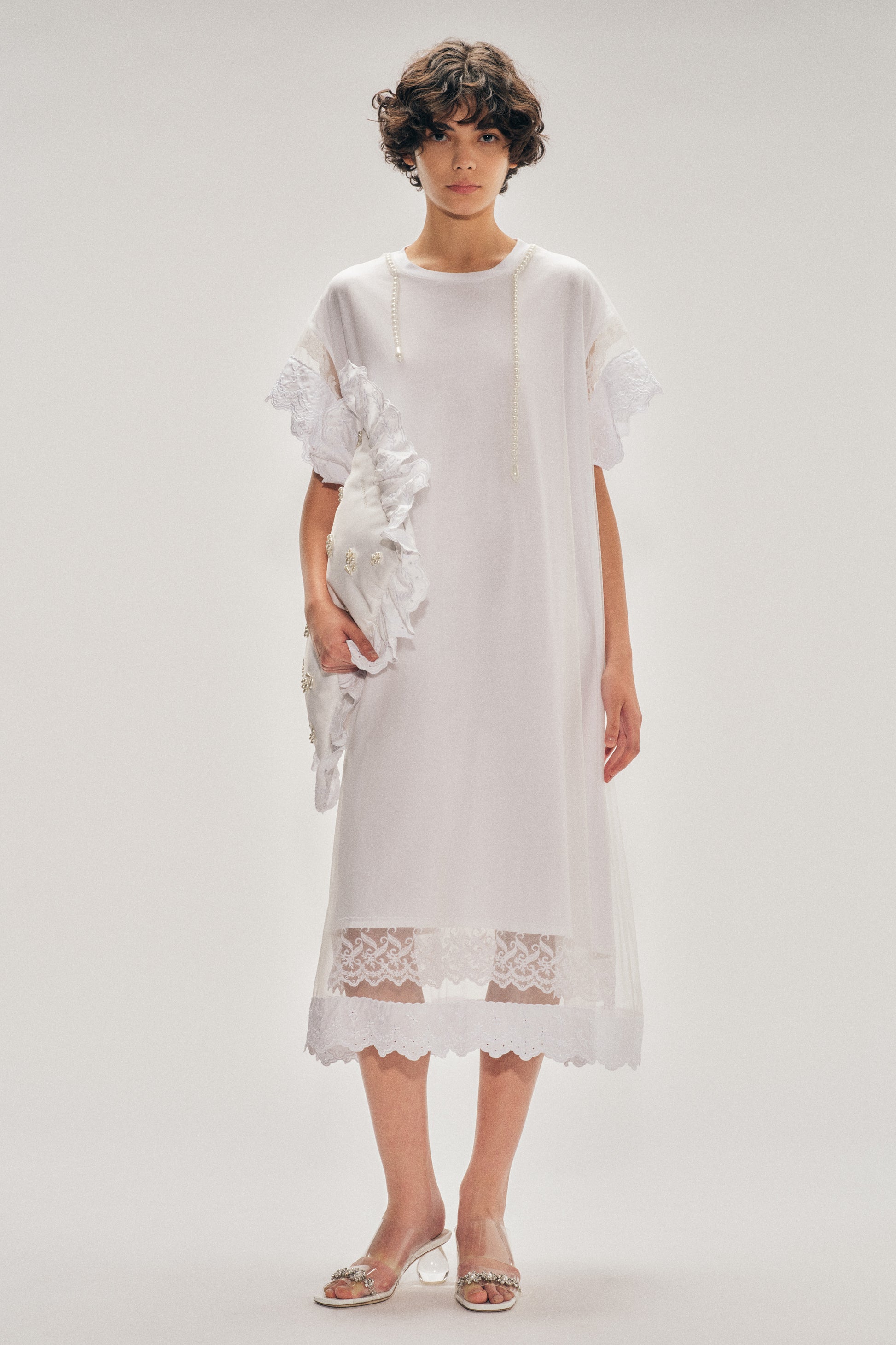Our signature jersey T-shirt dress layered in fine tulle, finished with dual trims of floral lace and broderie anglaise. This season's broken faux-pearl necklace detail drapes from the shoulders as a soft touch.