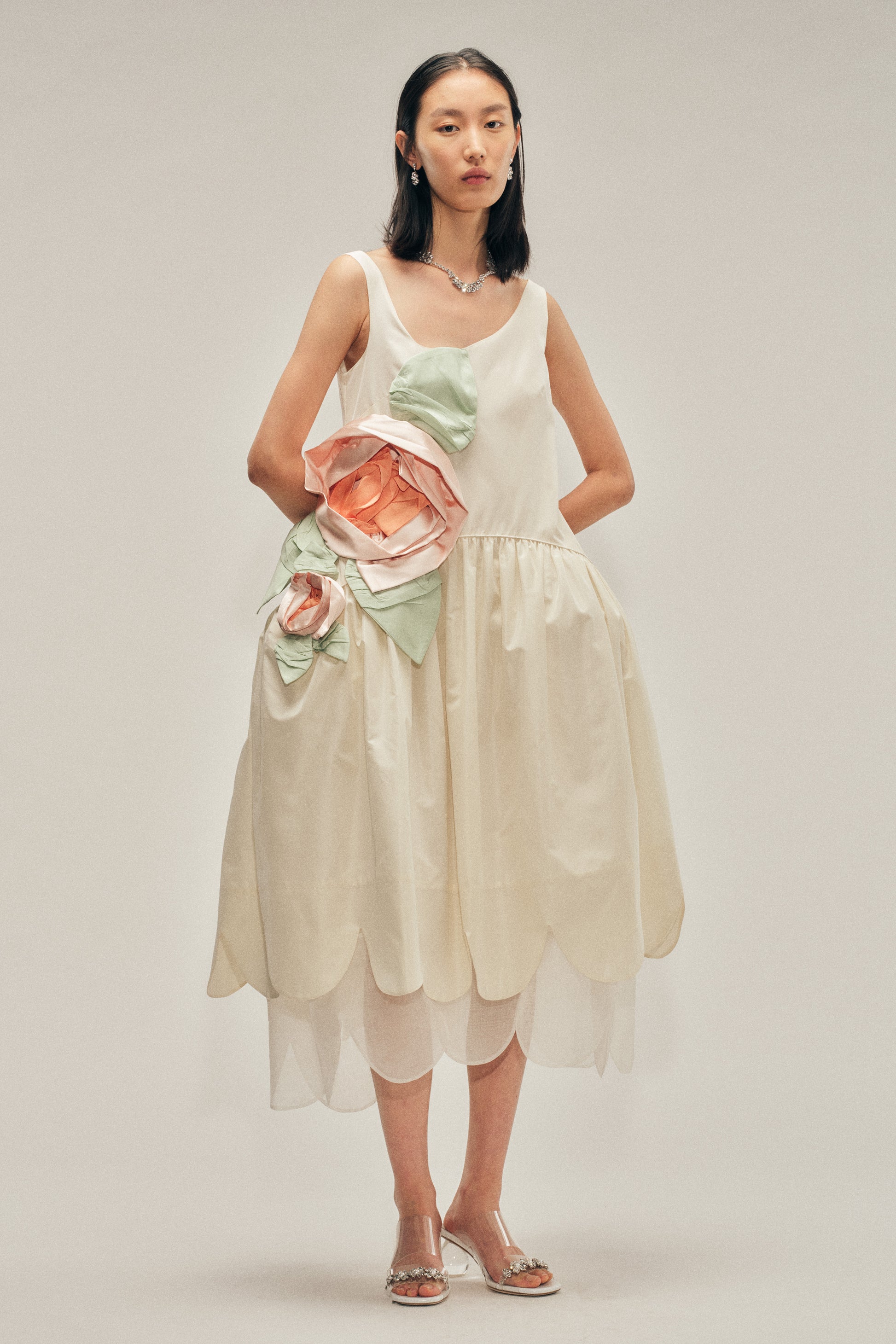 Taffeta dress with tilted neckline and voluminous scalloped hem. An oversize rosette appliqué adorns the waist, boldly capturing the season's spirit of playful excess.