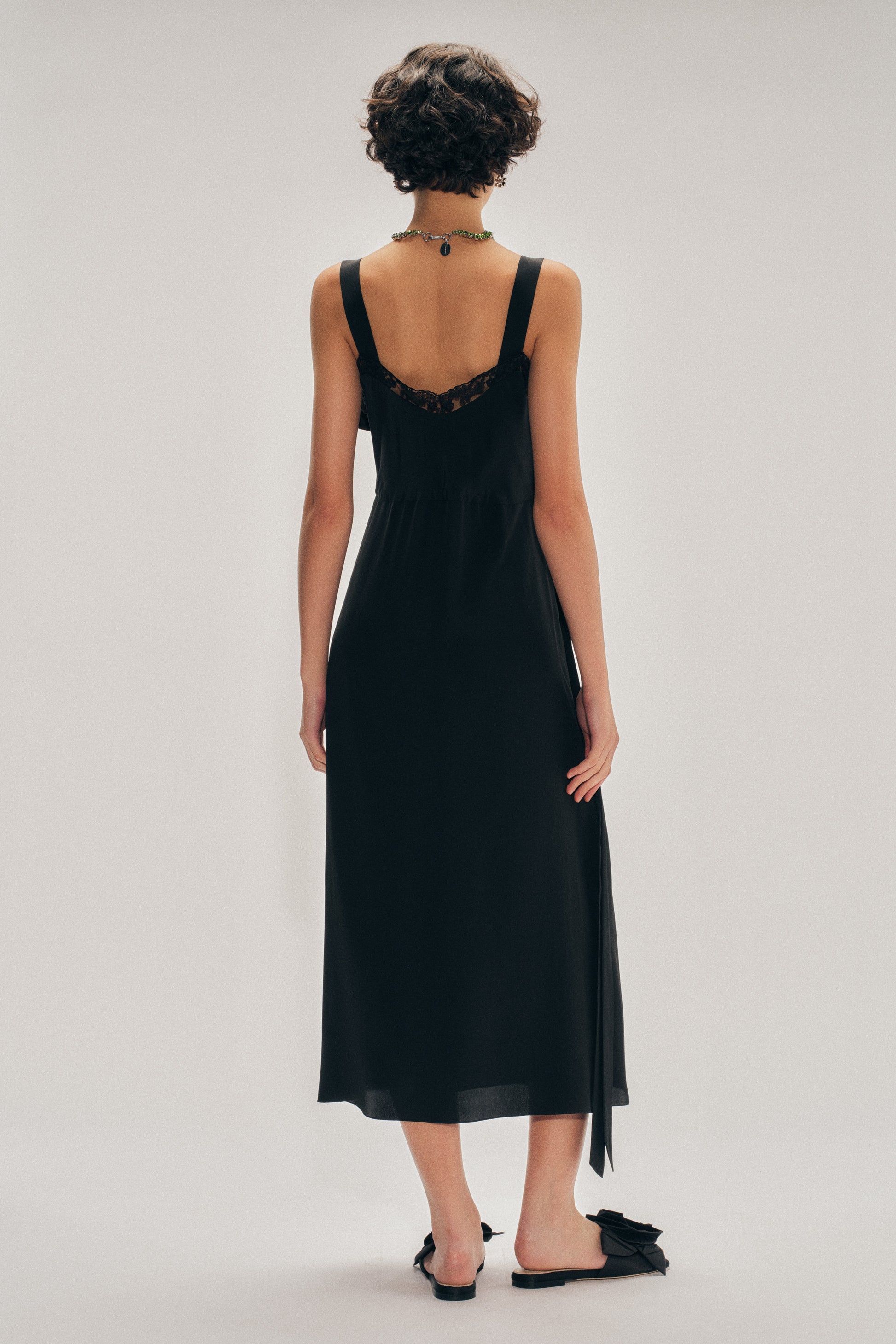 Slip dress crafted in fine crepe de chine with a lace-trimmed neckline. A bow ribbon sash is pinned across the bust, left to trail languidly at the side.