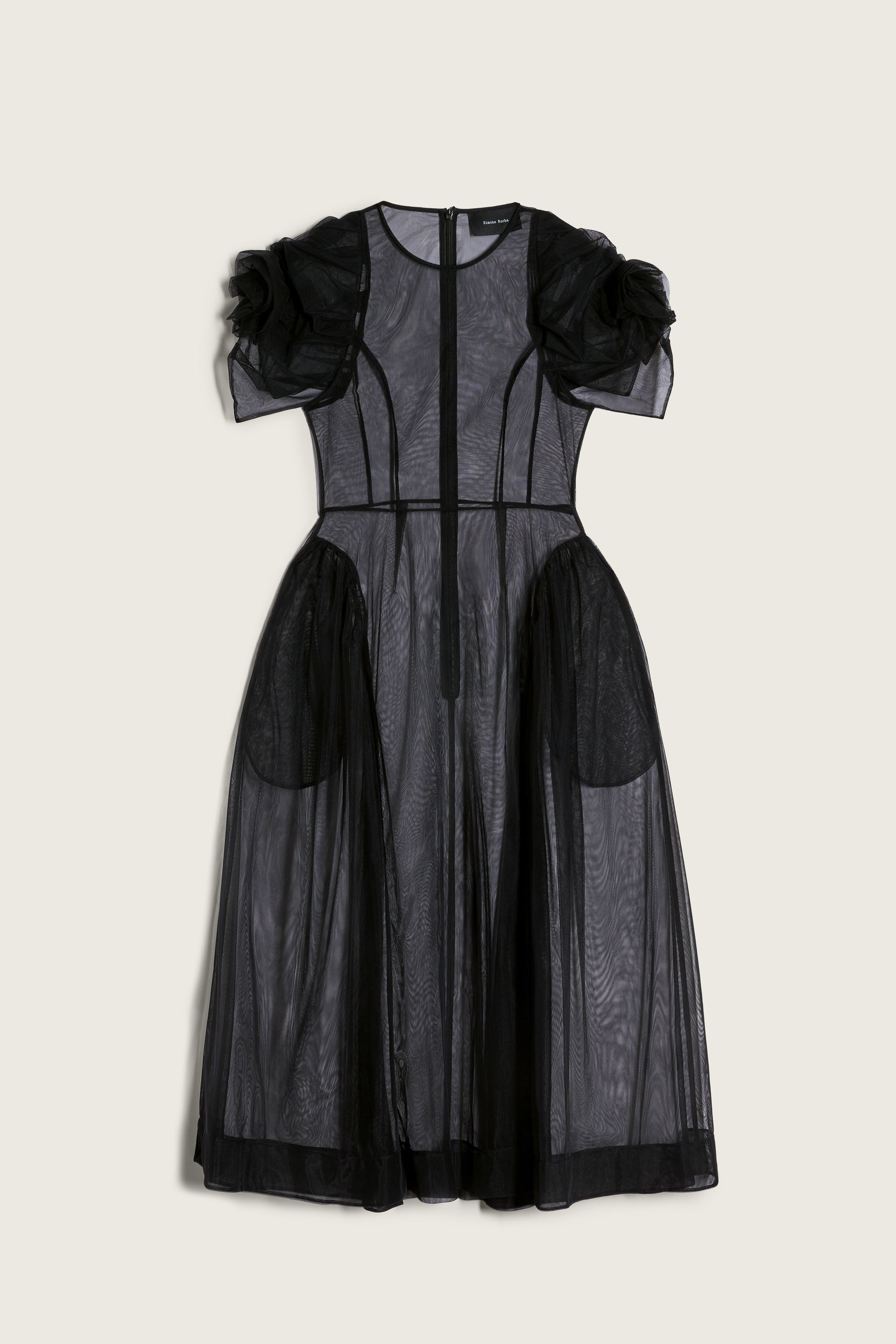 Sheer tulle dress with a fitted bodice opening to a voluminous skirt with integrated side seam pockets. The puffed petal sleeves are accented with rosette appliqués for a sculptural, romantic finish. Wear with the Lace Trim Slip Dress layered beneath.