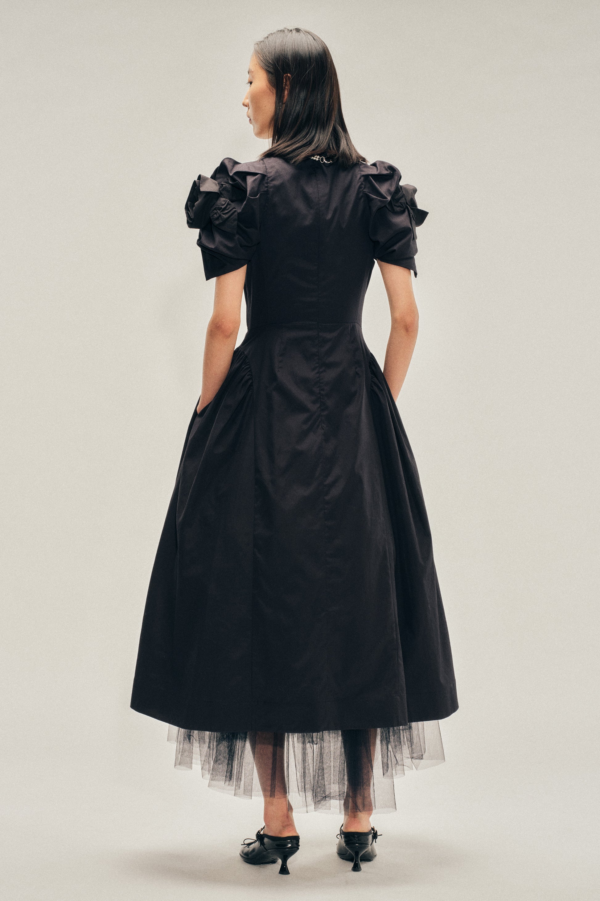 Cotton poplin dress with a fitted bodice opening into a voluminous bustled skirt with integrated side seam pockets. The puffed petal sleeves are accented with rosette appliqués for a sculptural, romantic finish.