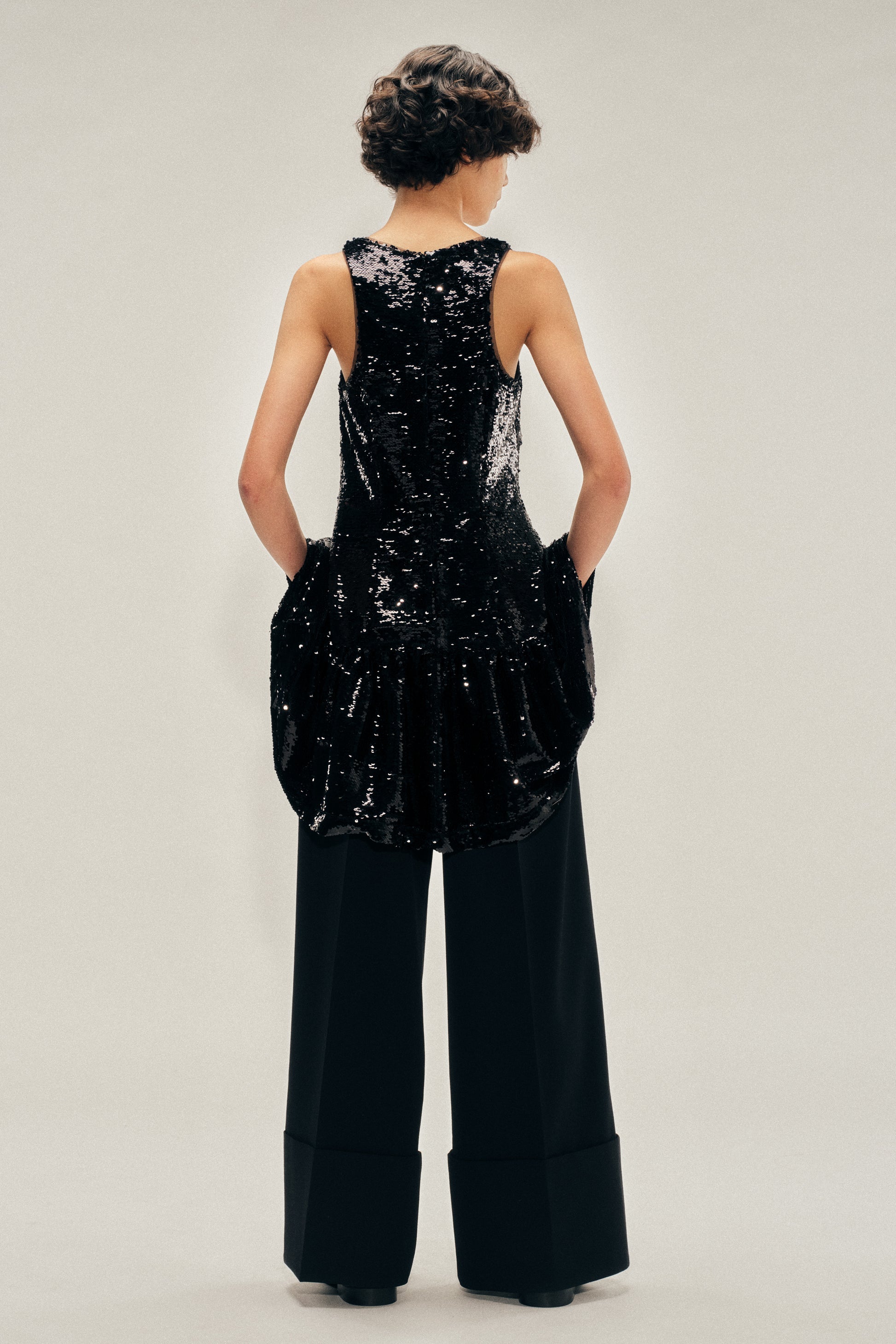 Mini tank dress encrusted in black sequins, featuring a gathered peplum hem at the waist. Rear darts taper the silhouette, capturing the collection's youthful spirit with a sculpted finish.