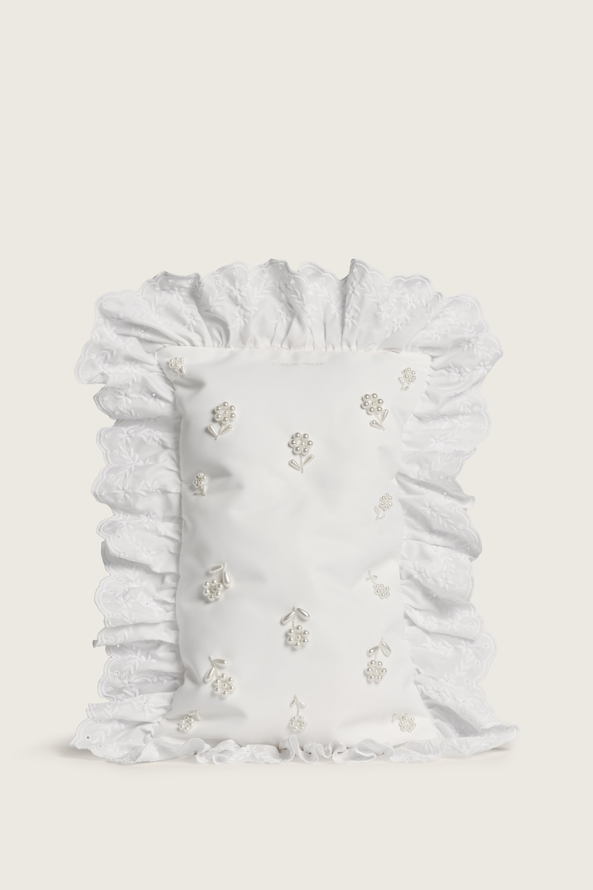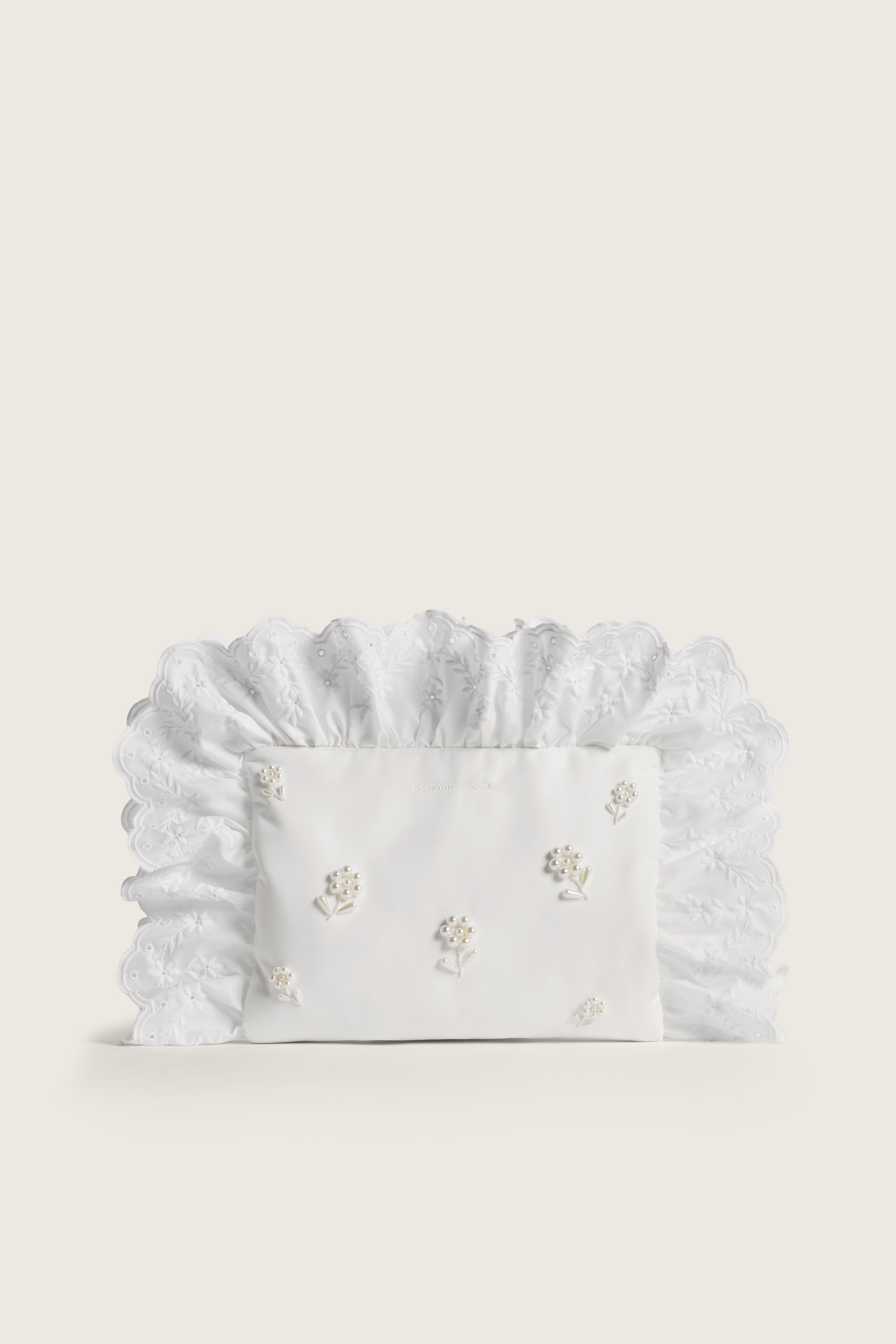 An oversize clutch bag crafted in padded nylon, featuring embroidered trims reminiscent of traditional pillowcases. Secures with a magnetic snap to one side.