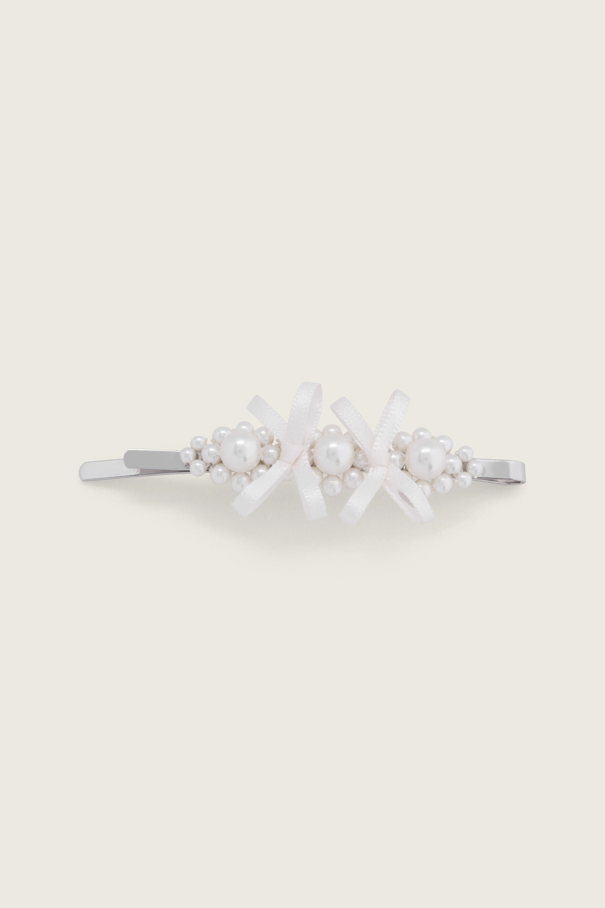 Simone Rocha’s classic pearl hair clip is playfully updated with petite bows.