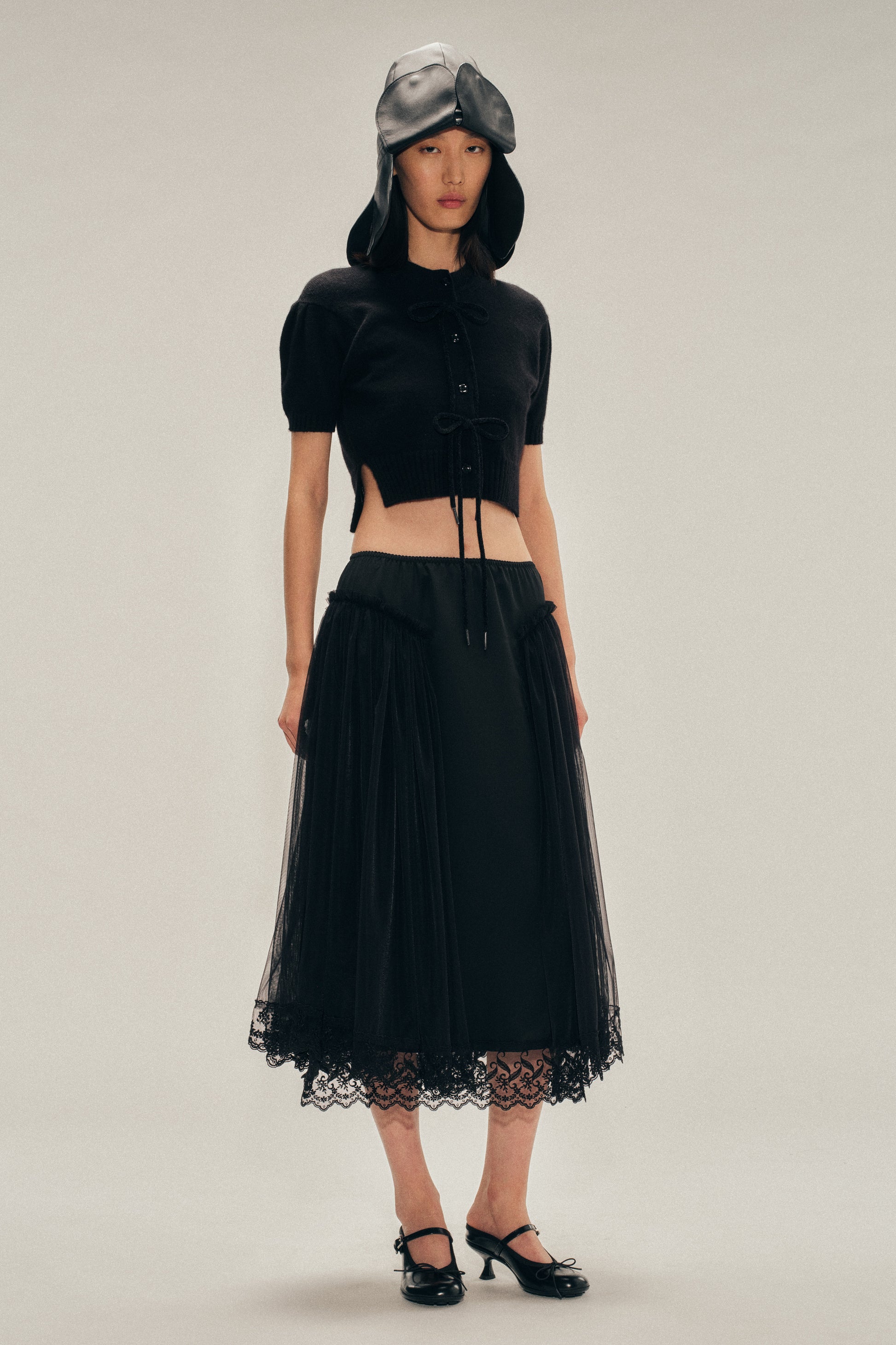 Cropped cashmere cardigan with puffy short sleeves and ribbed hems. Decorated with chenille fuzzy cord bow loops that echo the collection’s whimsical spirit.