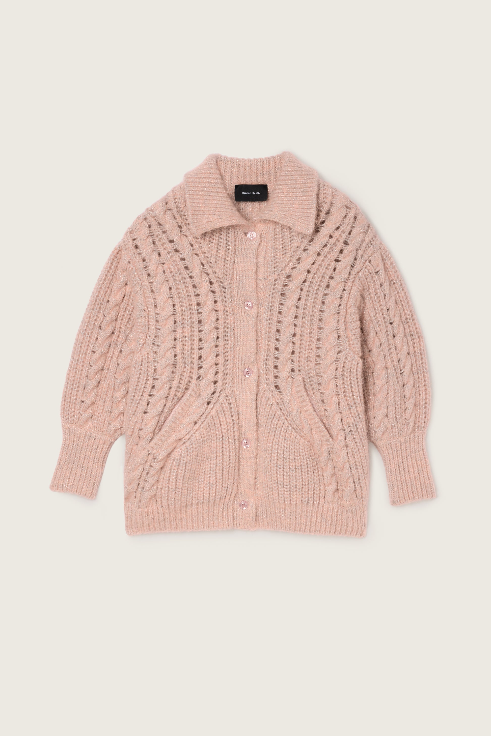 A collared cardigan knit from a chunky alpaca blend yarn with integrated tinsel, it features a sculpted shape with front pockets. This versatile piece can also be worn as a light jacket.