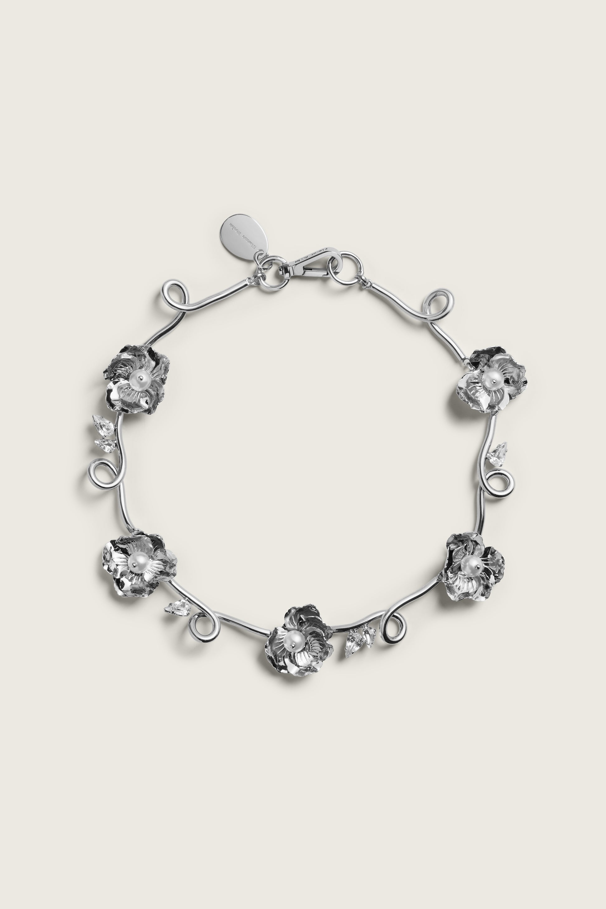 A statement necklace, rhodium plated poppy flowers are linked by stem-like chains. Faux pearls are set within for a signature touch.